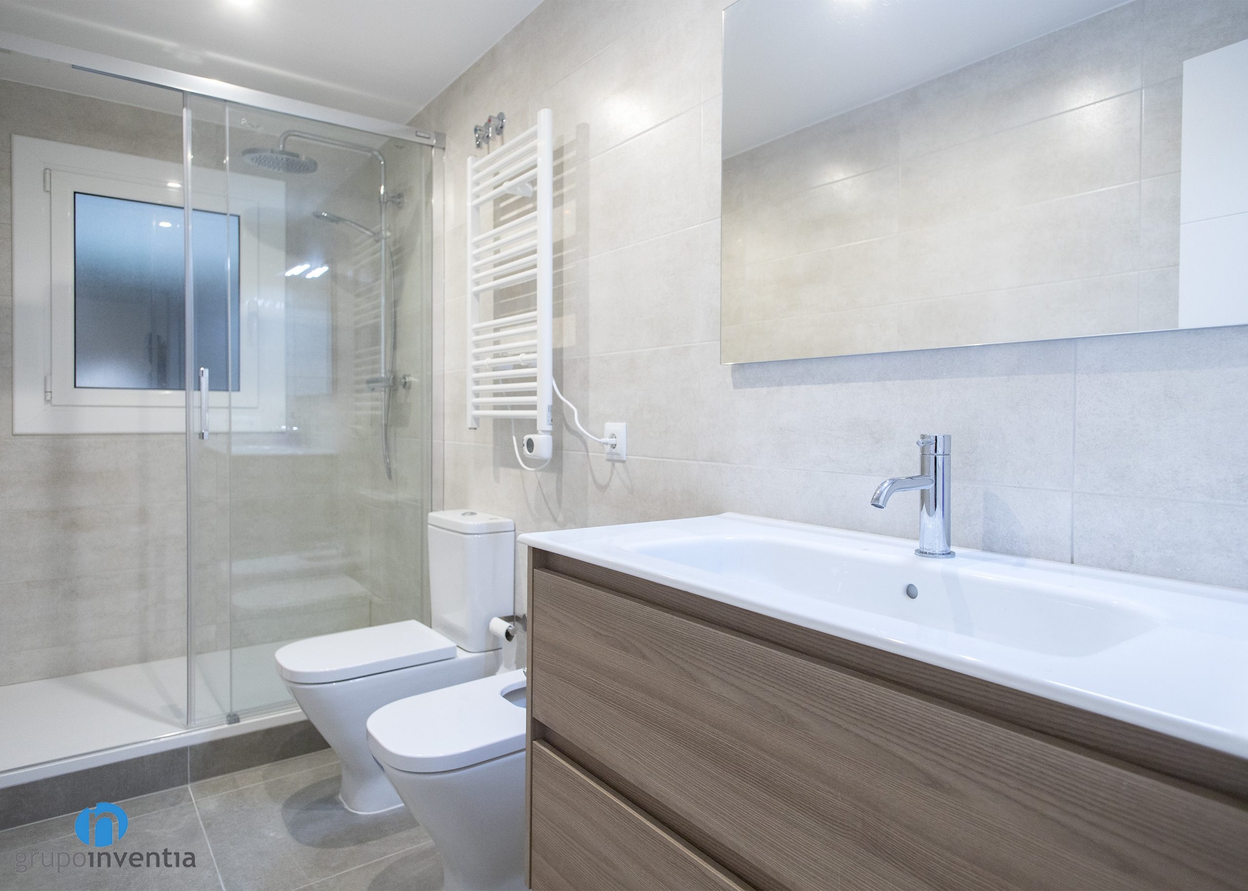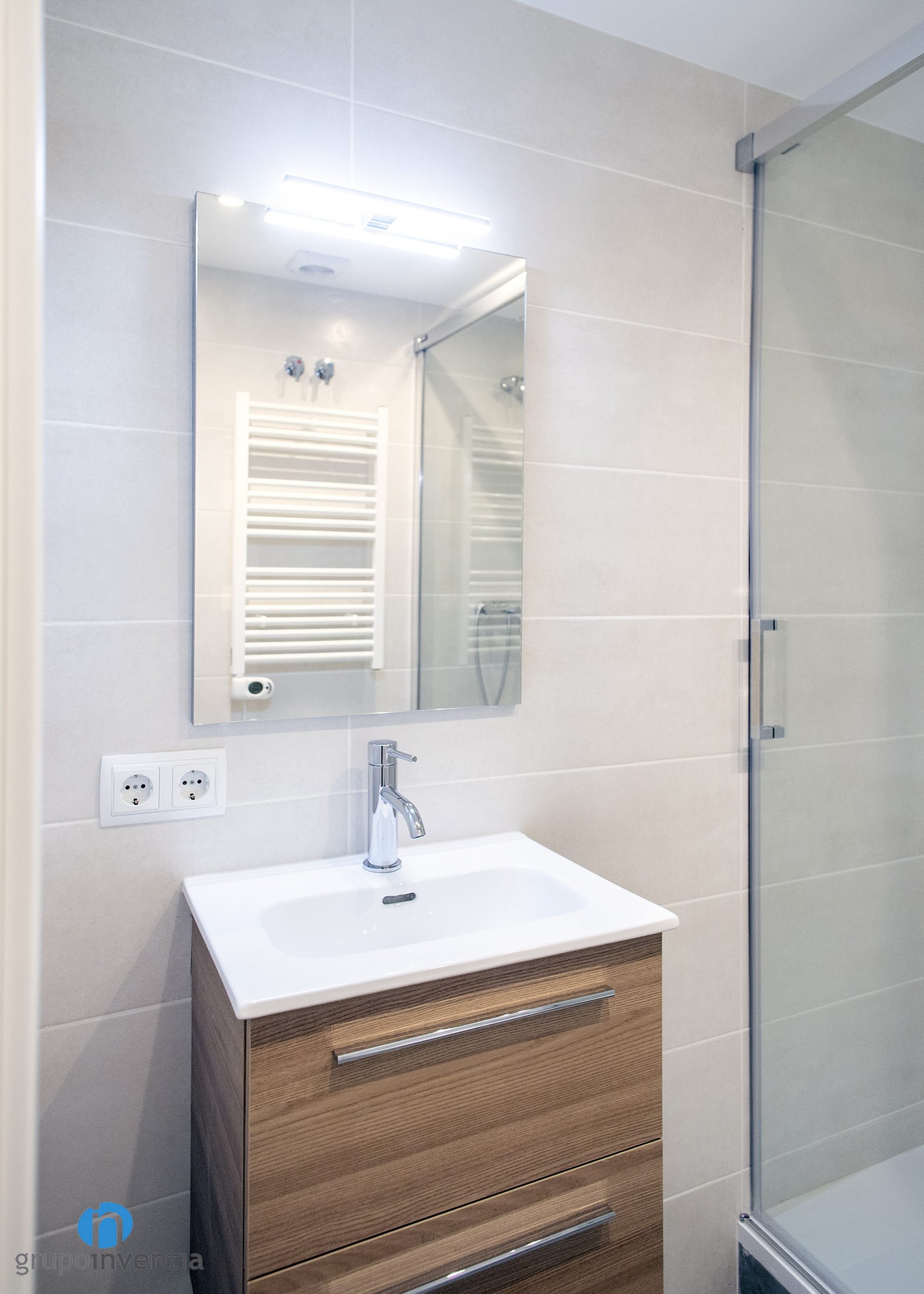 The house has two bathrooms that have been completely renovated. Both have used the same finishes to create the new image, achieving two bright and spacious spaces. In this bathroom renovation the walls have been tiled with beige tiles, a neutral shade that has allowed to introduce other finishes such as the wood of the bathroom furniture.