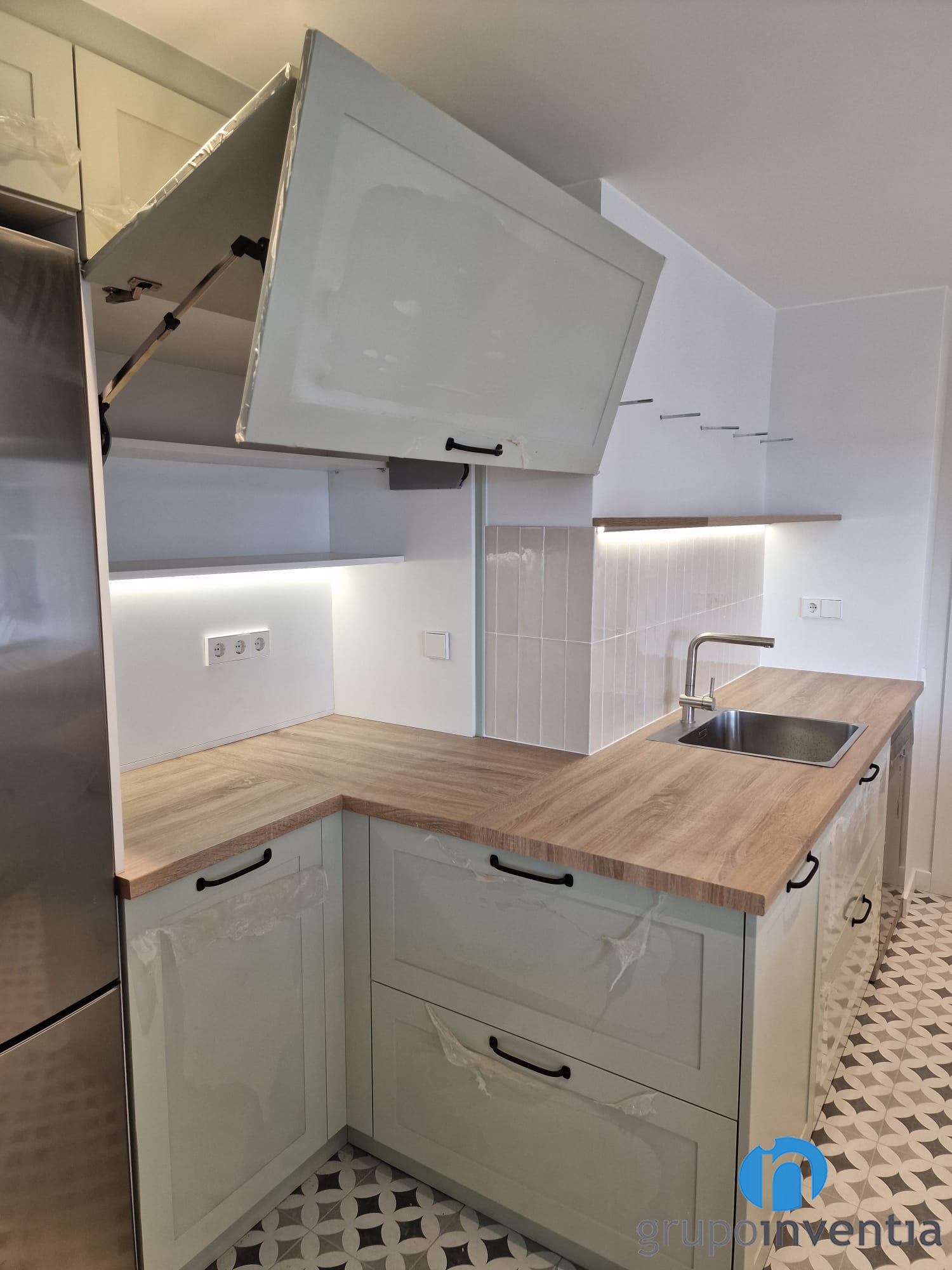 The new kitchen is open and has two fronts. The main furniture is distributed in a linear fashion, grouping the new kitchen equipment. It has a worktop that offers support and work surface. Also with a large sink and storage capacity in its lower and upper part.