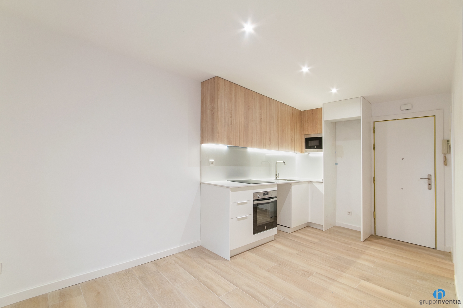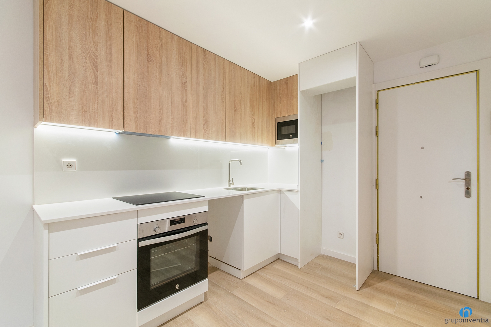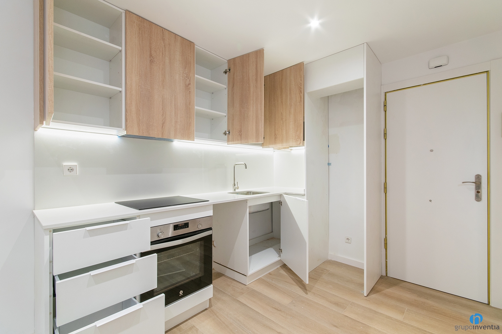 The worktop is spacious and equipped with a sink and an induction hob. The oven is integrated at the bottom, while the microwave at the top. A custom-made space has been created for the refrigerator on the right side of the kitchen. With this kitchen renovation, the flat has achieved a functional and ready-to-use space.