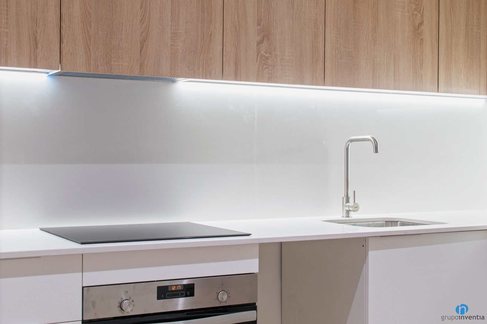 The new kitchen is open and is laid out in an L shape. In this way, it is possible to make the most of the available space and generate more mobility. The kitchen furniture offers a large storage capacity. Both in the lower and upper part there are drawers and cupboards, combining the white color and the wooden finishes.