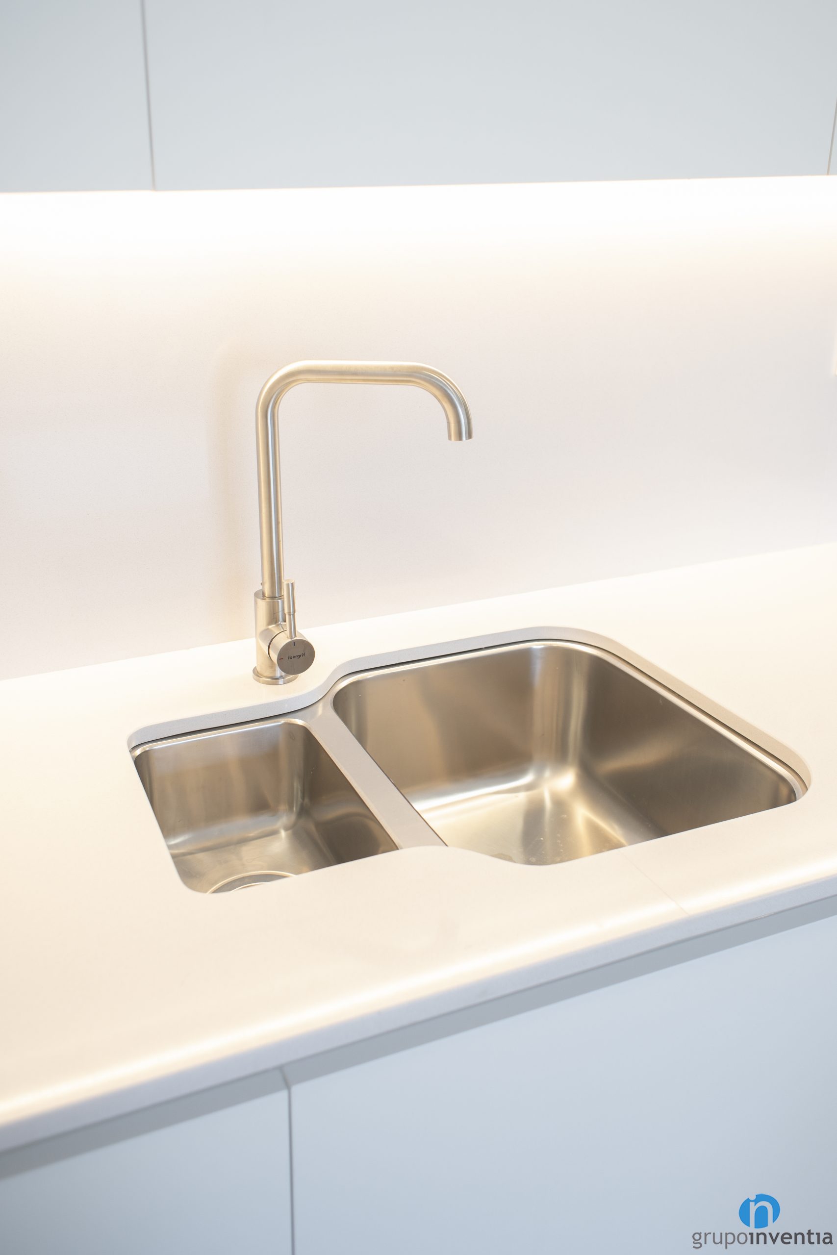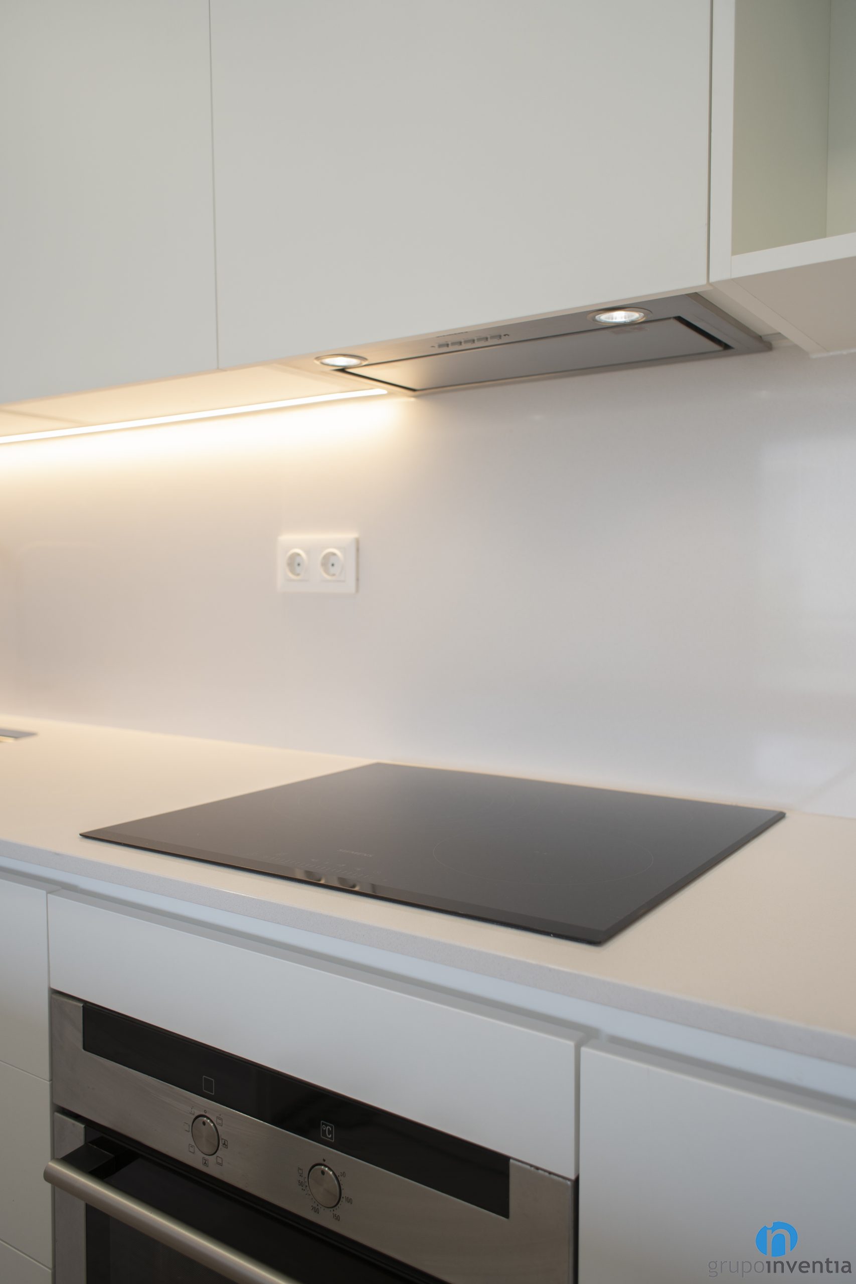 As for the kitchen itself, at the far right there is a hole made to measure to integrate the venera. Then the main worktop is born. It is elongated and we have installed the glass ceramic plate and the single sink. In addition, it has storage capacity both in its upper and lower areas, where we have integrated the oven.