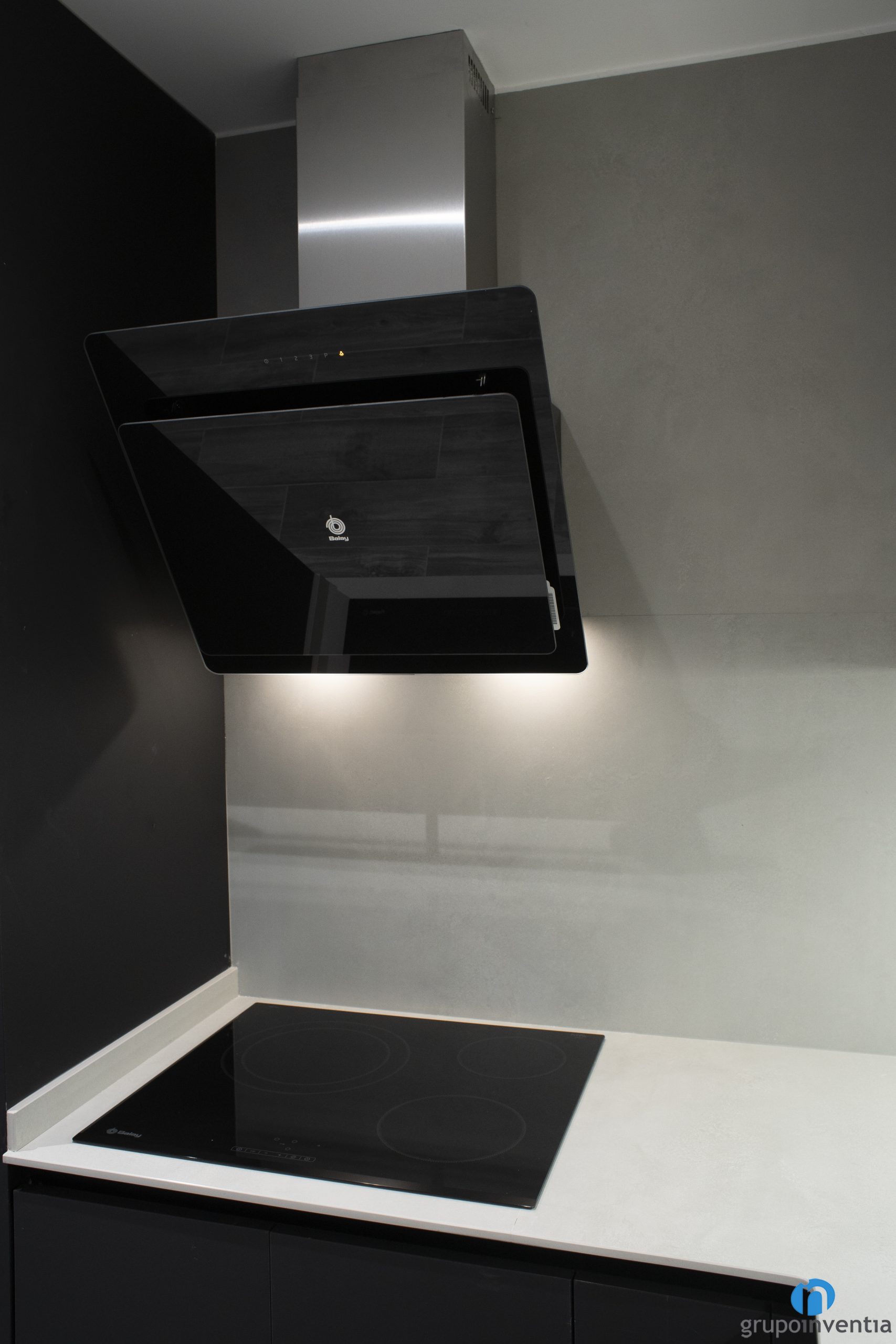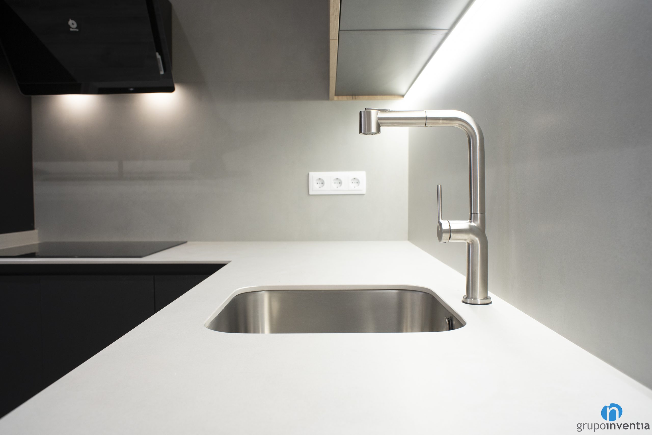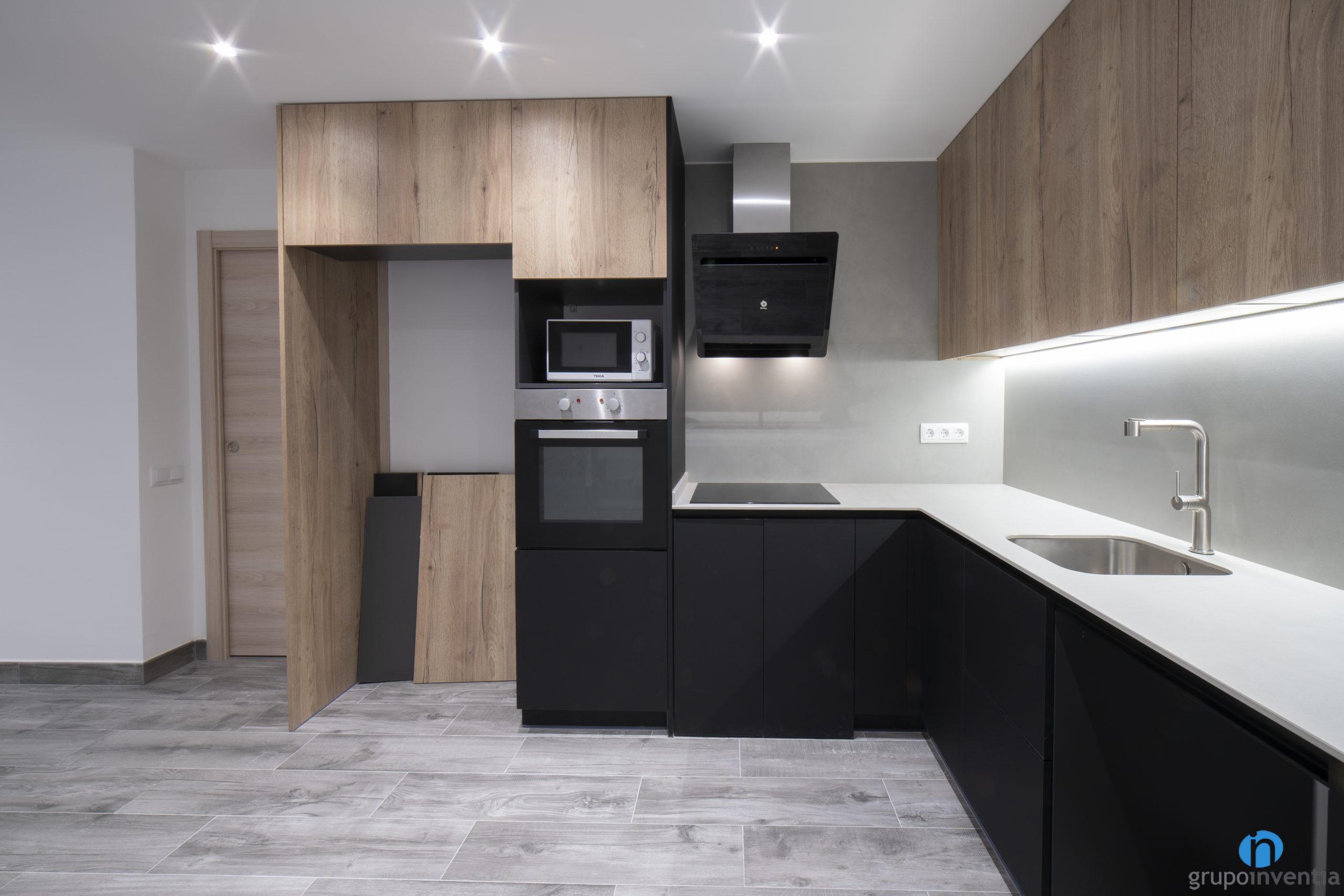 The two worktops in this kitchen renovation provide a large support and work surface. In this sense, it is a functional kitchen with excellent mobility. In addition, we have installed the sink and the ceramic hob on the countertops. The latter is accompanied by a design extractor hood, also finished in black.
