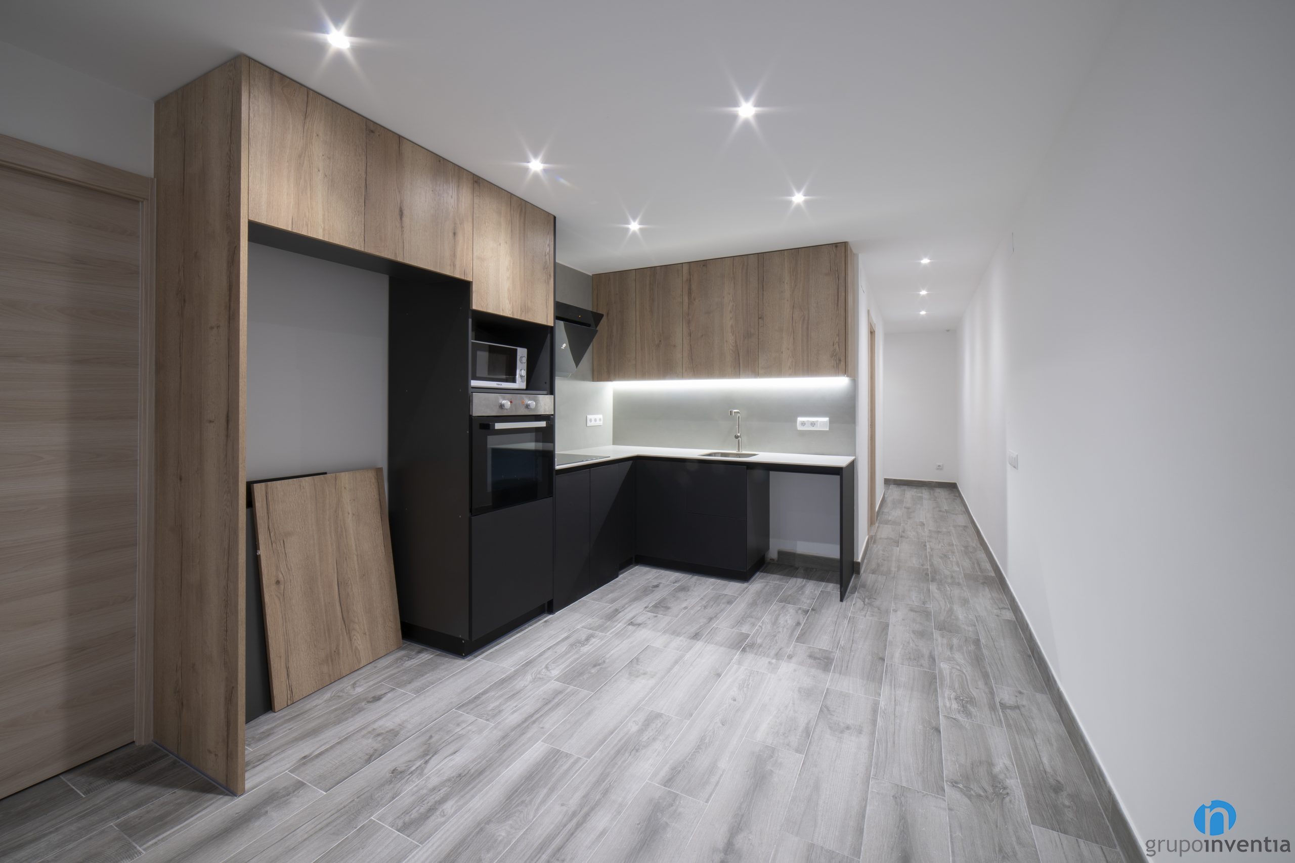 The kitchen on this floor is open and distributed in an L shape. The kitchen furniture combines the color black and the wooden finishes. It is an elegantly designed kitchen that has custom-made spaces to place the new appliances. At the far left you can place the fridge, the oven and the microwave.