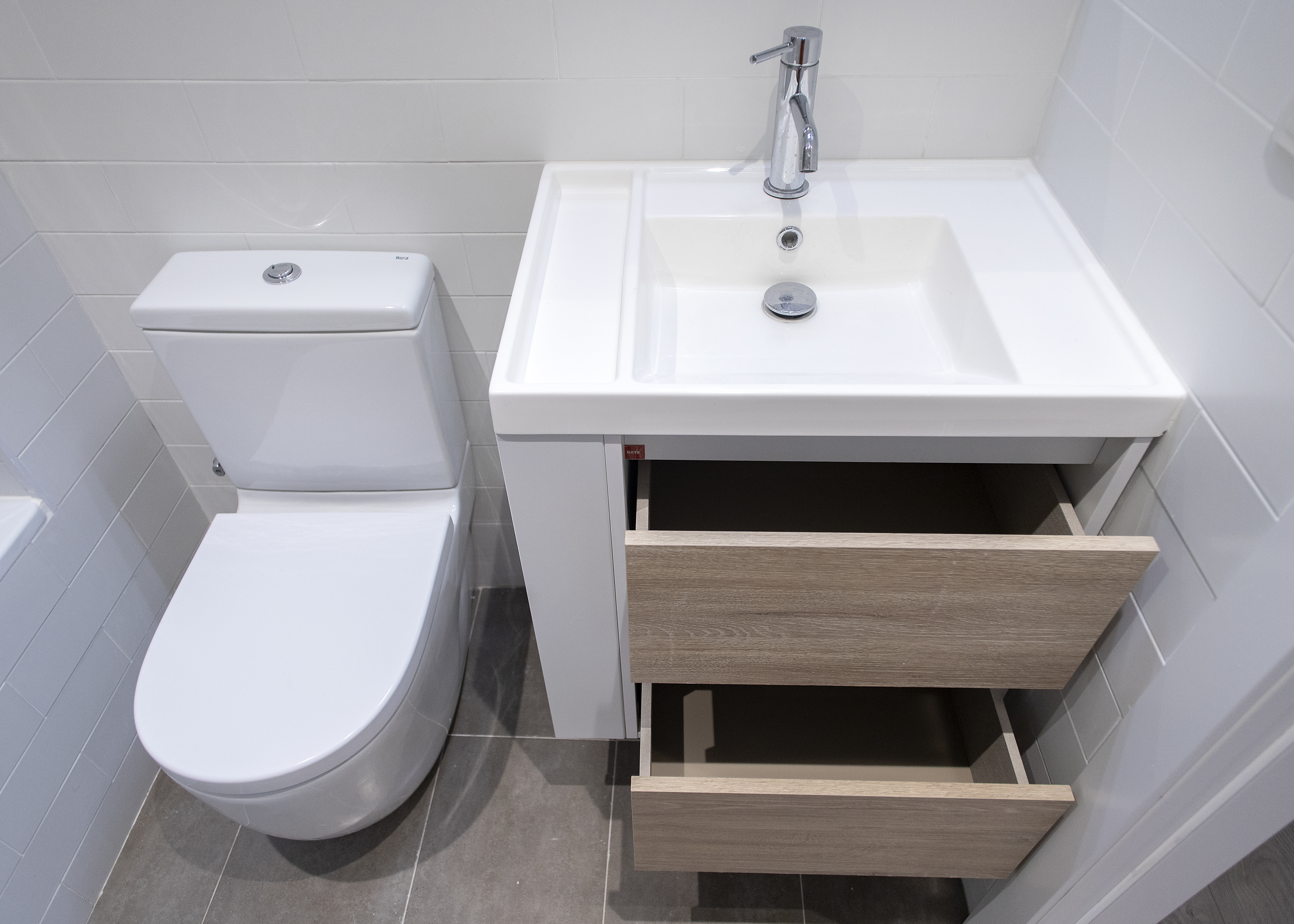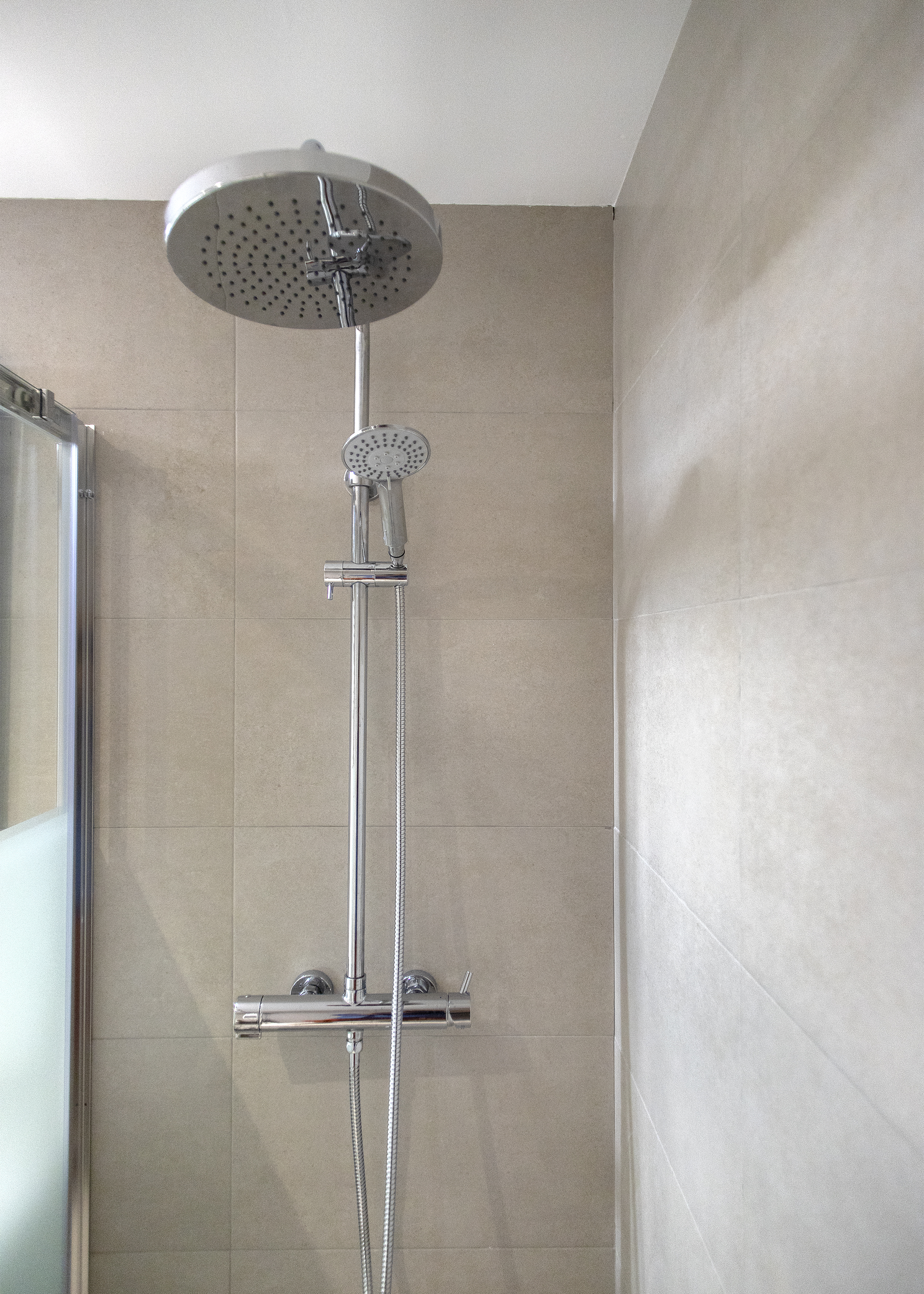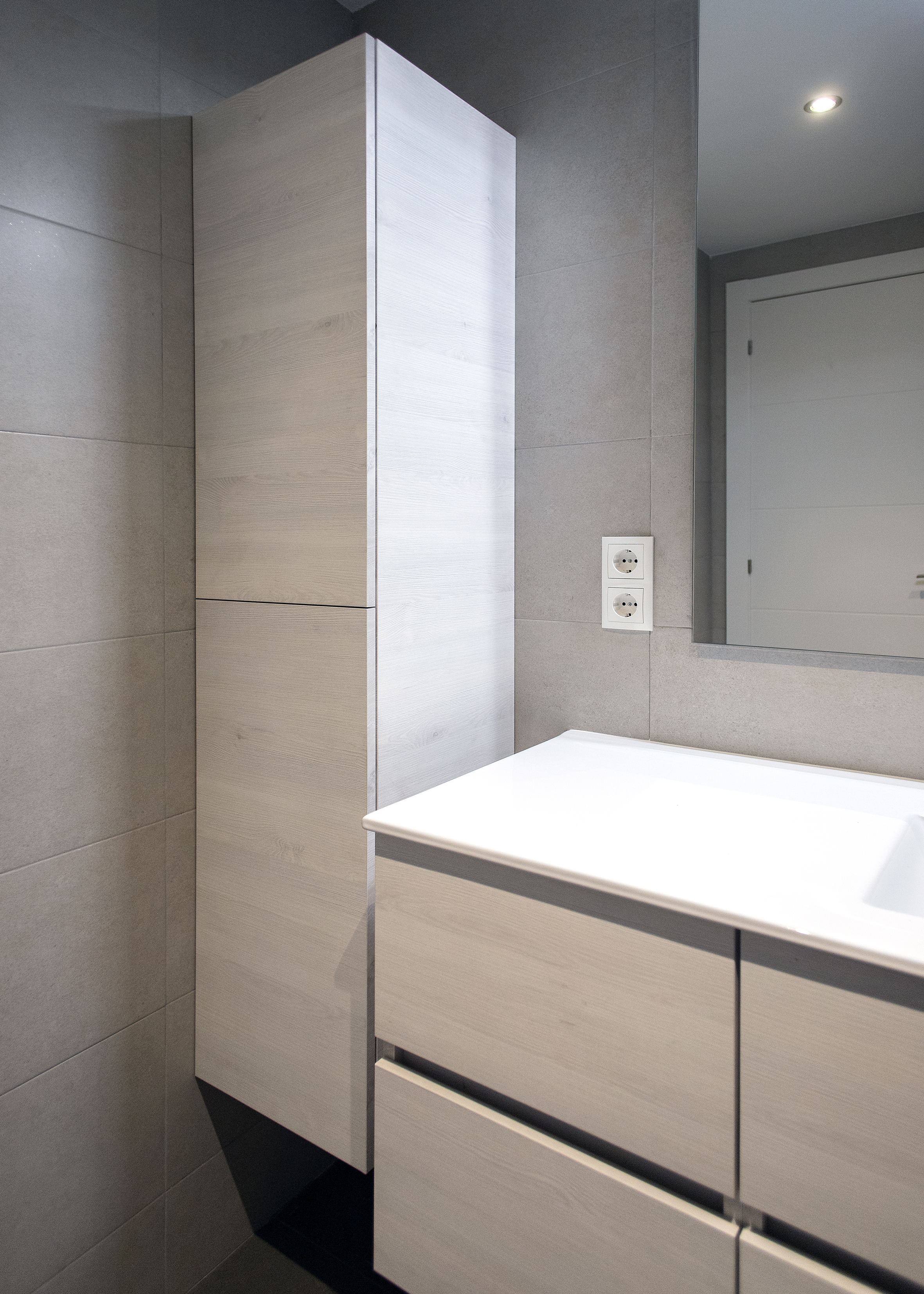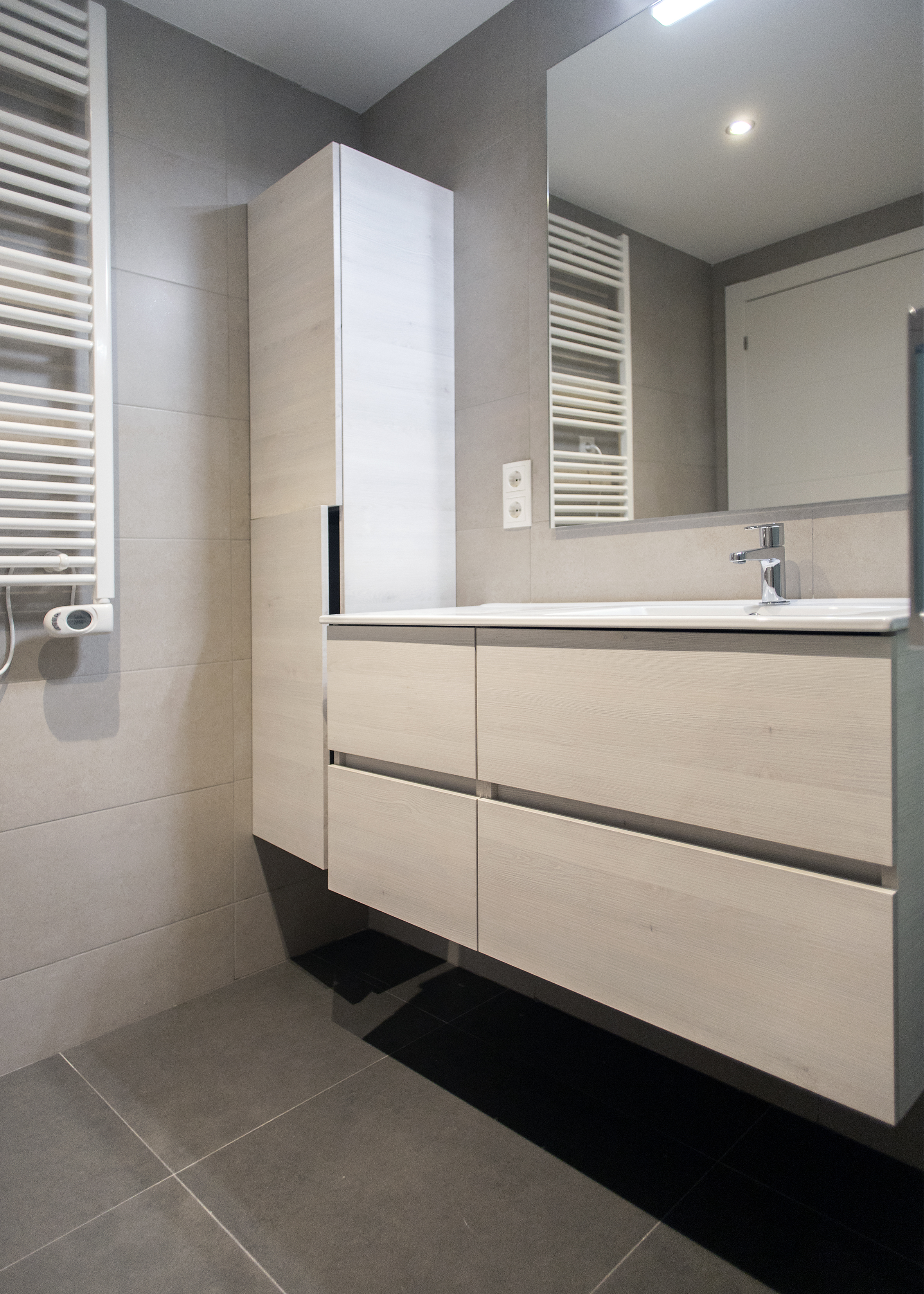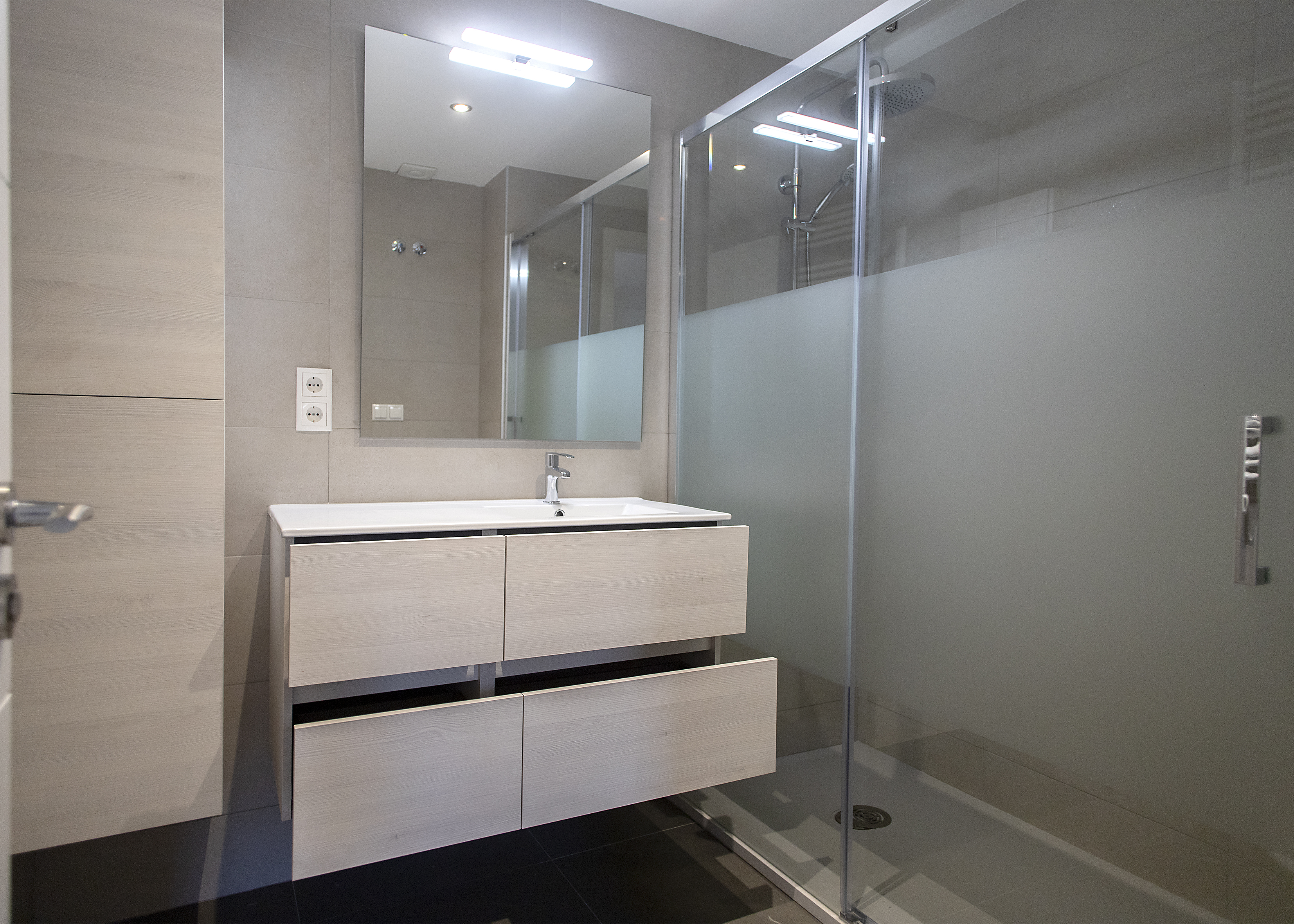 On this occasion two bathroom renovations were carried out. The main bathroom, and larger, was equipped with a sink with built-in storage furniture, a toilet and a protected shower with sliding door screens. For the interior design, beige tiles were chosen to tile the walls, achieving a fresh and modern atmosphere.