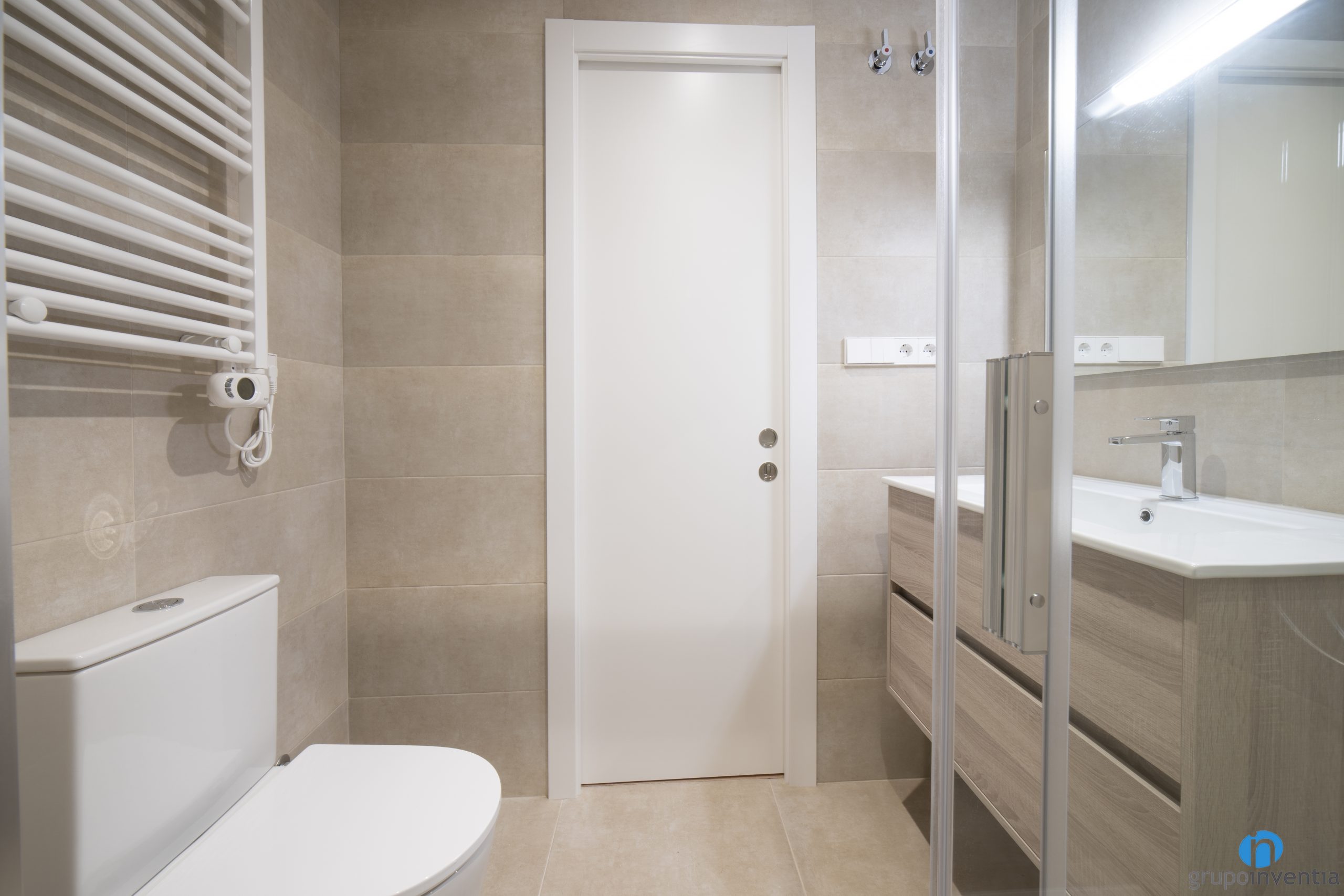 As new sanitary pieces, this bathroom has a sink with built-in storage furniture, a toilet with rounded lines and a floor-to-ceiling shower tray. To protect the water area we have placed a screen with transparent sliding doors. Other new elements in this bathroom renovation are the rectangular bathroom space and the electric towel rail.