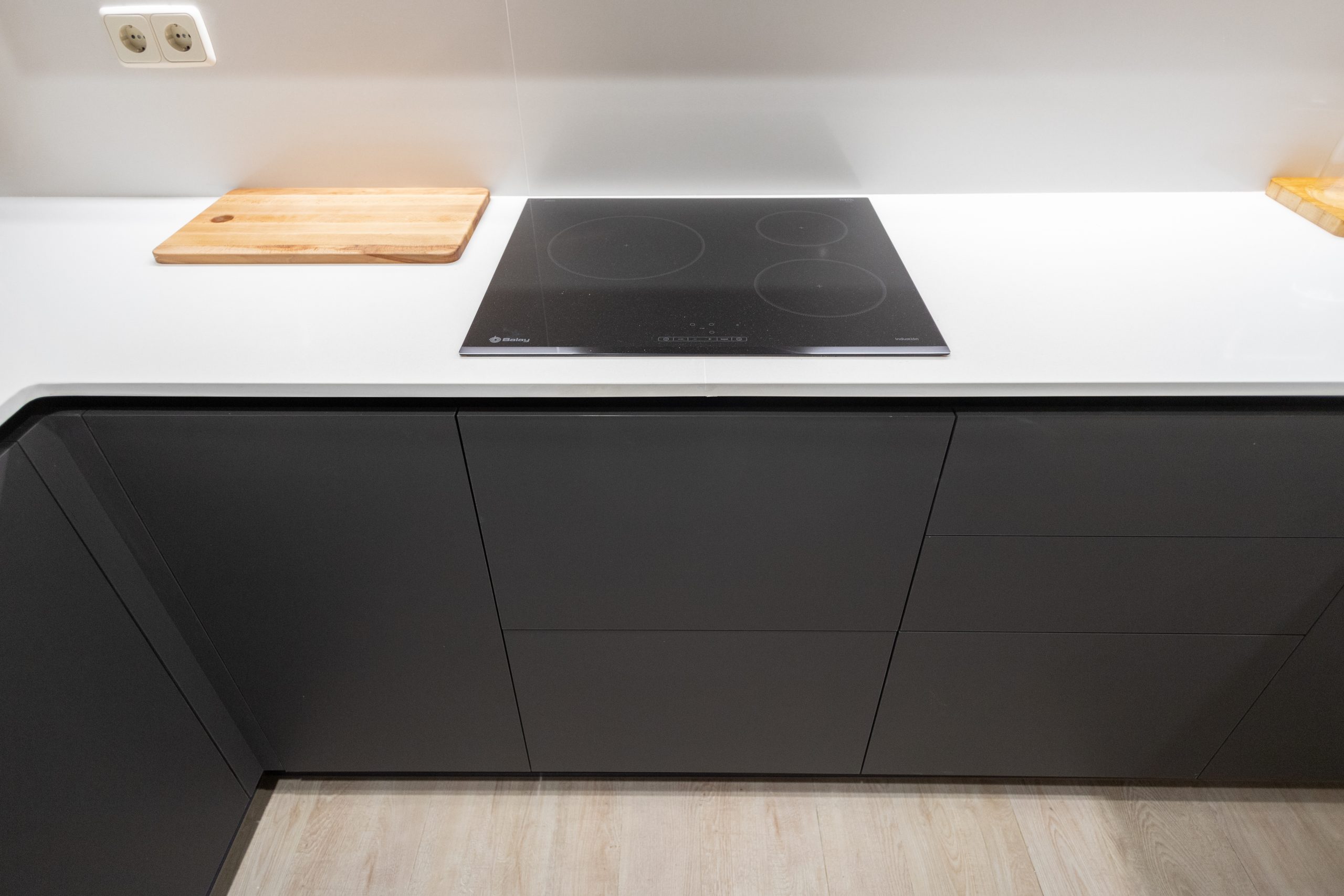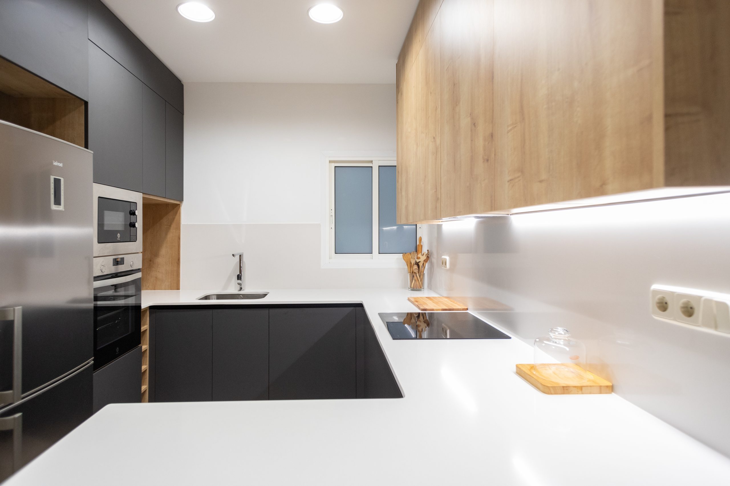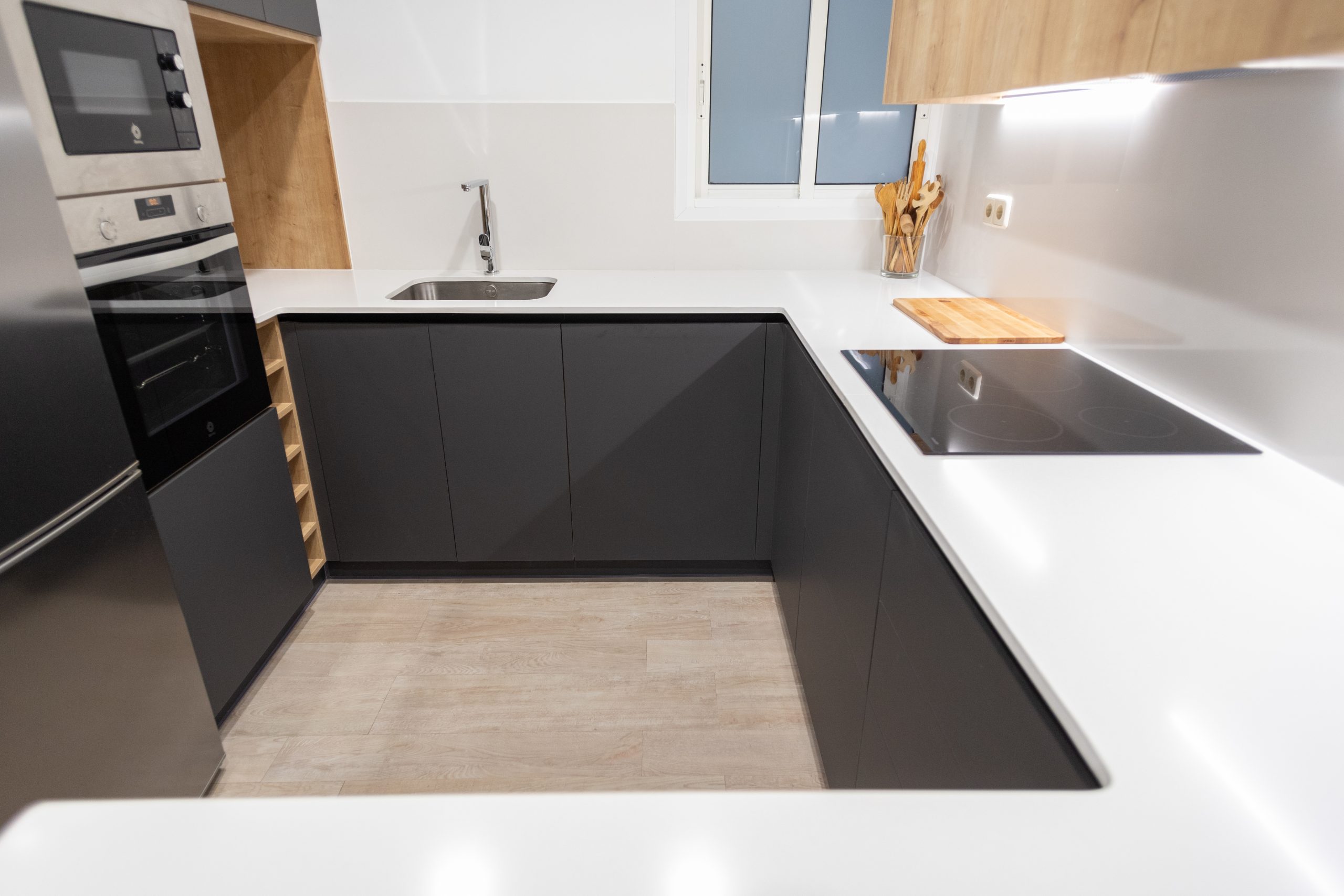We have applied a modern kitchen image. The furniture is black and is combined with natural wood finishes. On the other hand, the countertops are white and generate a lot of light. We have also taken care of laying the new kitchen floor. It is a wood imitation stoneware floor.