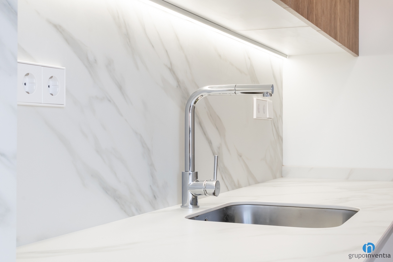 The kitchen furniture combines the white and wood finishes of the upper cabinets. For its part, the counter has a marble finish that fits perfectly. We have painted the walls white to match the lower part of the kitchen furniture. As for the new kitchen floor, we laid tiles in soft gray.
