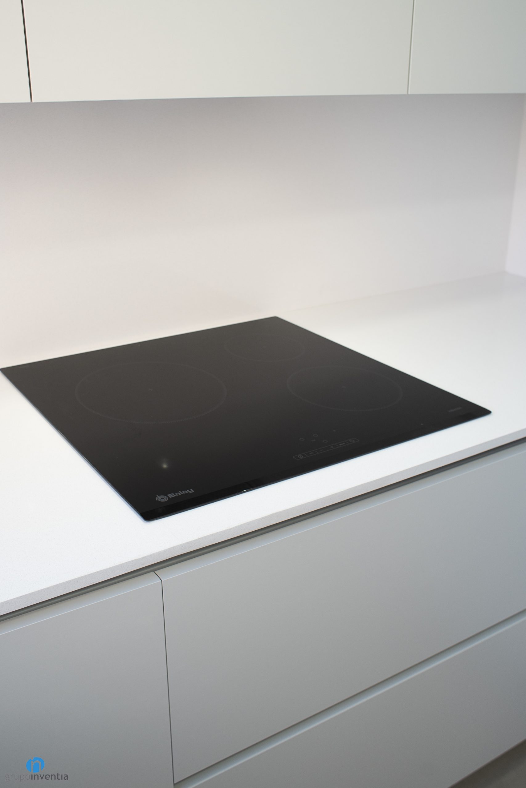 Then an L-shaped worktop is born. The new hob has been installed in the first section. In this kitchen renovation, a ceramic hob has been chosen, which is accompanied by a hidden extractor hood. Both at the bottom and top of the countertop there are drawers and cabinets that provide storage capacity.
