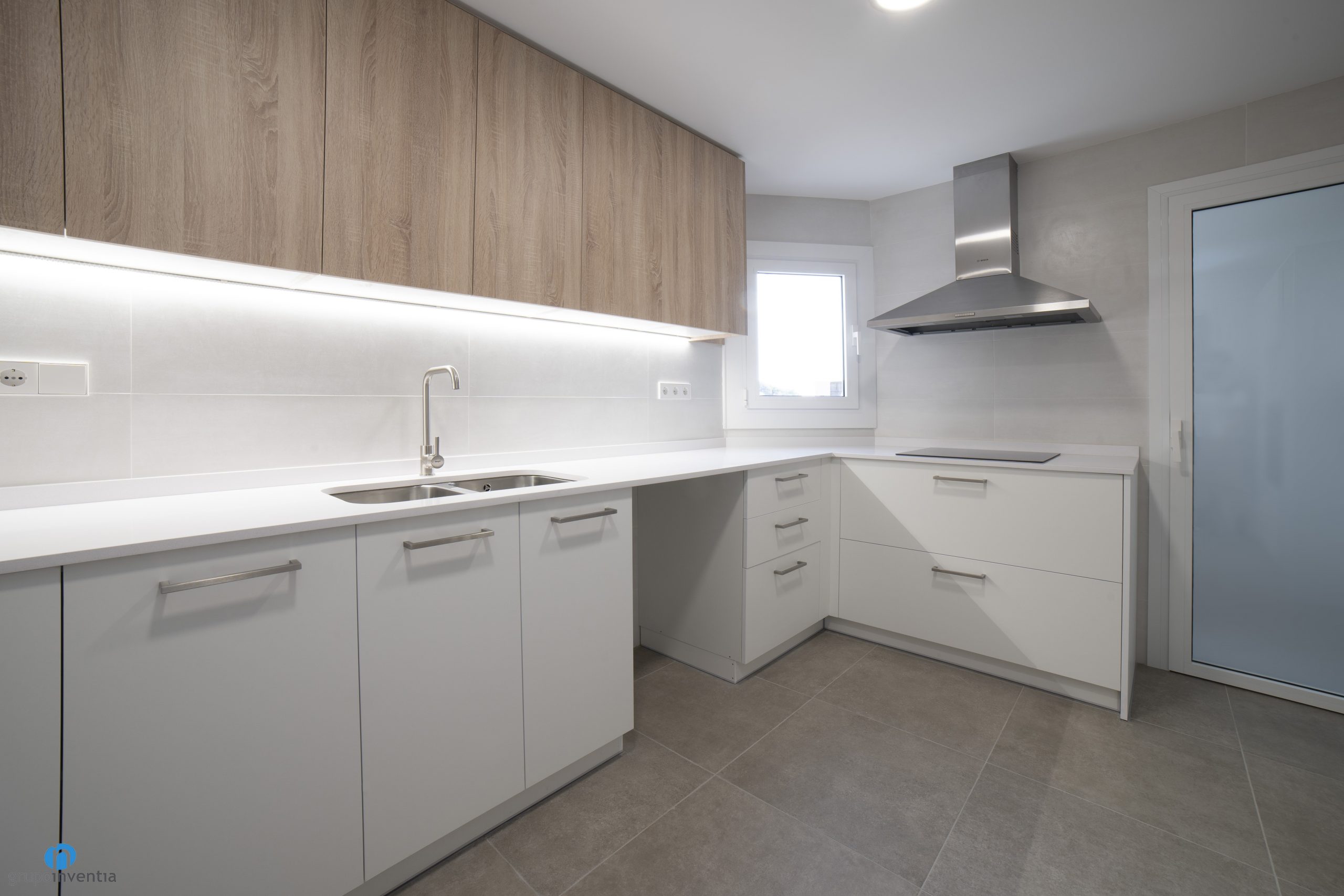 Another color detail we see in the upper cabinets. They are made of smooth panel and a finish in medium wood tones has been chosen for them. On the other hand, the kitchen floor has also been renovated. Visually, we have opted for tiles with a soft gray finish. As for the practical, it is a durable surface that requires easy maintenance.