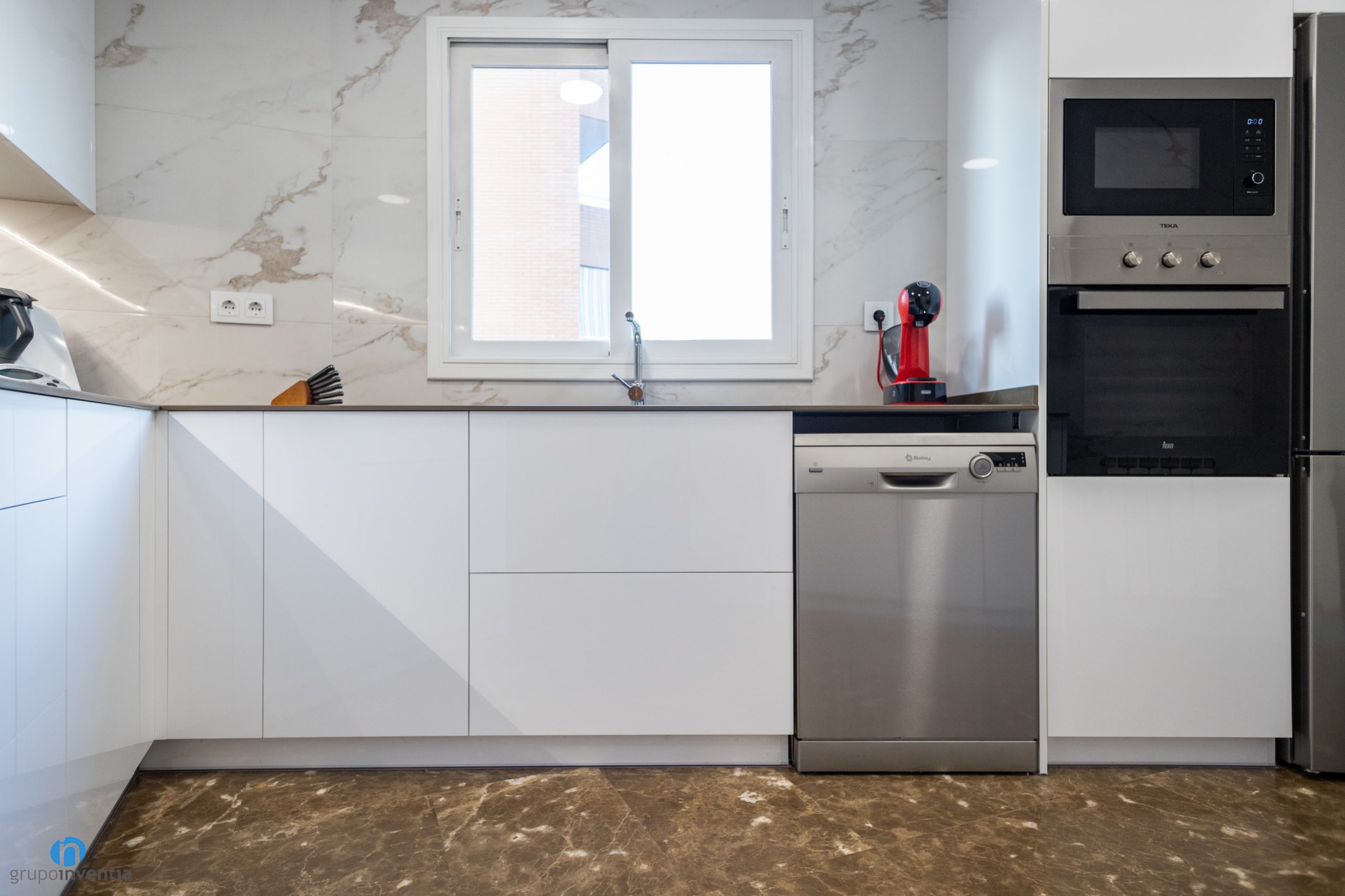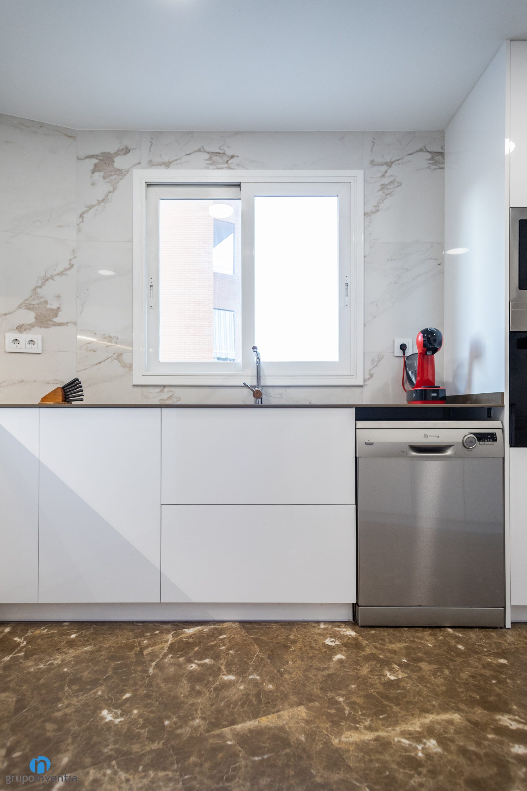 Precisely the walls have been tiled with white tiles with a marble finish. It is not a smooth finish but plays with two shades and in turn combines with the kitchen floor. This time the original kitchen floor has been kept. It is a terrazzo pavement in brown and white tones. Our refurbishment team has cleaned and polished it to look like new.
