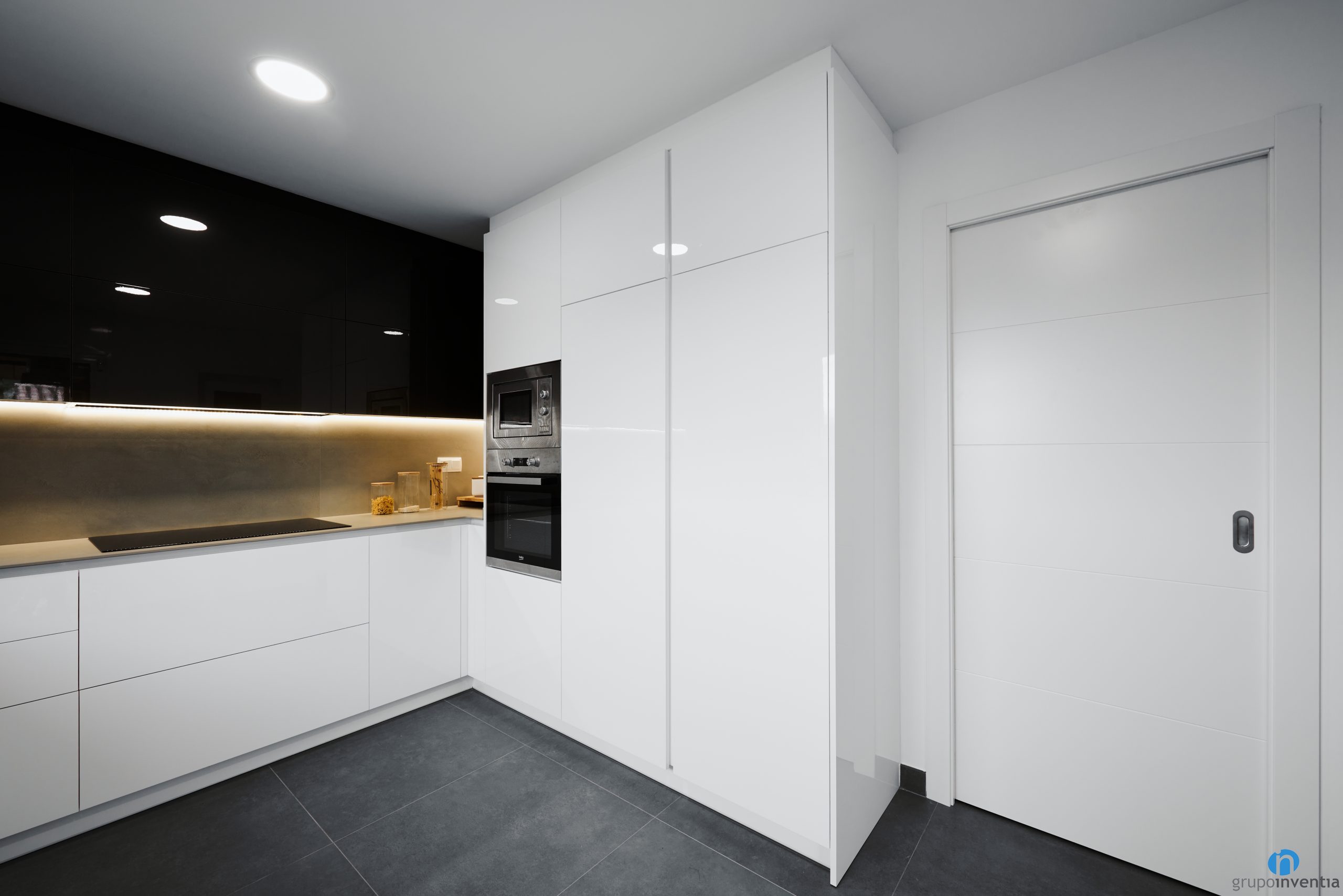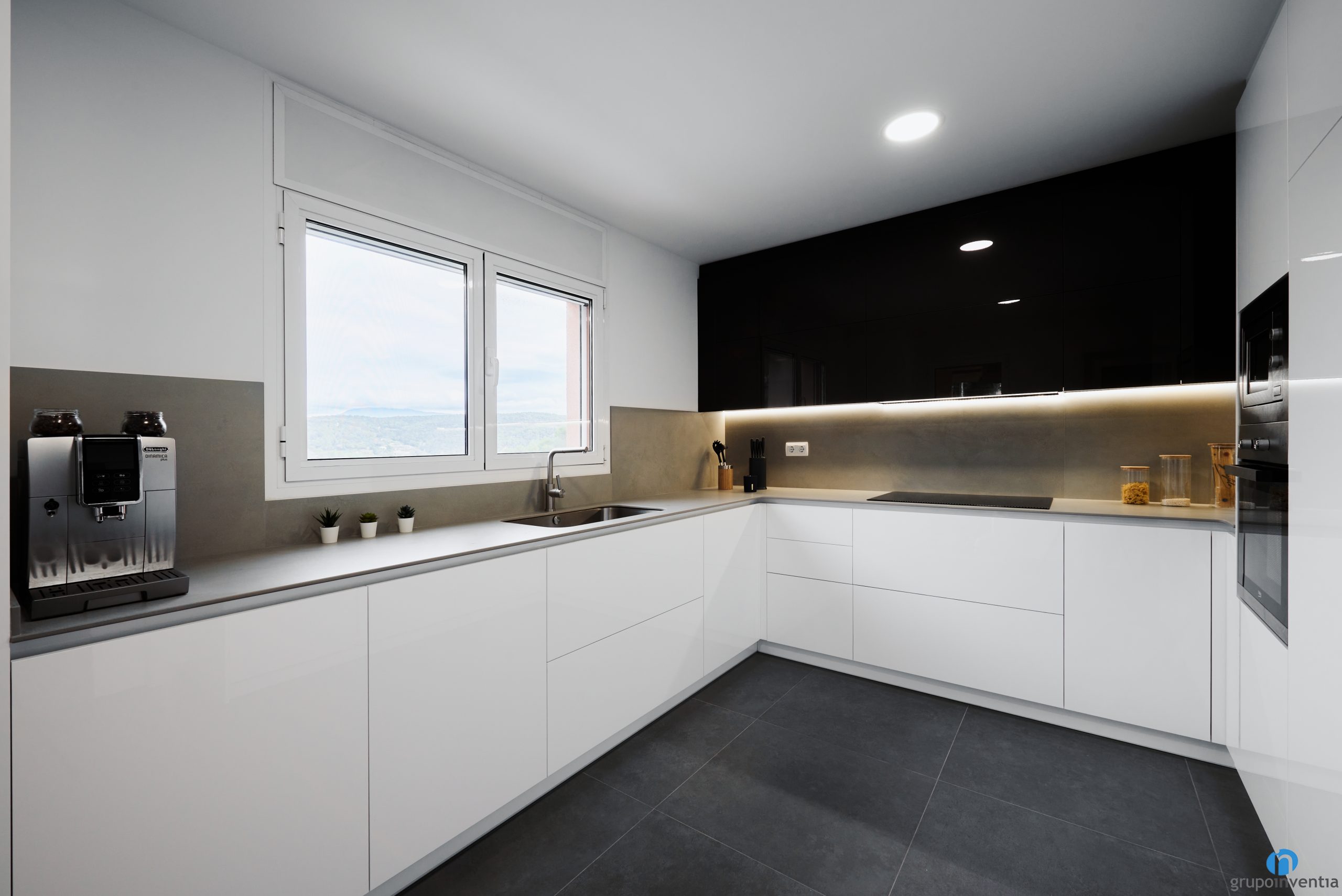 This time we opted for a modern design kitchen with neutral tones. The lower part of the kitchen cabinet is white and the upper cabinets are black. It’s a very nice combination and it’s a trend in kitchen renovations. These two colors are combined with gray countertops.