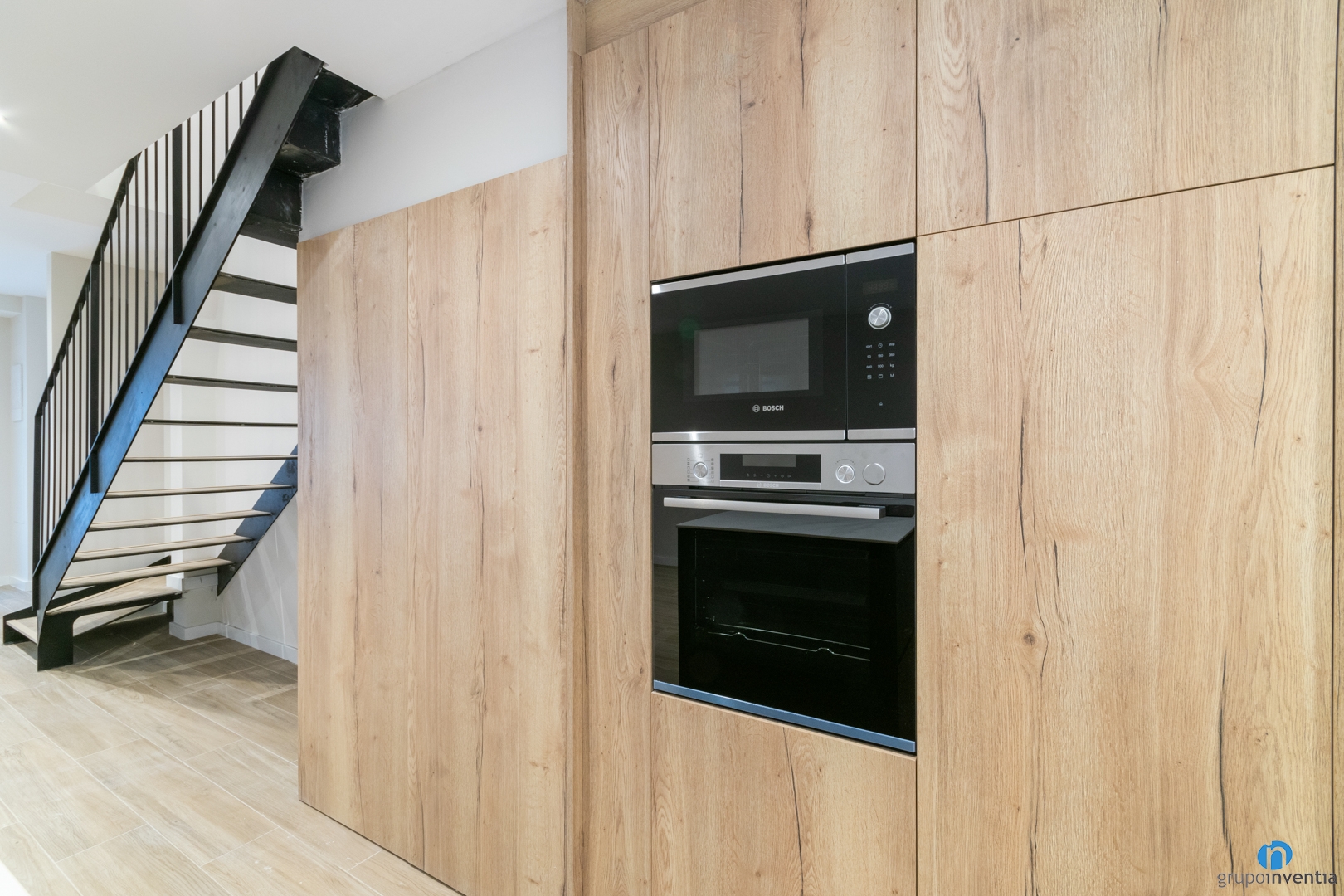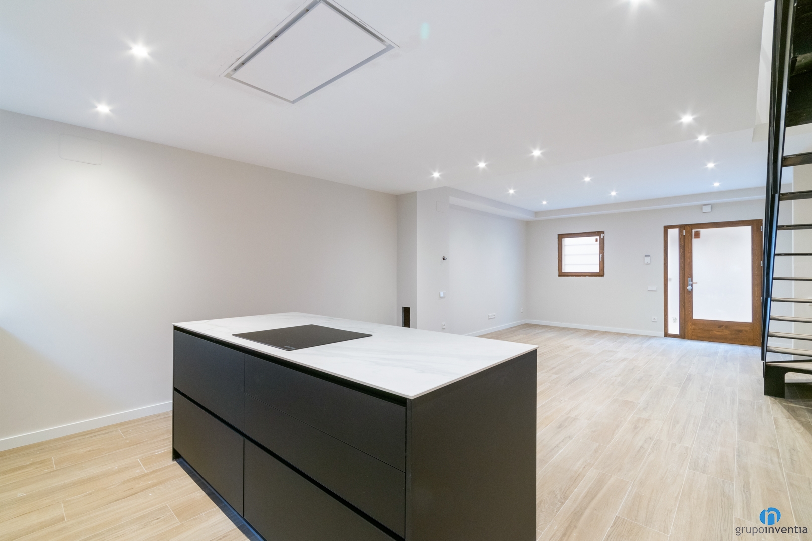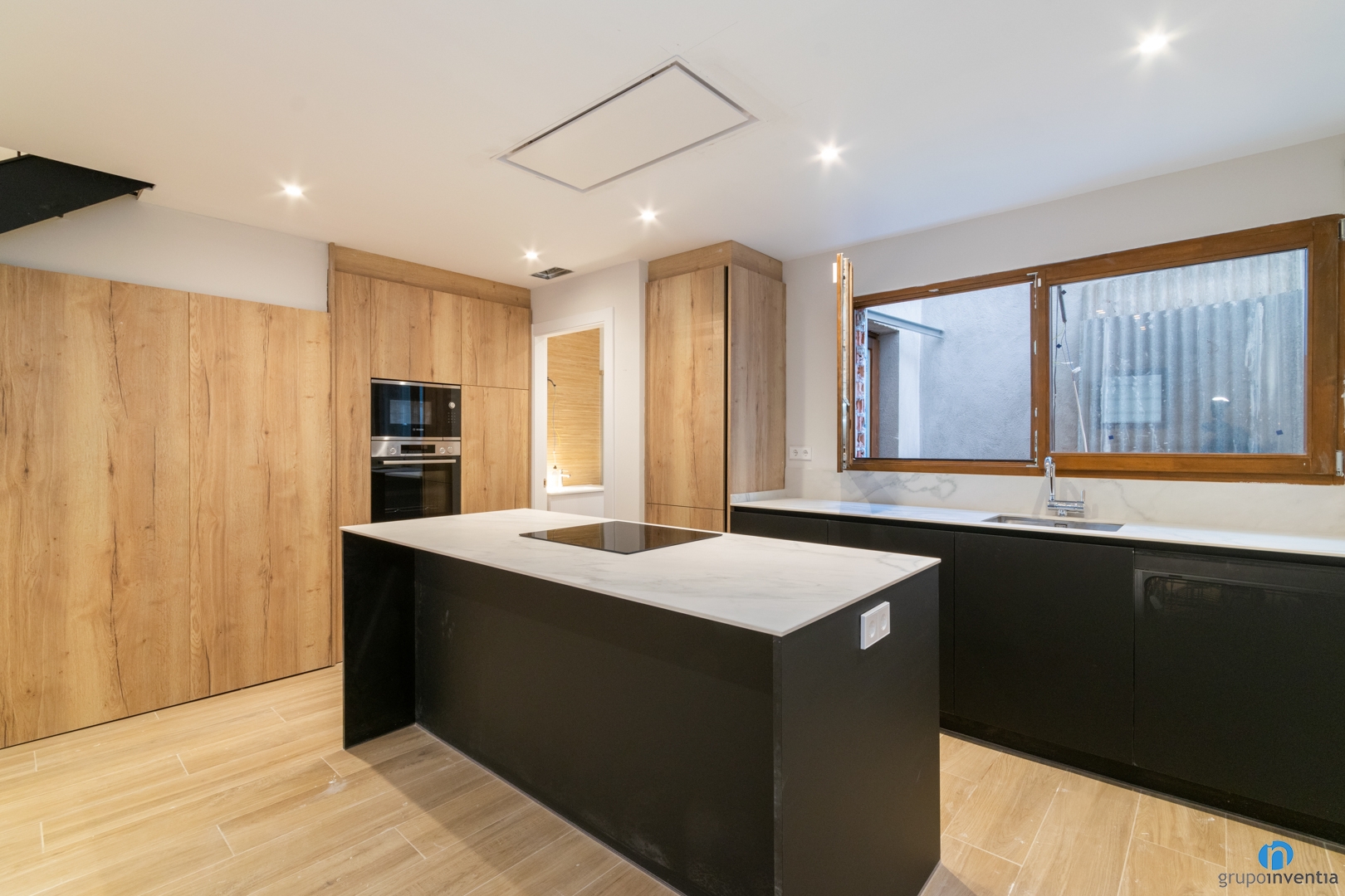 In terms of design, this newly construction kitchen combines the color black with wood finishes. In this way, it is integrated into the home, although visually defining its space.