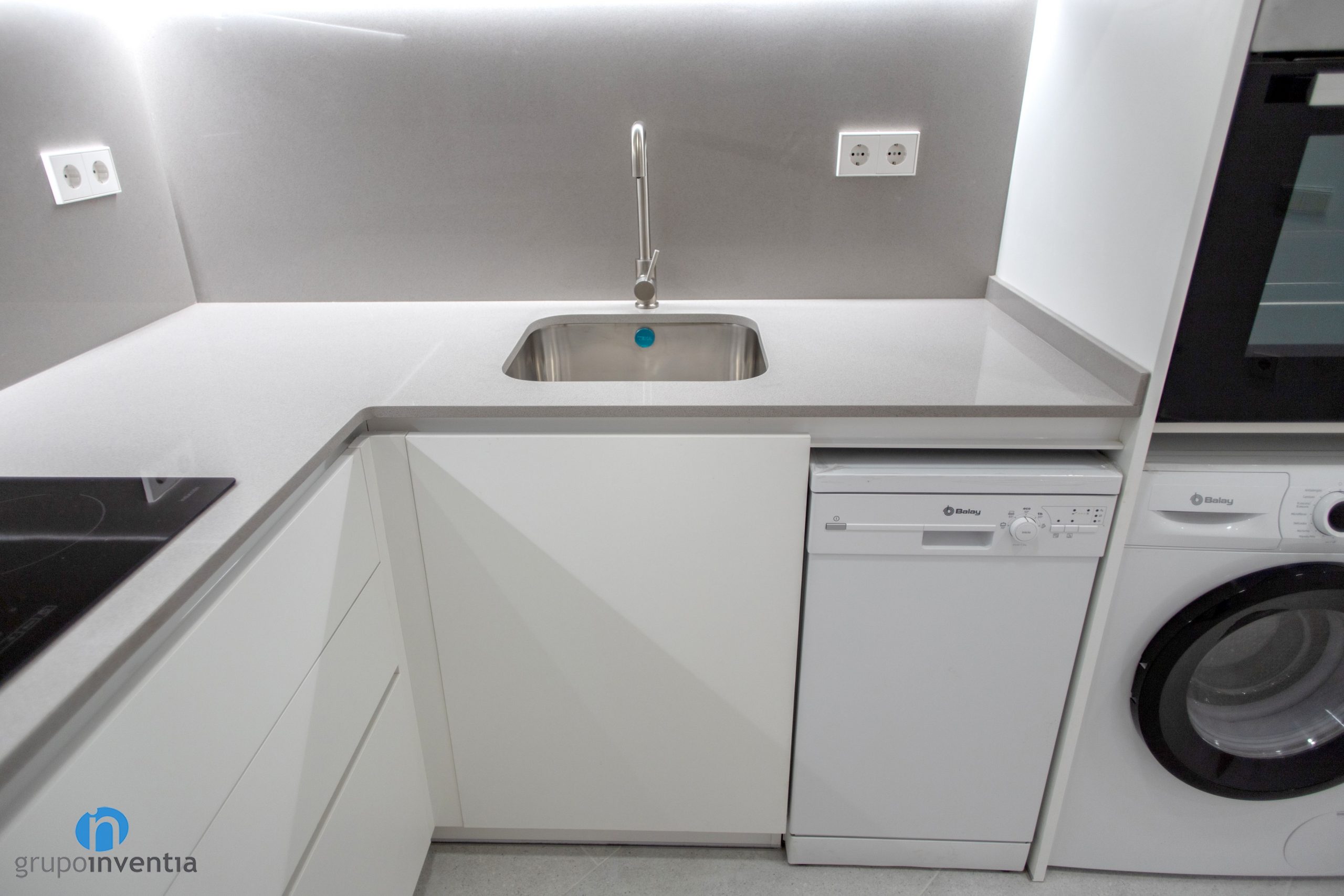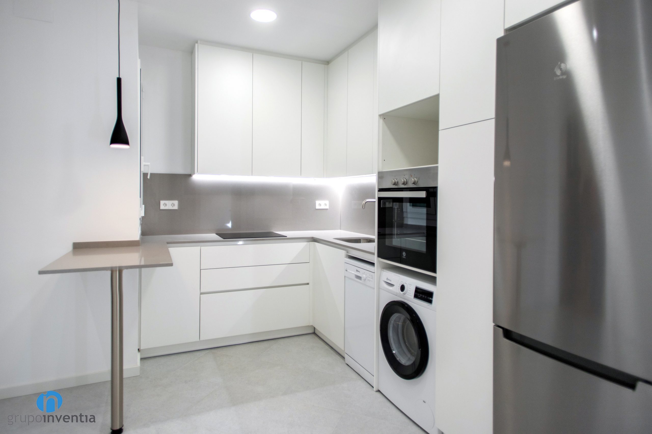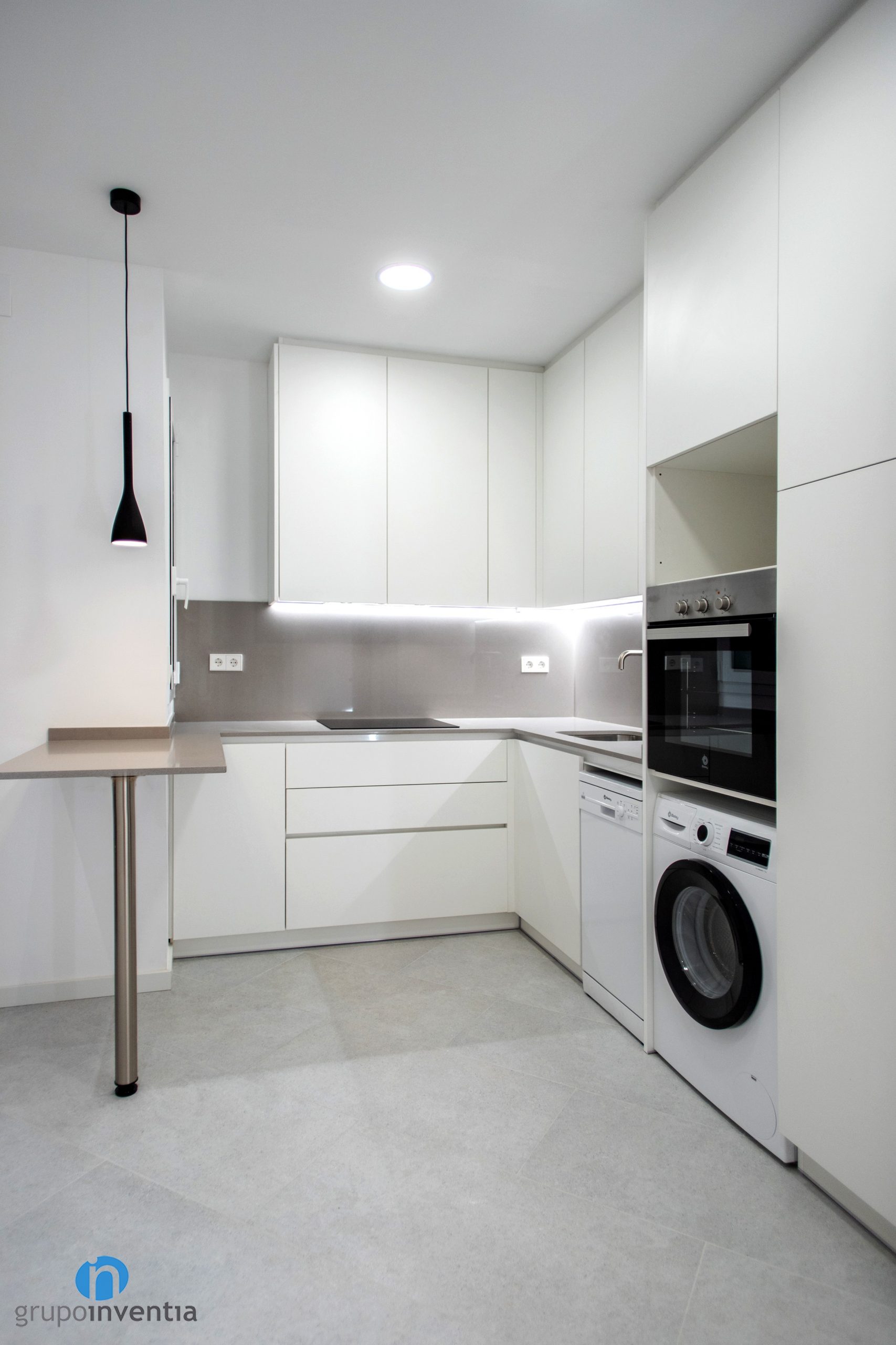 The house renovation of this house in Consell de Cent street has also led to the complete renovation of the kitchen. It is an open kitchen and distributed through an L-shaped kitchen cabinet. At the far right are several appliances. These include a refrigerator, oven, microwave, washing machine and dishwasher.