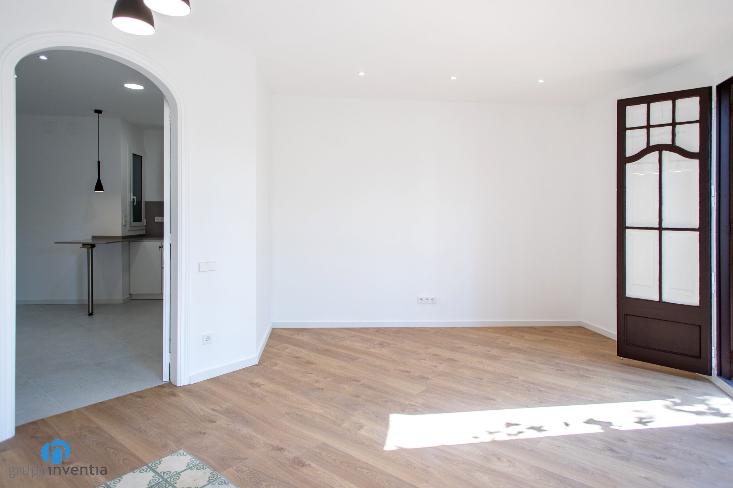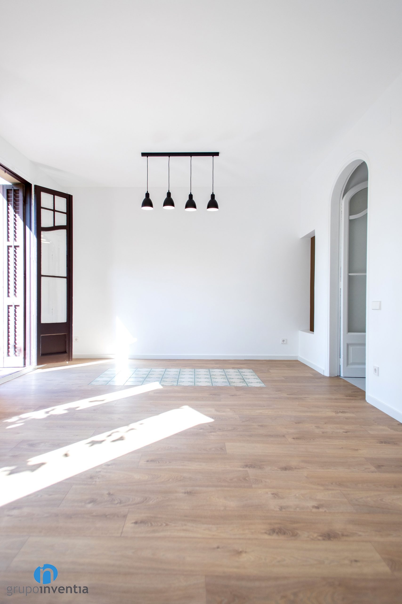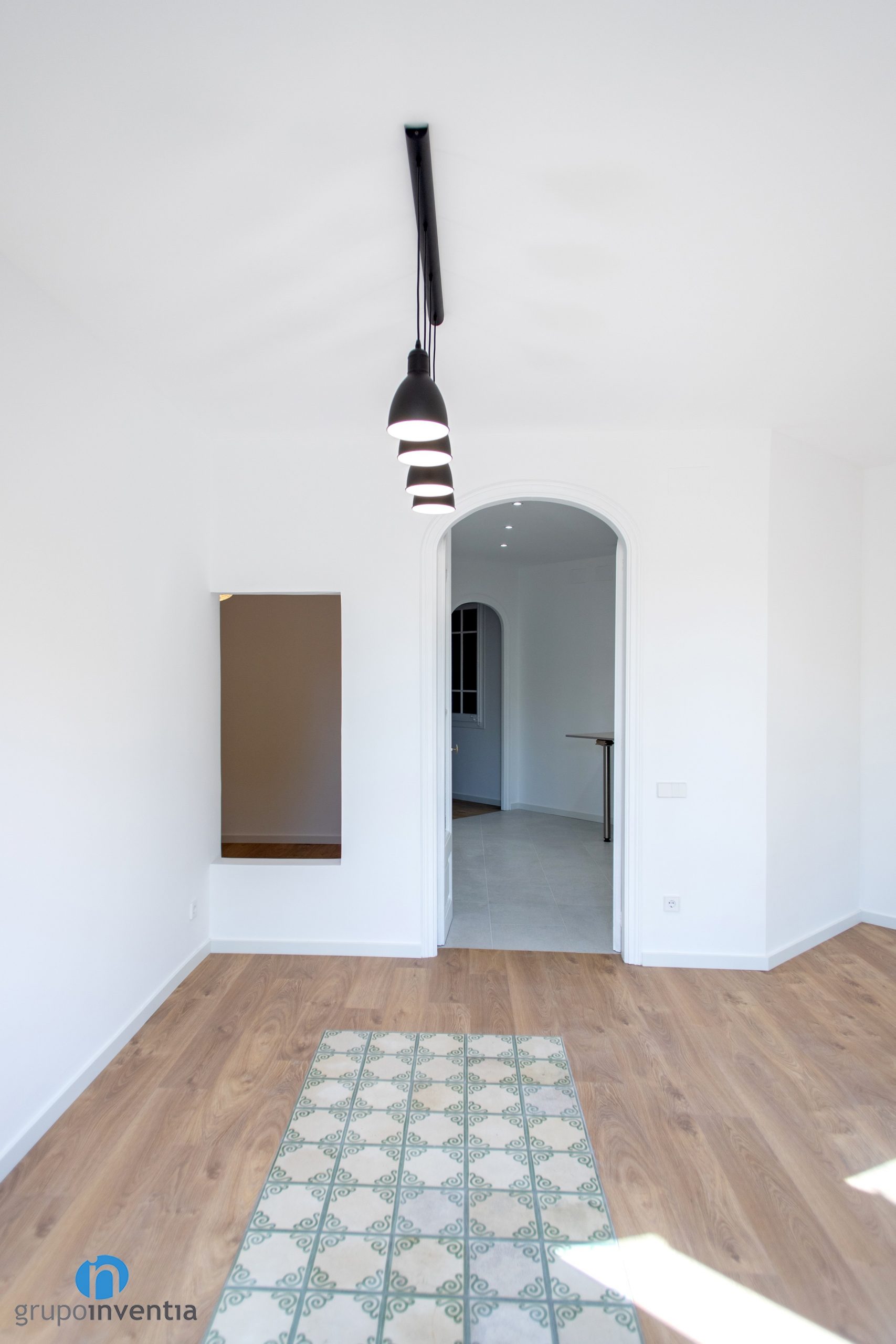 Another detail of this house renovation in Barcelona is the new pavement. To complete the renewed image in rooms such as the livingroom and bedrooms, a parquet floor in medium shades of wood has been placed. A hydraulic floor space has also been placed in the living area, marking the dining area. For its part, several original doors and windows have been kept, duly restored.