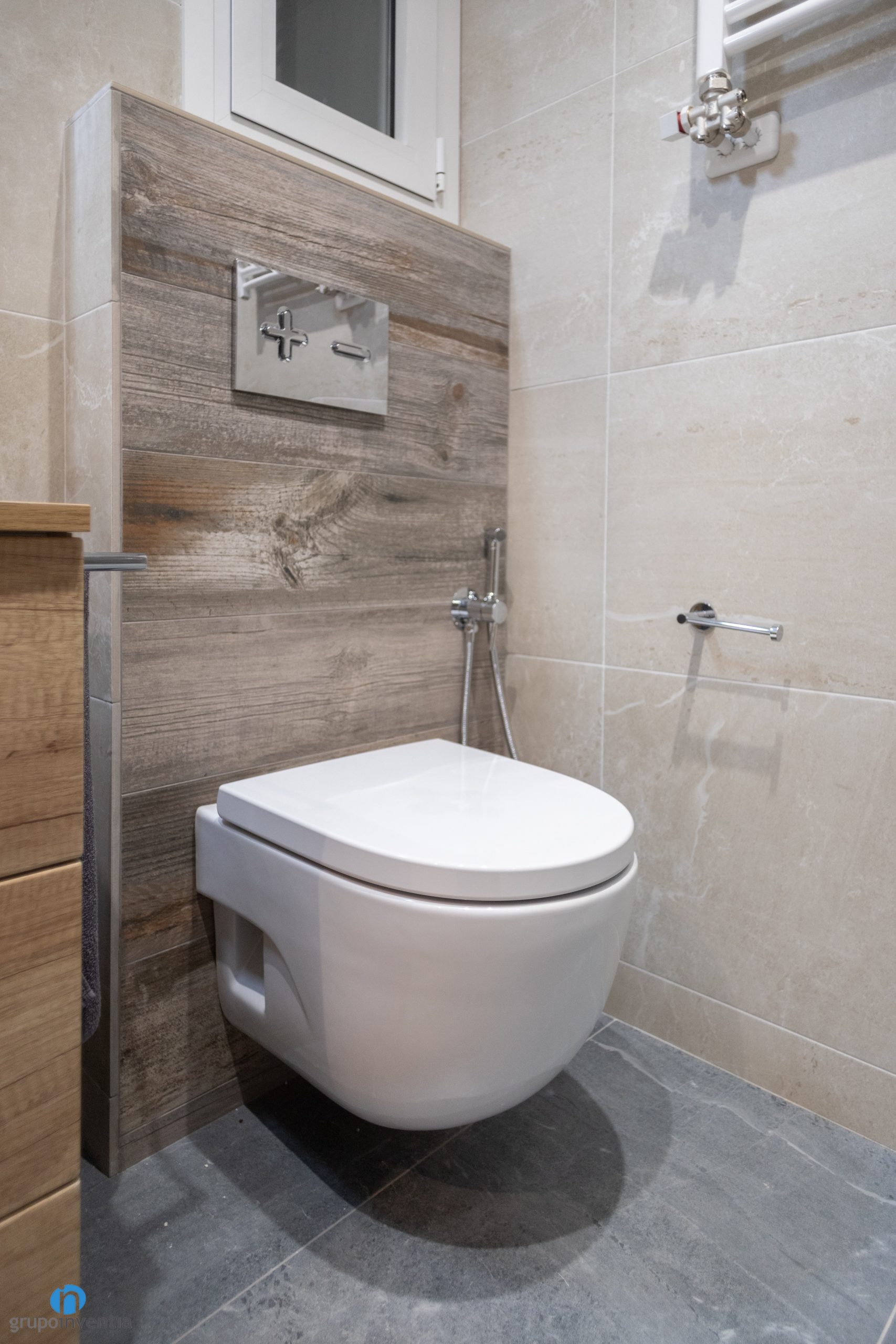 For the new image of the bathrooms, the general decorative line has been followed. For the tiling of the walls, tiles with different neutral tones have been combined. Beige and wood imitation tiles have been used in the main bathroom. For its part, the toilet features white metro-type tiles and tiles with a hydraulic-style design. In both cases, a successful gray ceramic floor has been chosen.