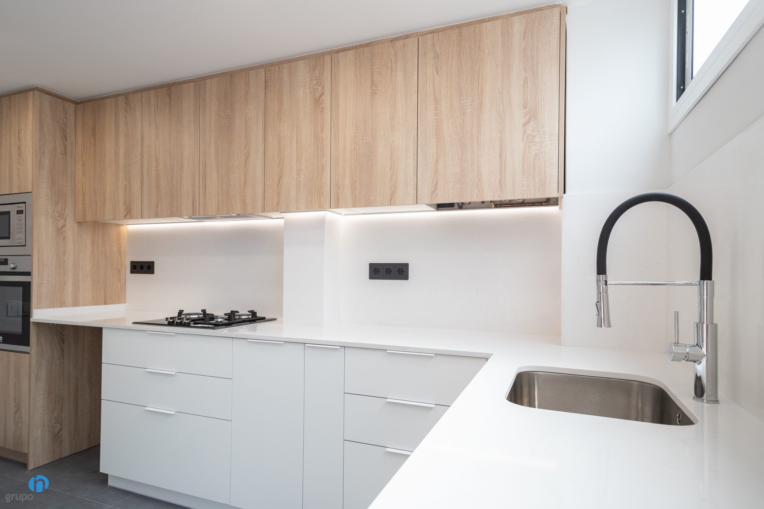 From there, an L-shaped worktop is born. It offers a wide support capacity and is equipped with a three-burner hob and a sink. It also has storage capacity along the lower area and the upper left. All this framed in a kitchen renovation design that combines with great success several neutral tones.