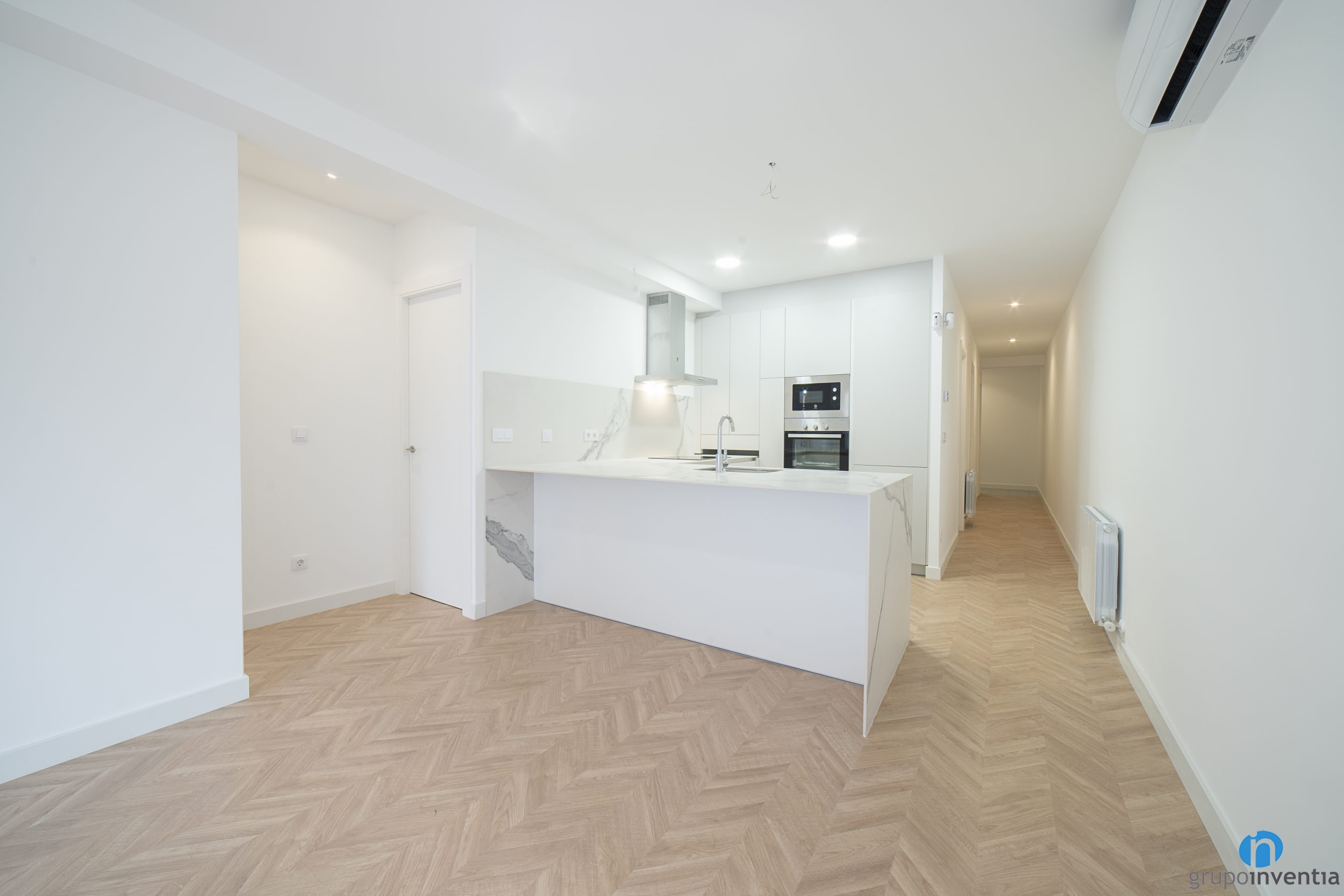 We have painted the walls white to take advantage of the natural light that this floor has. In this way, the light coming from outside can flow to all corners of the house. It is accompanied by a parquet floor in natural wood tones and placed in the shape of a herringbone.