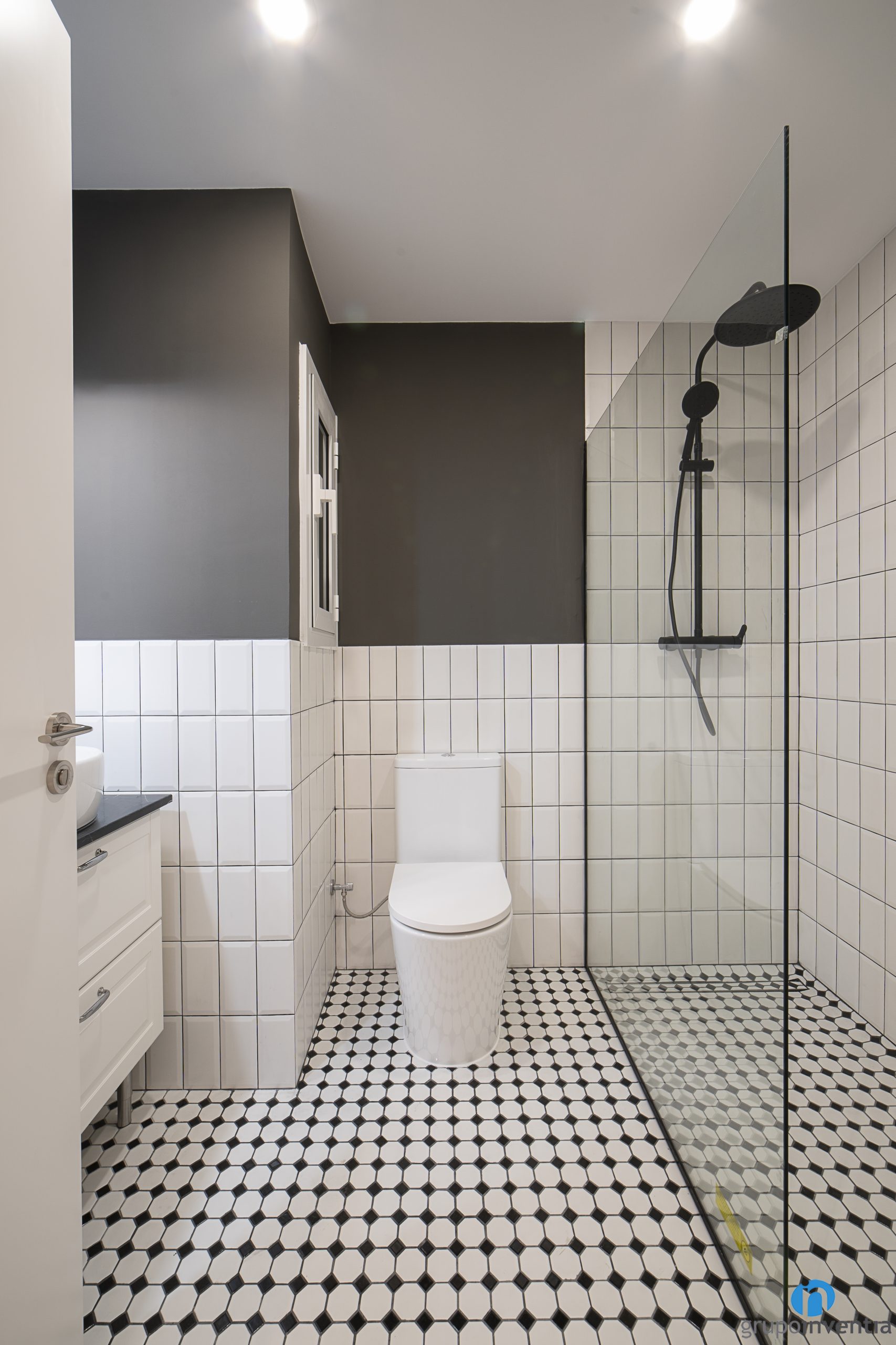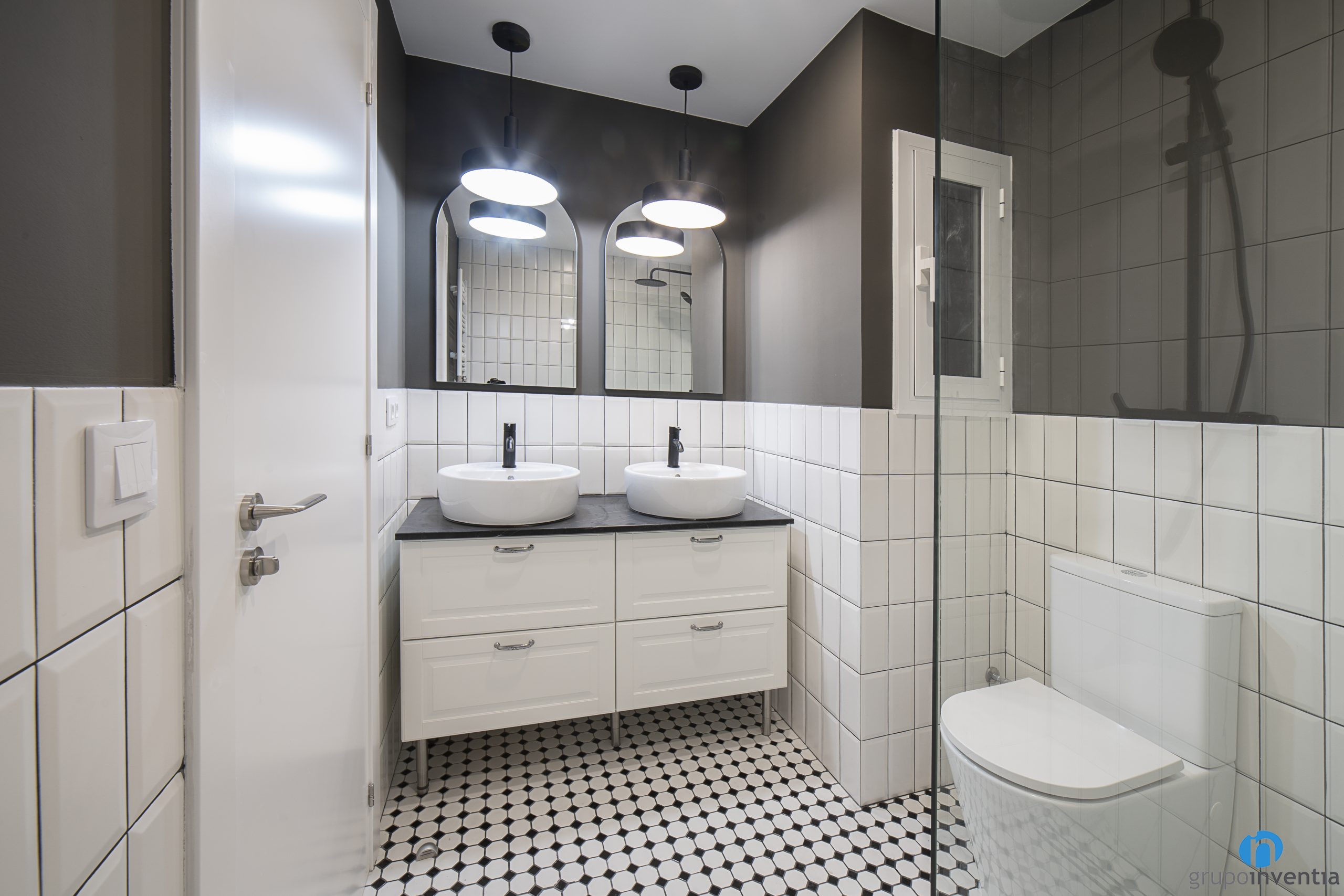 The new image of this bathroom renovation in Barcelona responds to current trends and the desire for a timeless image. In this way we have used neutral tones to apply the new finishes. In the two bathrooms, the mid-height tiling with white tiles and the hydraulic-style floor stand out.