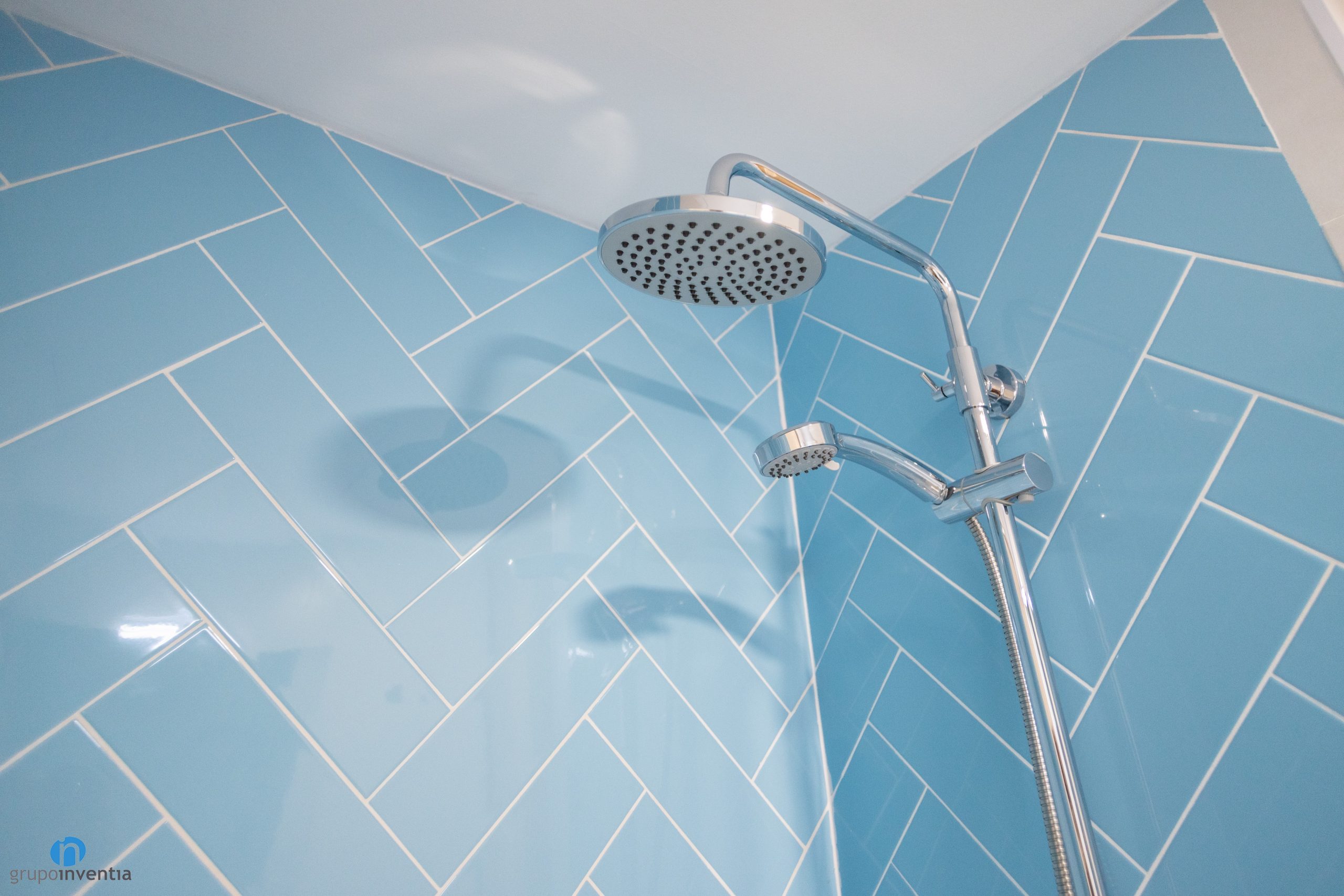 Most bathroom walls have been tiled with white tiles. As in the rest of the house, it is presented as a very bright and visually spacious space. Color has been added with the tiling of the shower wall. In this case, blue rectangular tiles have been used. They have been placed diagonally, an effect that generates dynamism and modernity.