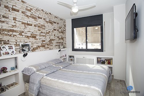 Meanwhile, the master bedroom also features a wall of brick, specifically the head of the bed. For the design of the stay neutral tones were used, generating a greater sense of spaciousness and light. The furniture consists of a bed with a headboard anchored to the wall with spaces bedside at the ends.