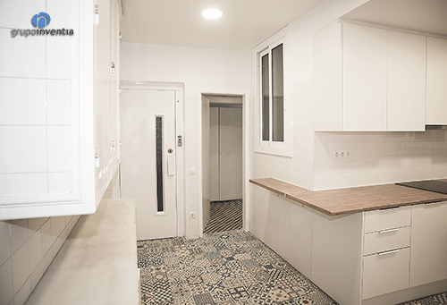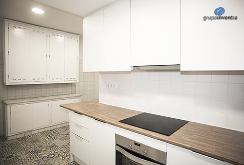 Regarding design, this kitchen renovation combines white, around the kitchen cabinet, and wood finishes of the different sections of the counter. In turn, highlights the hydraulic pavement, which was recovered and returned to place.