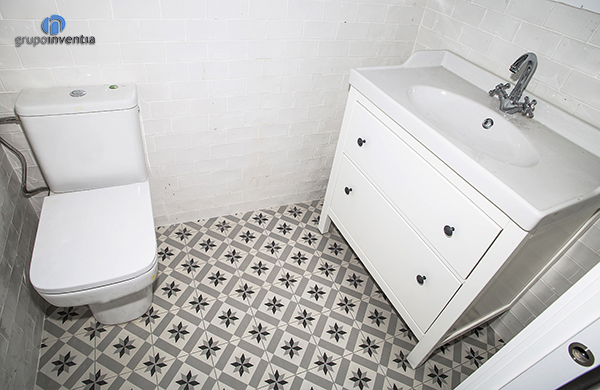 Meanwhile, the toilet has a sink and a toilet. The design of the room stands out for its total tiled with white tiles and hydraulic pavement that brings a lot of personality.