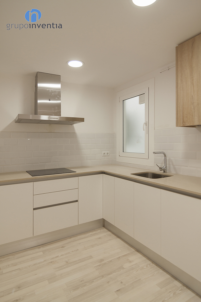 One of the rooms that its equipment was improved after the passage of Grupo Inventia was the kitchen. The reform kitchen in Biada street was distributed in the form of L, thus achieving perfect organization of space. On the right side of this kitchen, before the countertop is placed a kitchen cabinet in which encastraron appliances. In this case, the fridge is camouflaged by cabinet door while the oven and the microwave so they are visible.