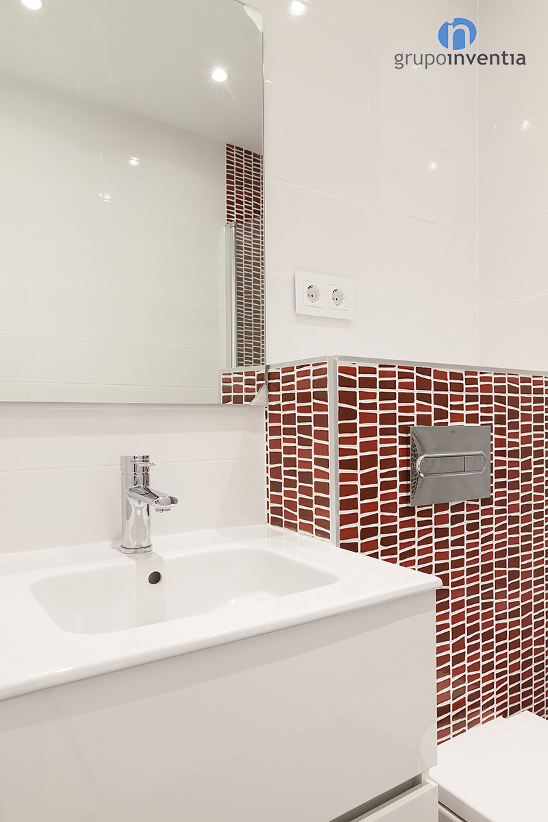 In the bathroom reform followed the pattern of housing design, in which the white color is the main protagonist. However, in this room, in addition to placing a floor of a darker tone, the wall on which it is placed in toilet tiled to half height with red mosaic tiles, providing a nice touch of color.