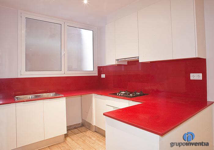 The kitchen housed in a separate space but is open to the livingroom. As the surface is square was chosen by a U-shaped distribution, including a bar american kitchen type that works as a space divider. Meanwhile appliances are encastraron on the left of this kitchen reform.