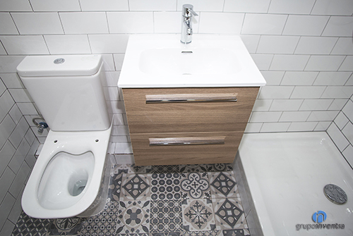 They took out two bathroom reforms and in both we used the same design. This is halfway walls tiled with white tiles that combine wood finishes with the bathroom furniture and flooring hydraulics.