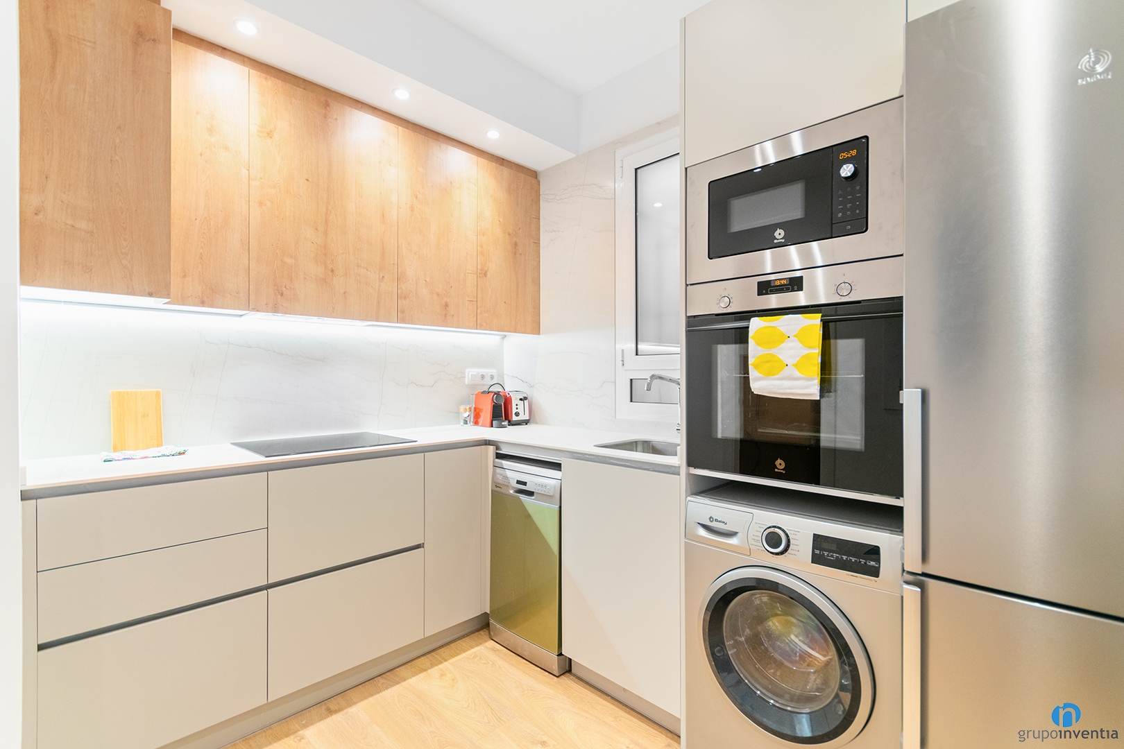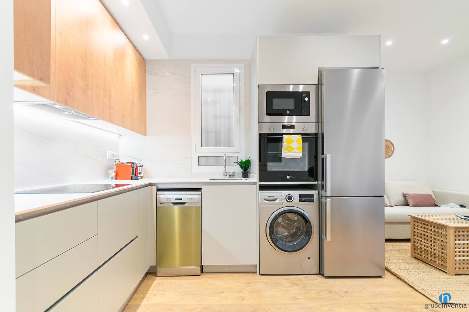 Although the main focus of this project has been the furniture, we have also carried out the kitchen renovation and the bathroom. The kitchen is open and L-shaped. It offers two countertop sections, large storage capacity and a column with integrated appliances: fridge, oven, microwave and washing machine.