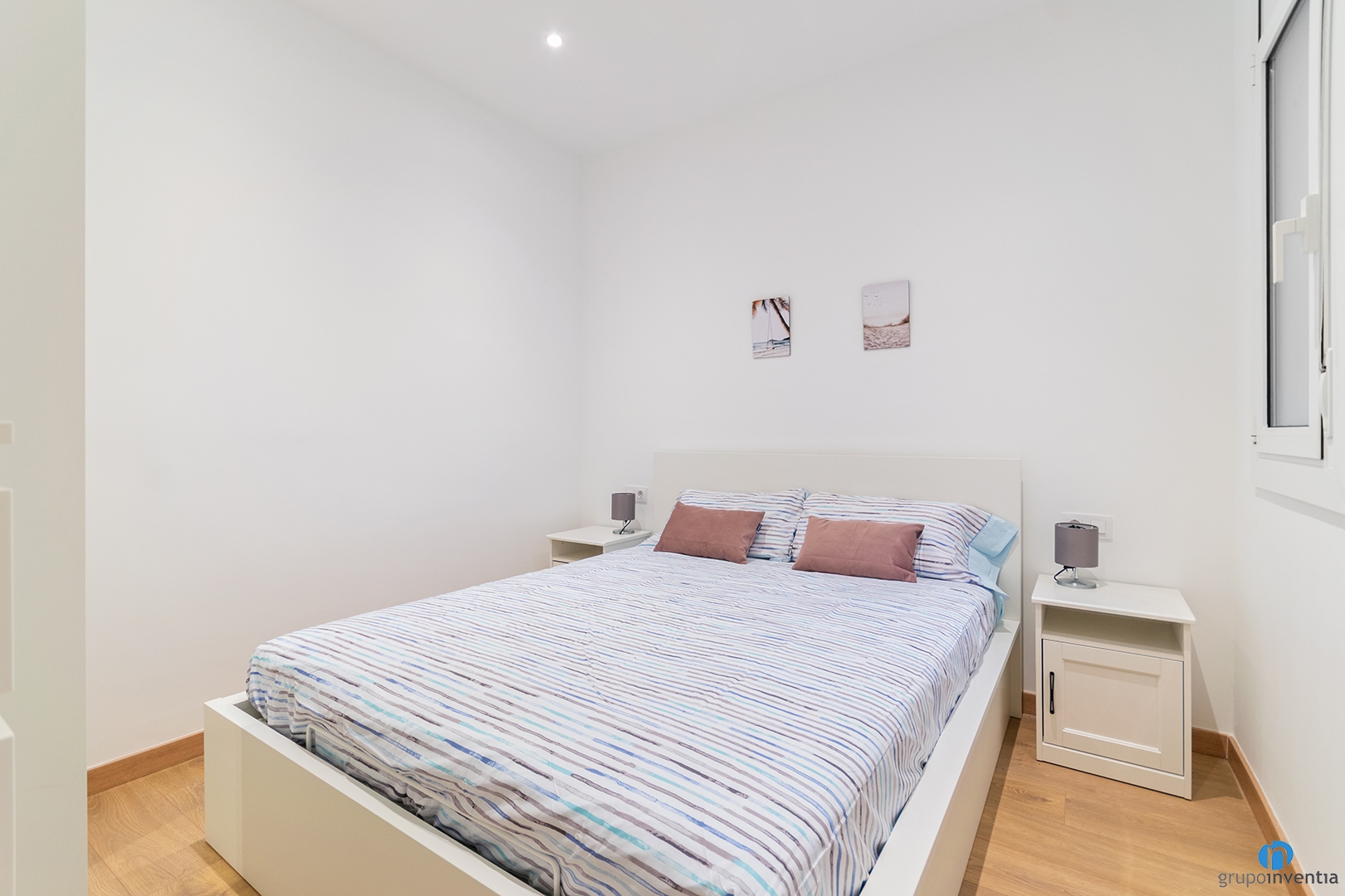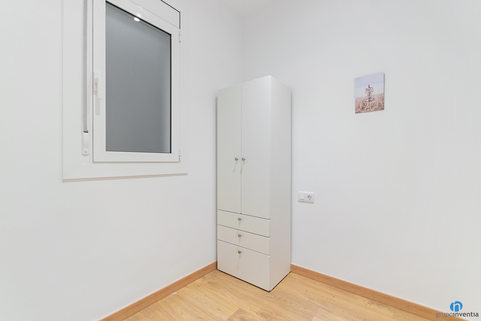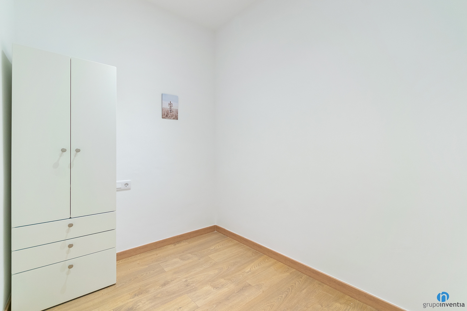 In the main bedroom we have also incorporated contemporary furniture in white tones. The room includes a double bed, bedside tables and a large wardrobe. In addition, a chest of drawers has been added to reinforce the storage capacity. Meanwhile, the penthouse’s second room can be used as a guest room or office and currently has a white wardrobe.