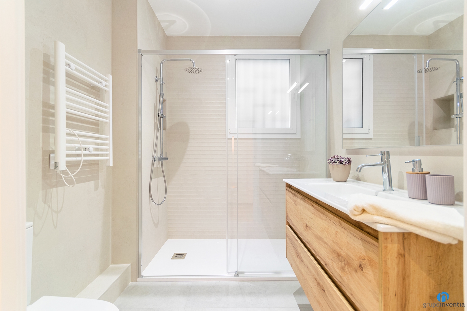 The bathroom has been expanded compared to its original state and is now more functional. It features a contemporary interior design with neutral finishes that enhance brightness. It is equipped with a sink, toilet and a spacious shower.