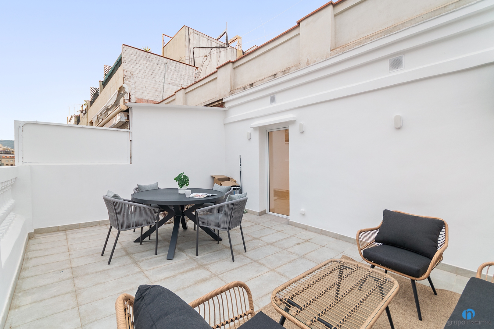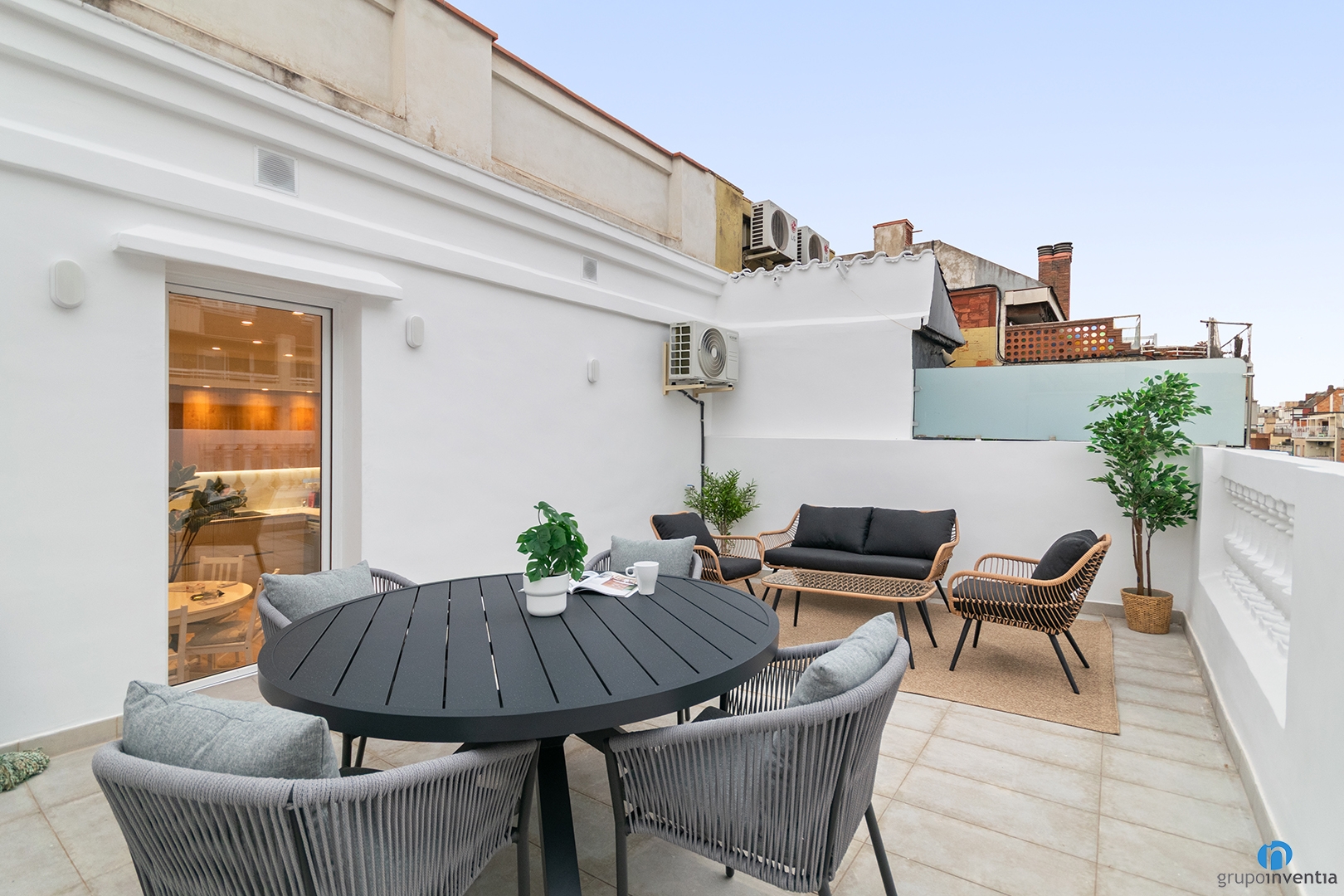 The second area of the terrace has been designed as a relaxation space. It consists of a bench, two armchairs and a coffee table, all with a wicker finish and black cushions. These pieces are placed on a wicker rug similar to the one in the living room, creating a visual connection between the two areas through interior design in Barcelona.
