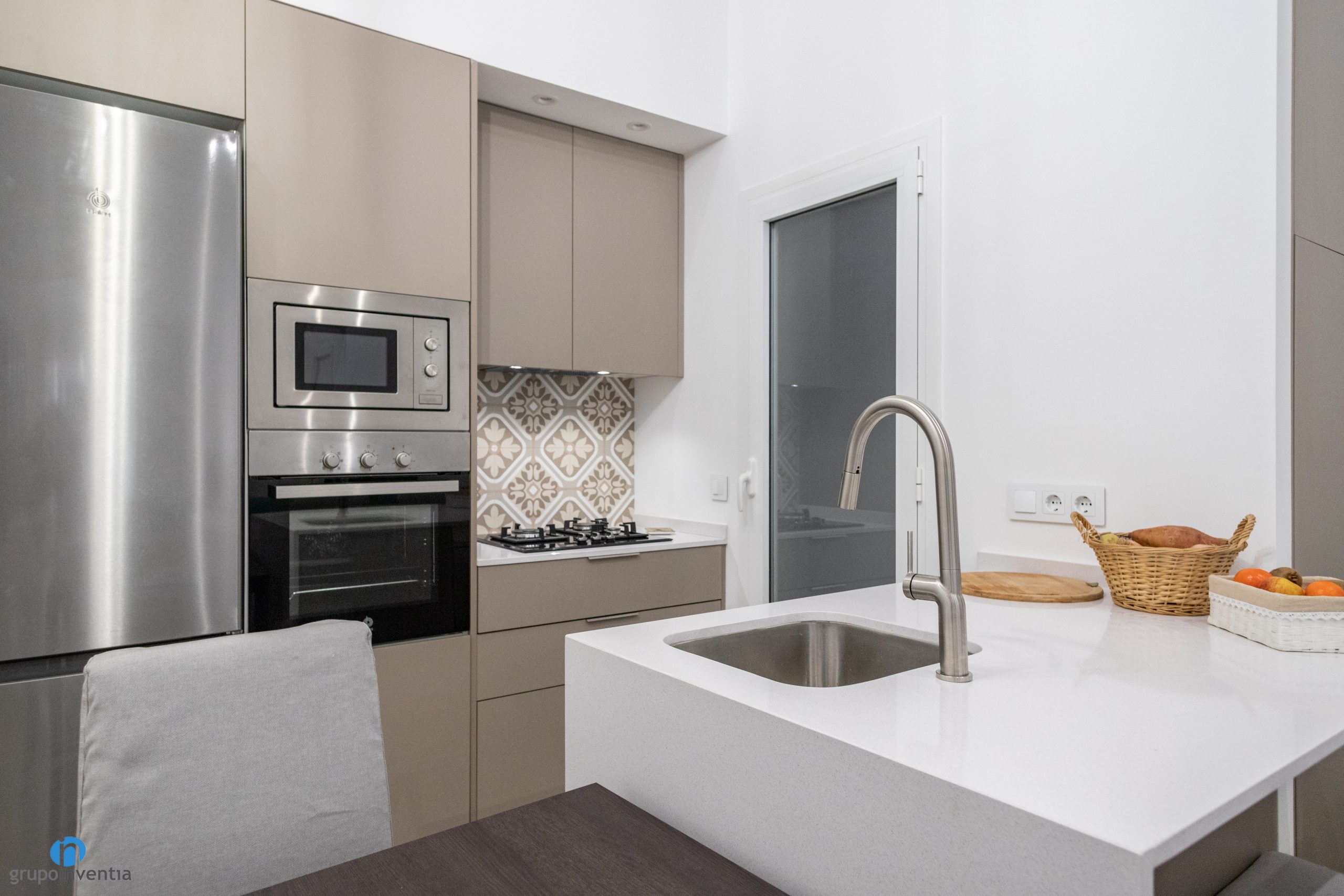 The kitchen has also been completely renovated in this flat in Badalona. So much so that it has become an open kitchen with a distribution on two fronts. To the right, open to the livingroom, is a counter that serves as a breakfast bar. It offers a support surface and has a single sink. On the other hand, the dishwasher has been integrated at the bottom.