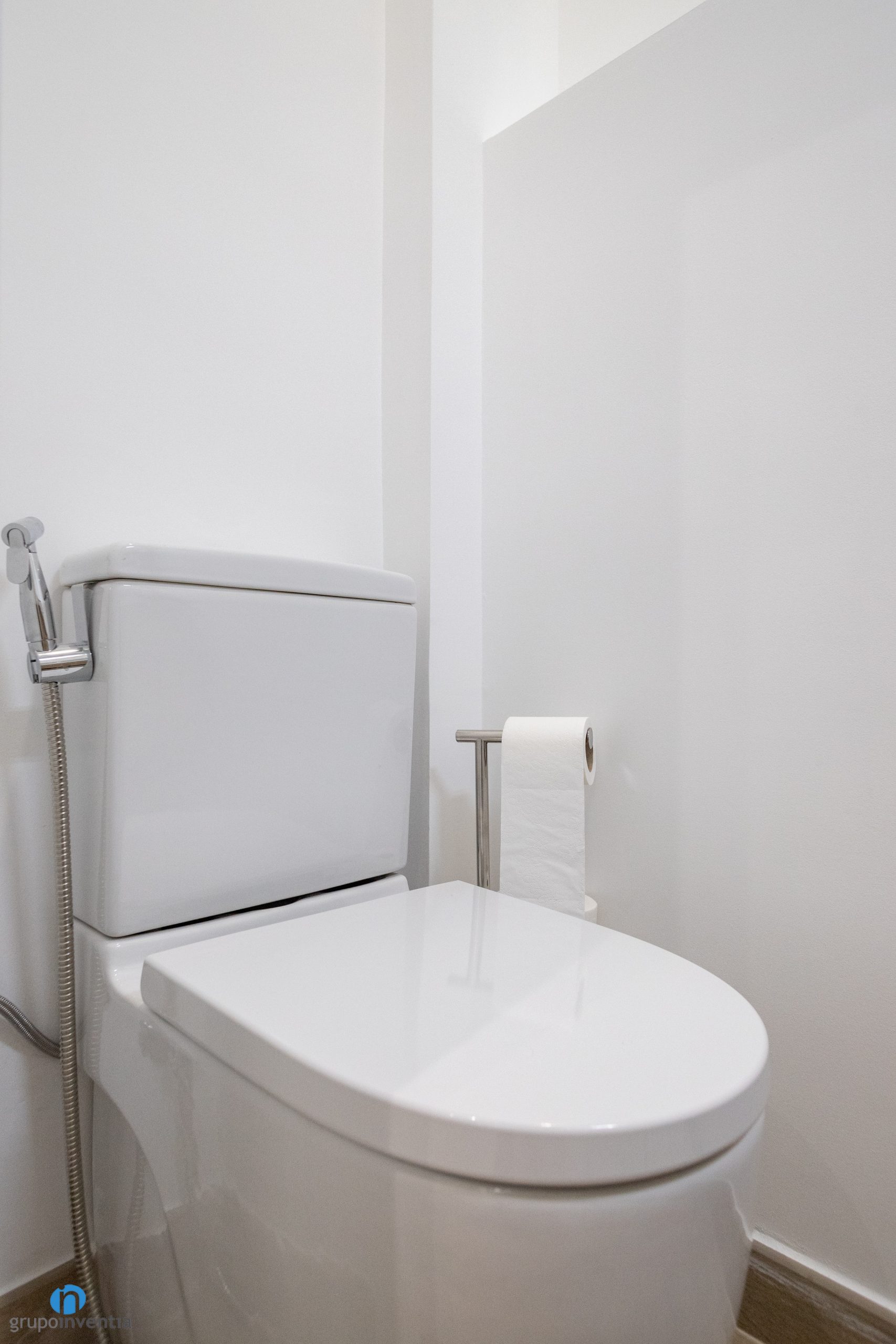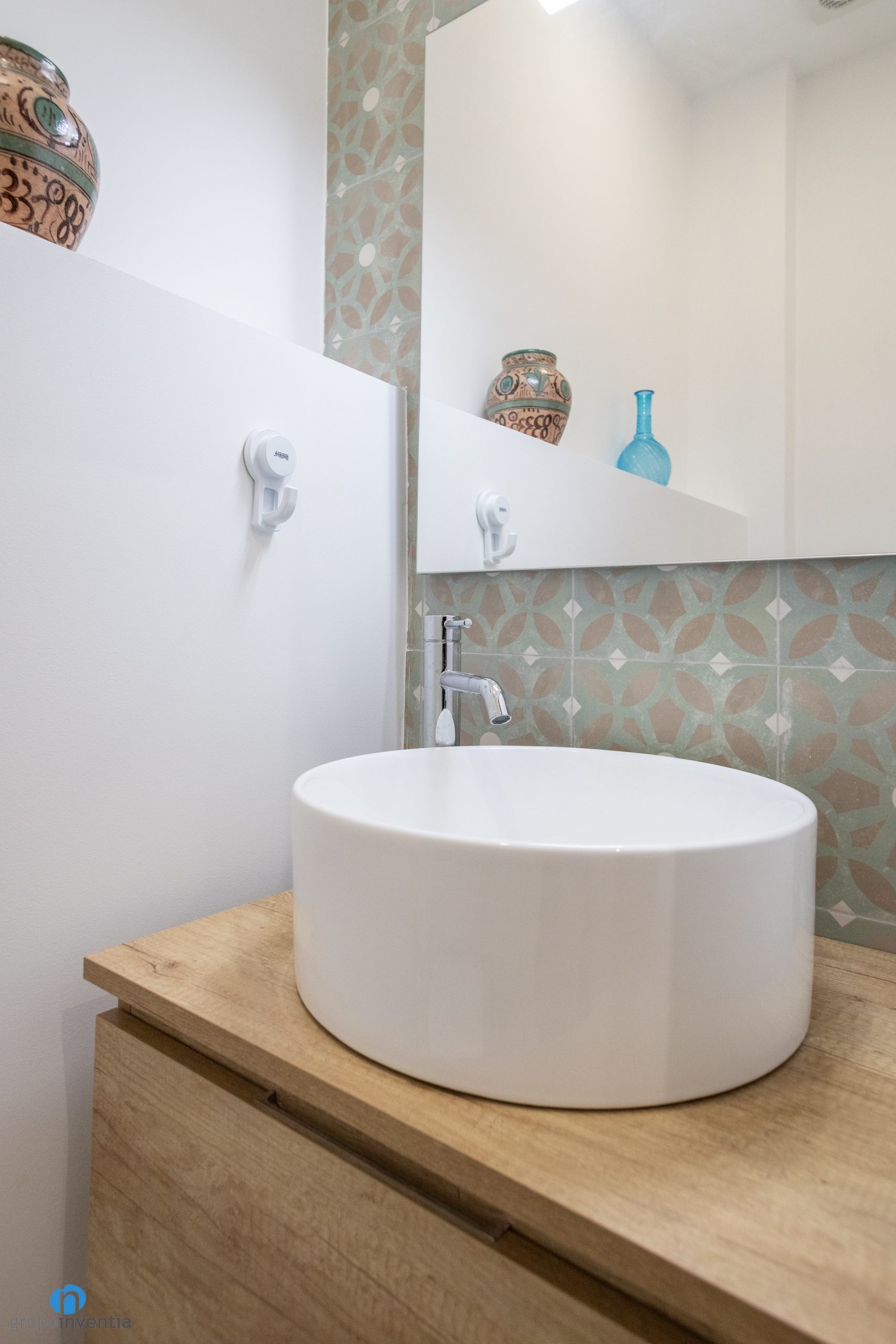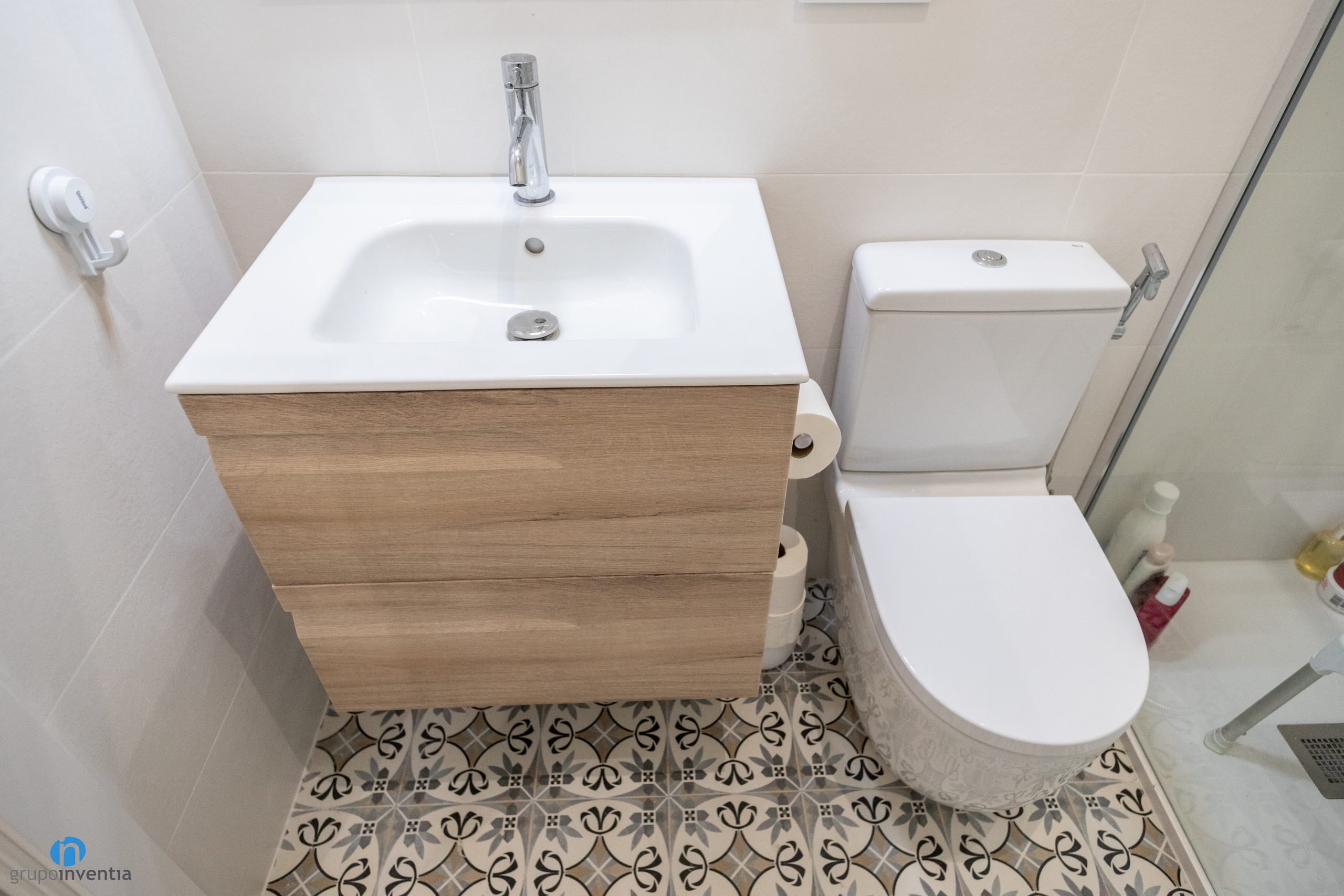 Starting with the cleaning, this has been equipped with a toilet and a circular design sink. An extra daily hygiene space that brings great benefits. On the other hand we have the main bathroom. It also has a new washbasin with storage furniture and a toilet. Add the water area, a shower tray protected by sliding door screens.