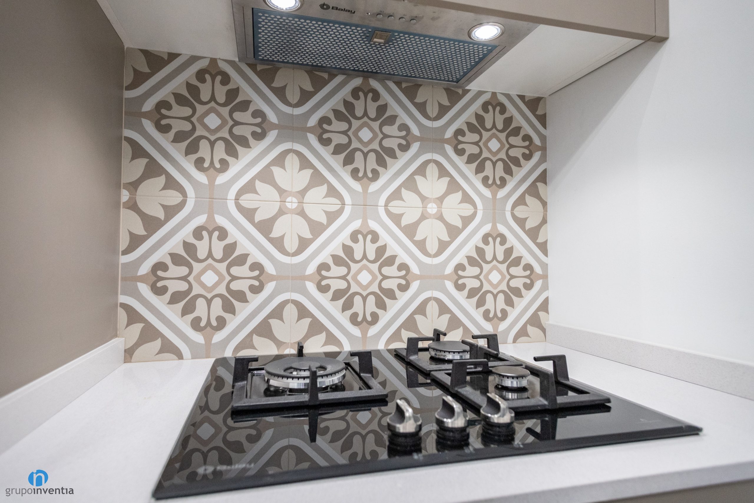 As it is an open kitchen renovation, the image maintains the modern interior design that has been applied to the rest of the house. That’s why neutral tones have been used in kitchen furniture and other new items. For example the kitchen floor is hydraulic type and draws figures in beige and white.