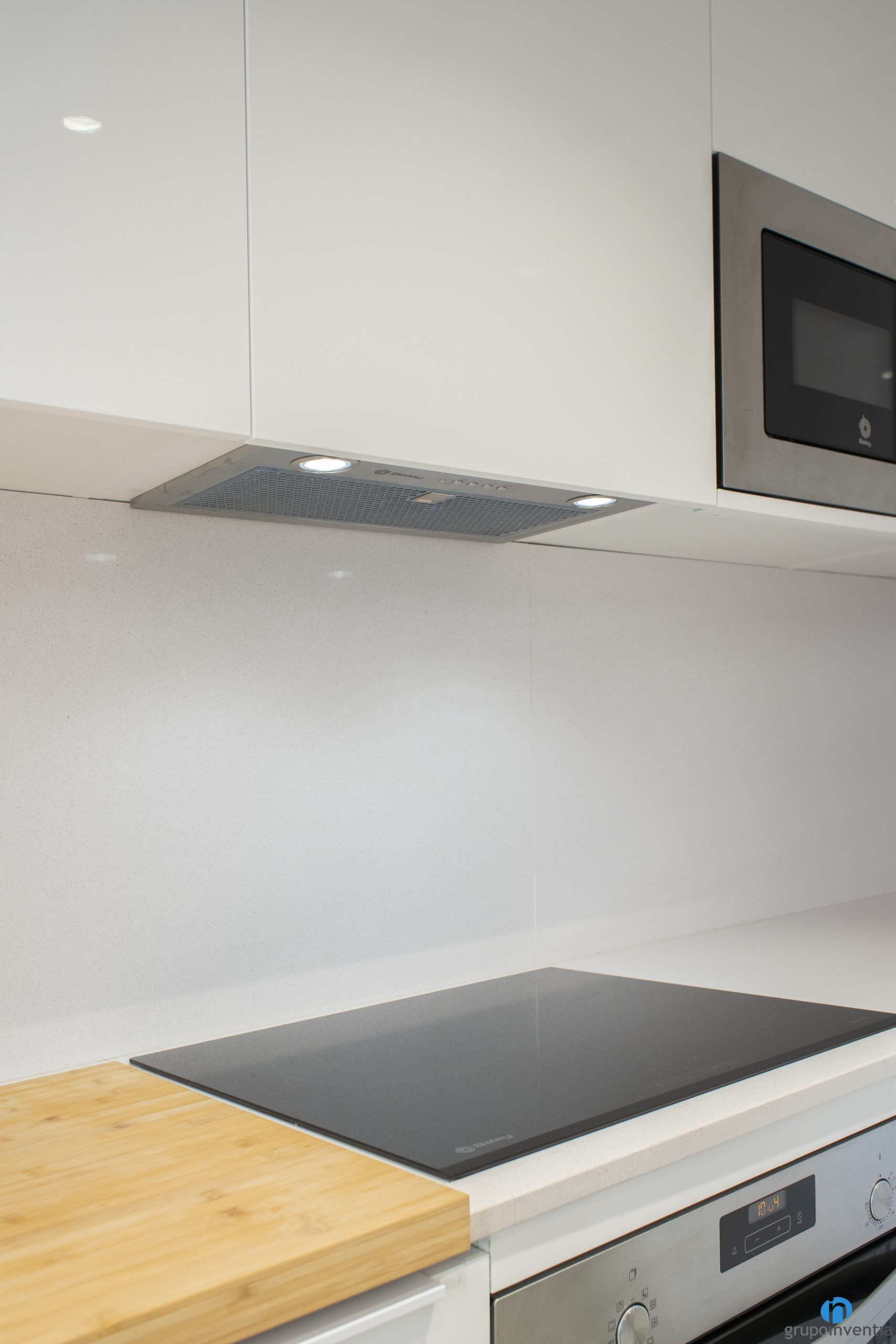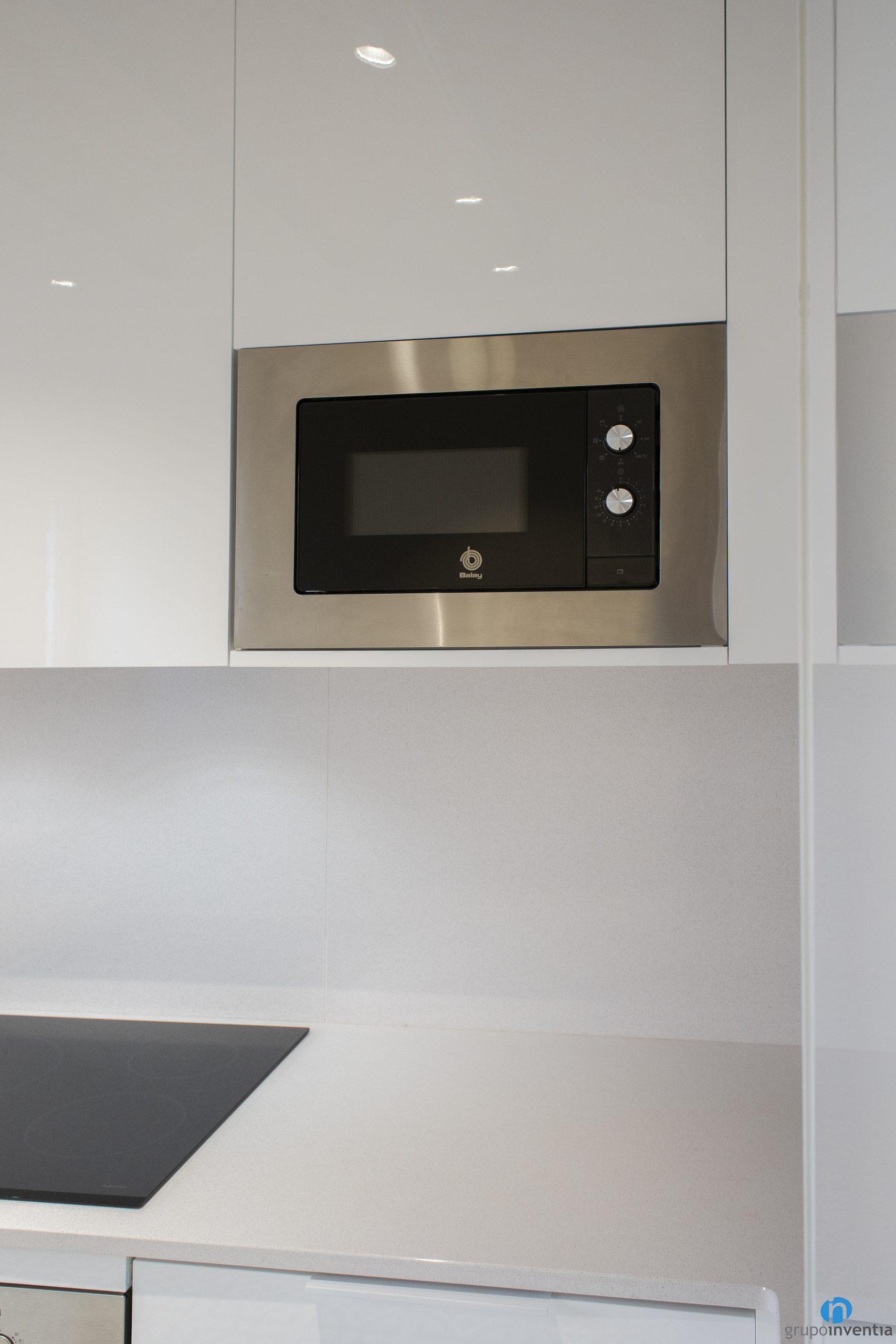 The main counter is elongated and equipped with a glass ceramic plate. At the top it has cupboards for kitchen storage and the microwave. On the other hand, in the lower area we have integrated several appliances. Specifically, it has an oven and a washing machine and a dishwasher that are camouflaged by the cupboard doors.