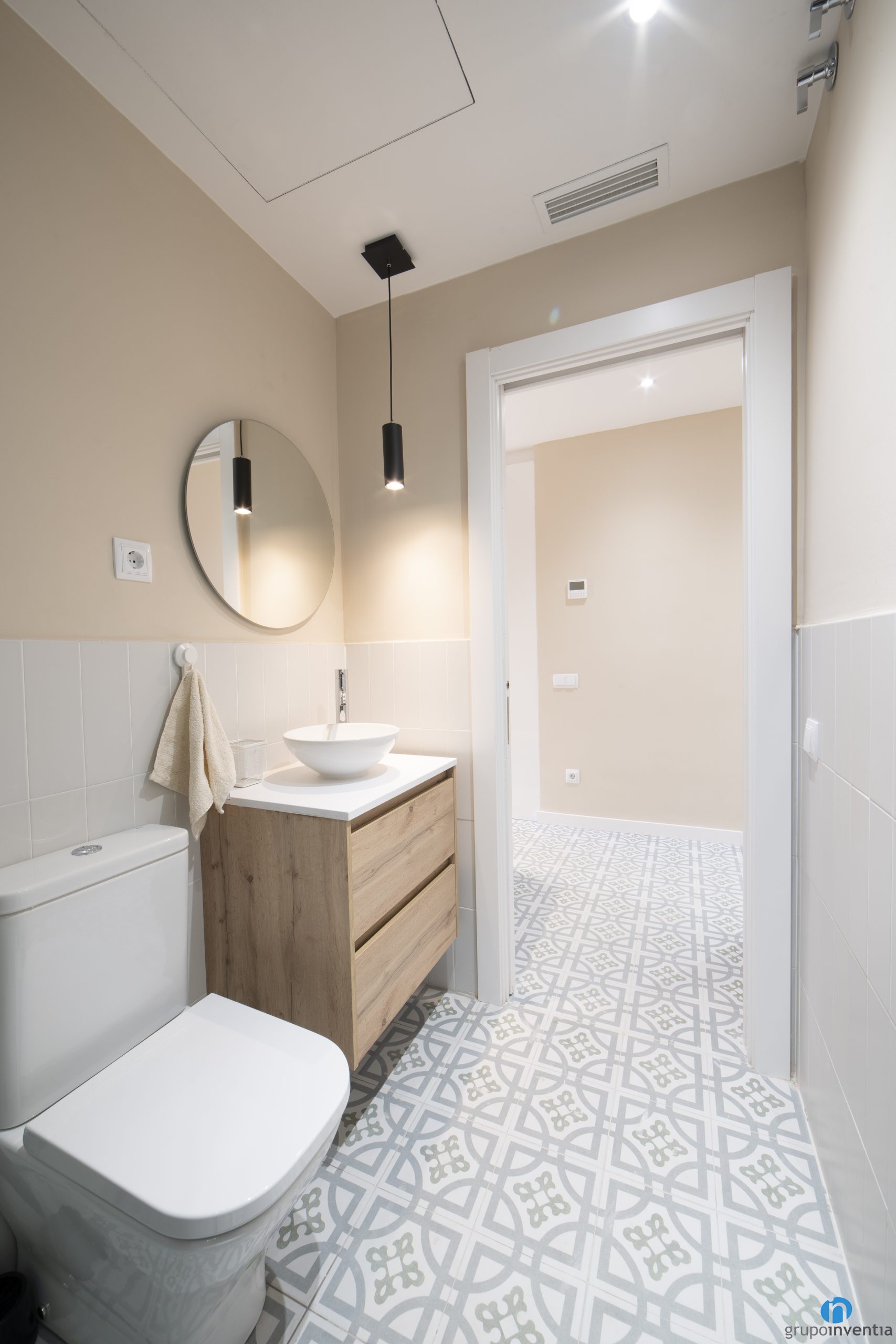 Another space we have updated is the bathroom. The aim has been to achieve a functional cleaning area that offers the best benefits. On the right side we find the new toilet. It is composed of a wooden piece of furniture with two drawers and a washbasin on an oval design counter.