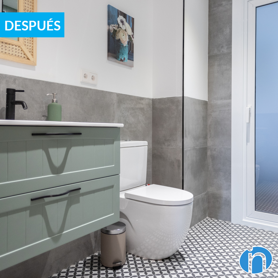 Work has also been done on the new bathroom interior design. They follow the modern and contemporary line, although with personalized and unique elements. In the two bathroom renovations, the walls have been tiled at medium height with neutral-toned tiles. Two hydraulic type floors have been chosen for the new floor, which generate a lot of personality.