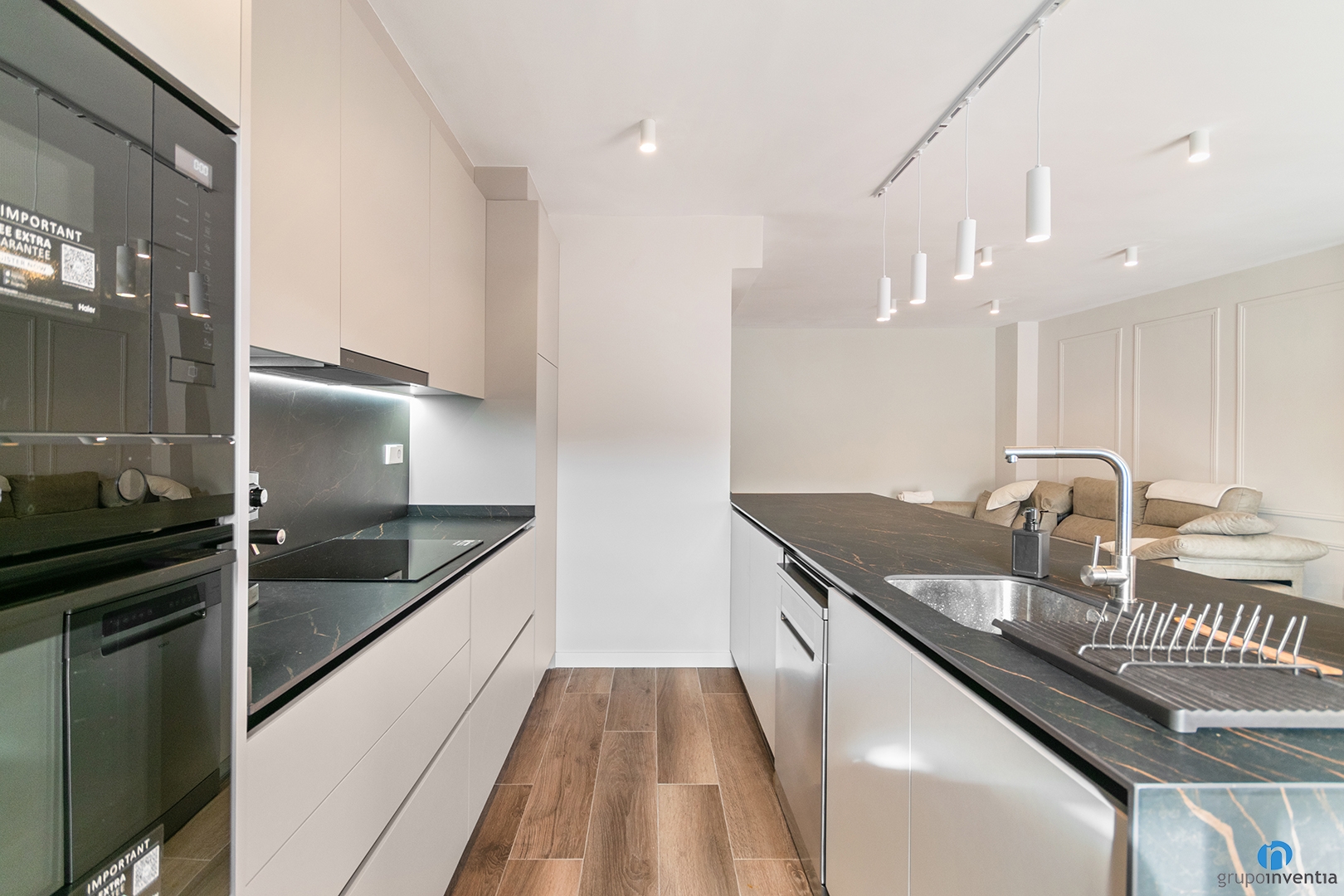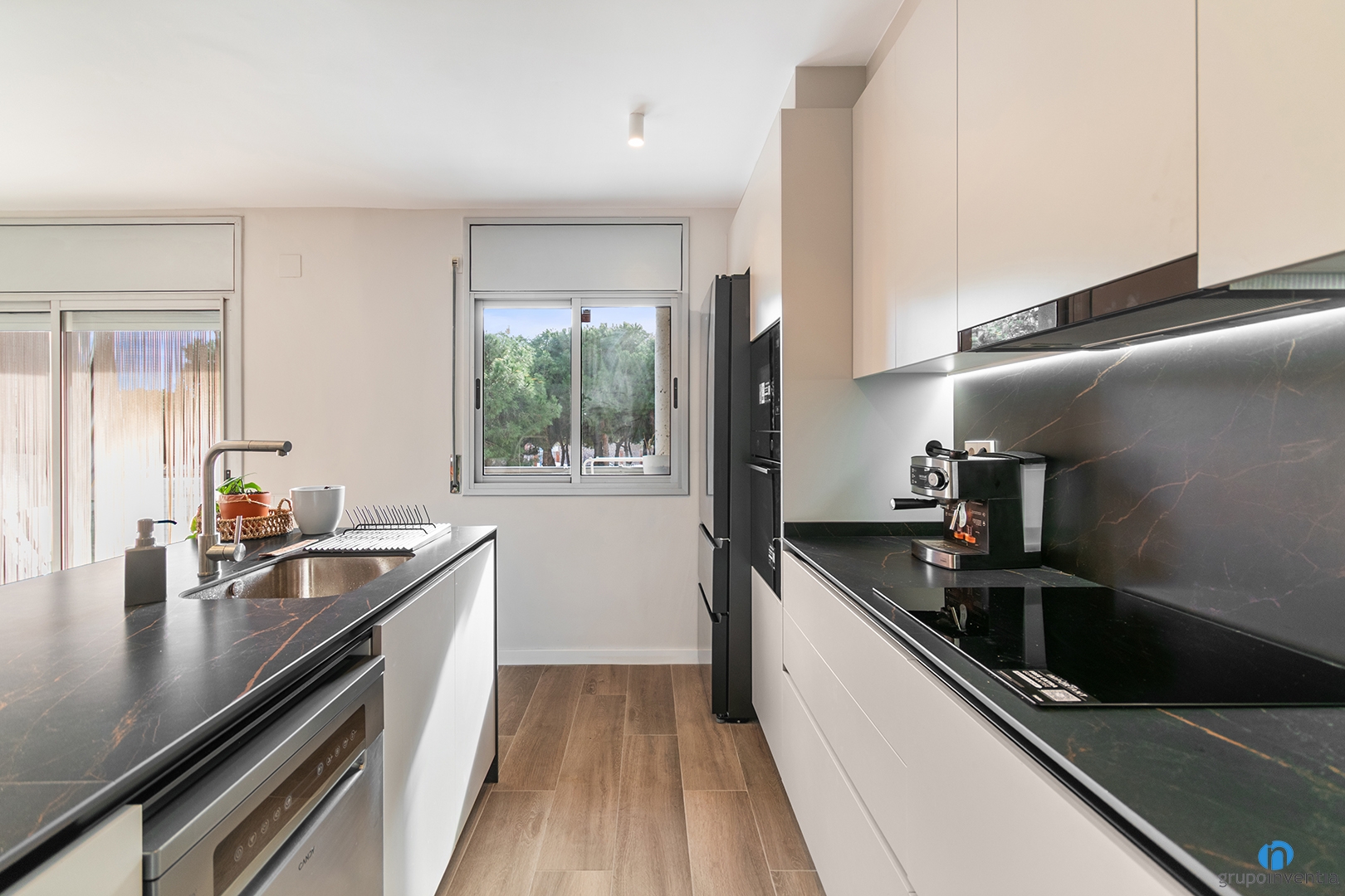 The kitchen furniture is white and combined with black countertops. This contrast adds elegance and personality. It is a modern and functional solution, common in our renovations in Badalona.