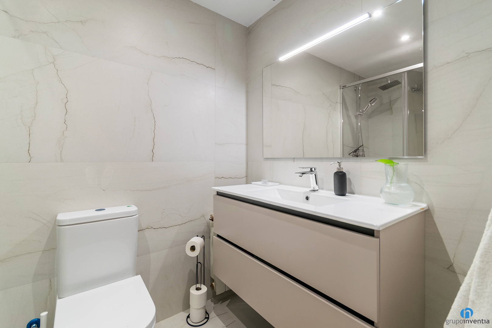 For the new interior design, we selected white marble-effect tiles. This material enhances brightness and delivers an elegant appearance. The same finish was used on the flooring, creating visual continuity and a greater sense of space.