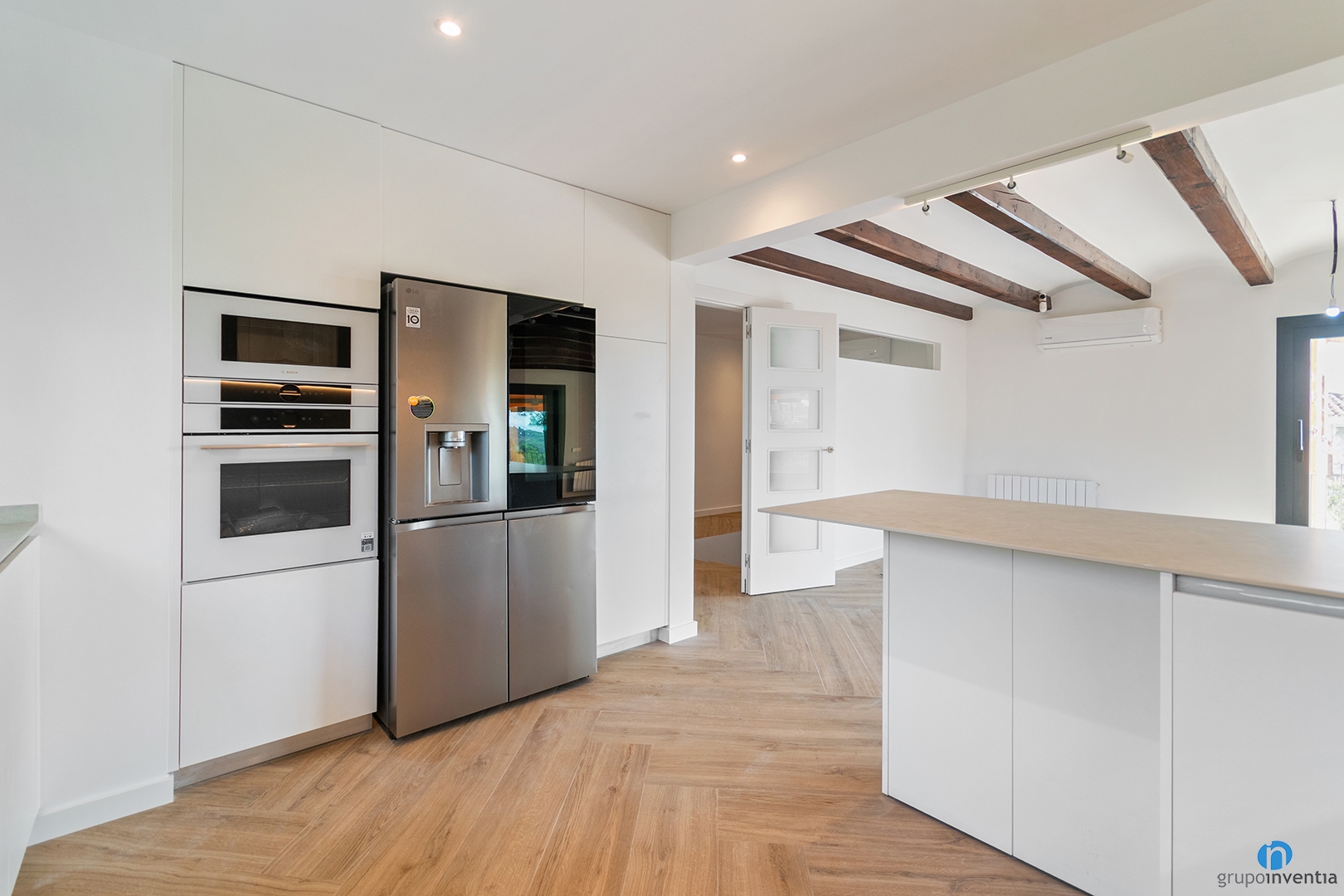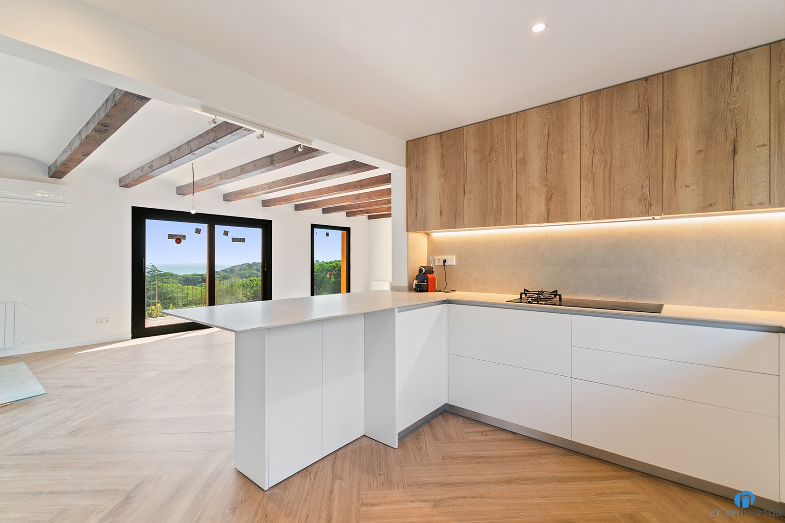 In this full renovation in El Maresme, the kitchen is one of the main highlights. It is an open and bright kitchen with a U-shaped layout. This arrangement connects seamlessly with the dining room, encouraging interaction during meals.