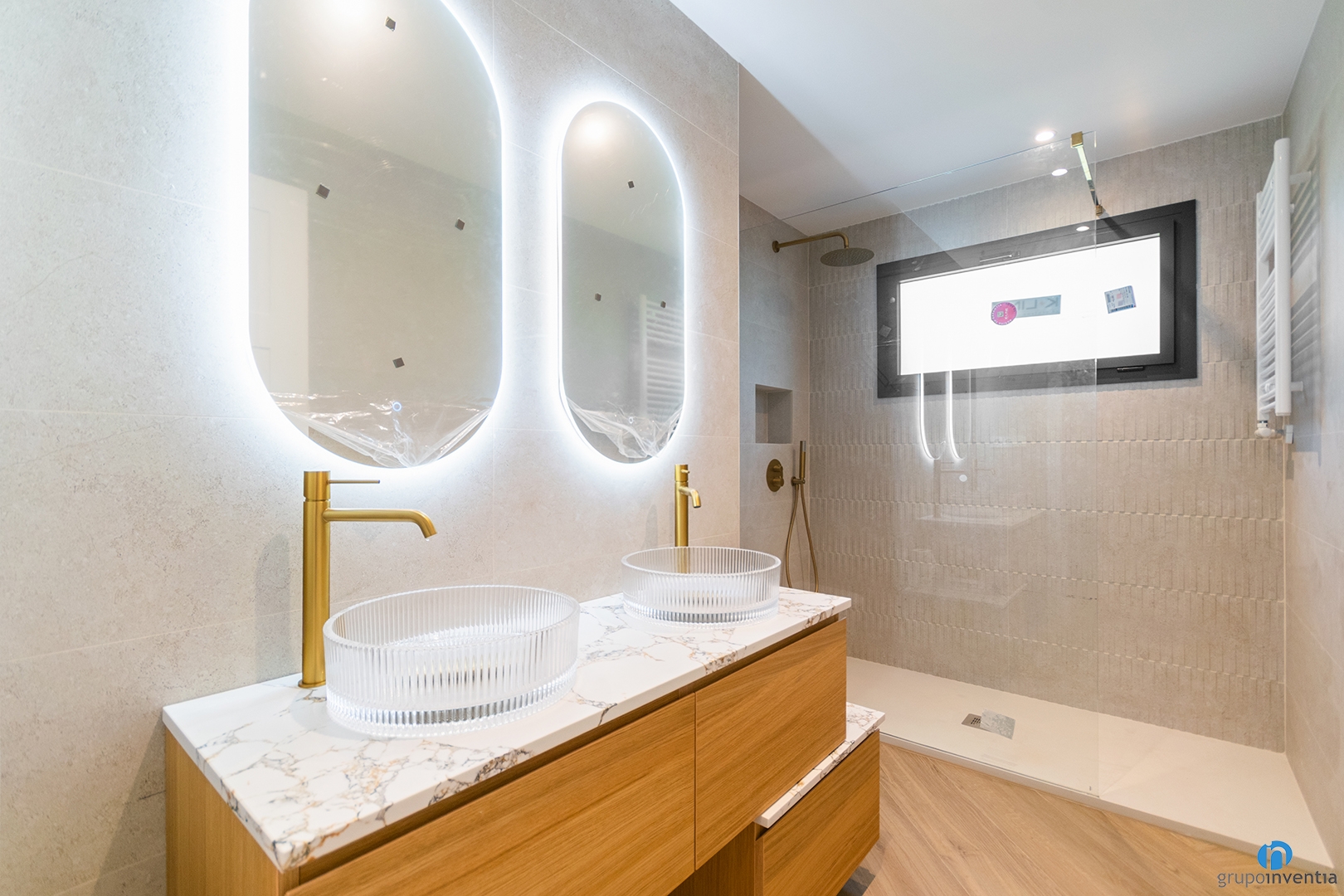 In the night area, there is a bathroom with a double sink, gold taps, and translucent glass basins. This neutral yet sophisticated design adds comfort for daily use.