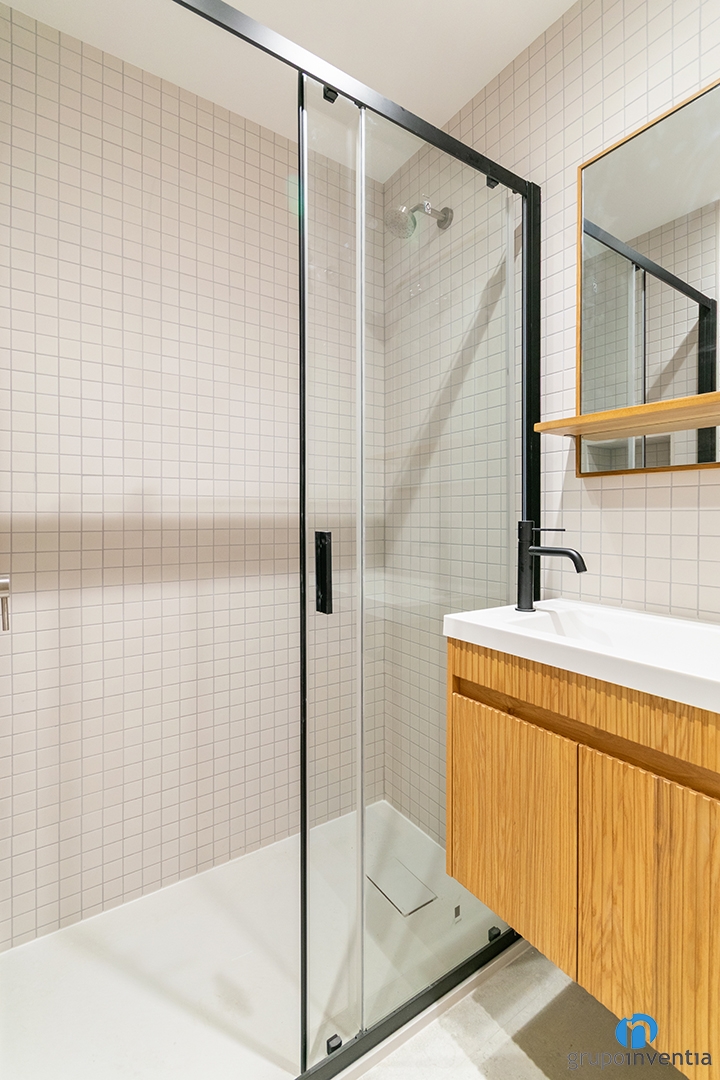 The new bathroom renovation in Barcelona features a modern and functional design. The space includes a toilet, a shower tray and black finish fixtures. Clean lines create a contemporary and elegant look.