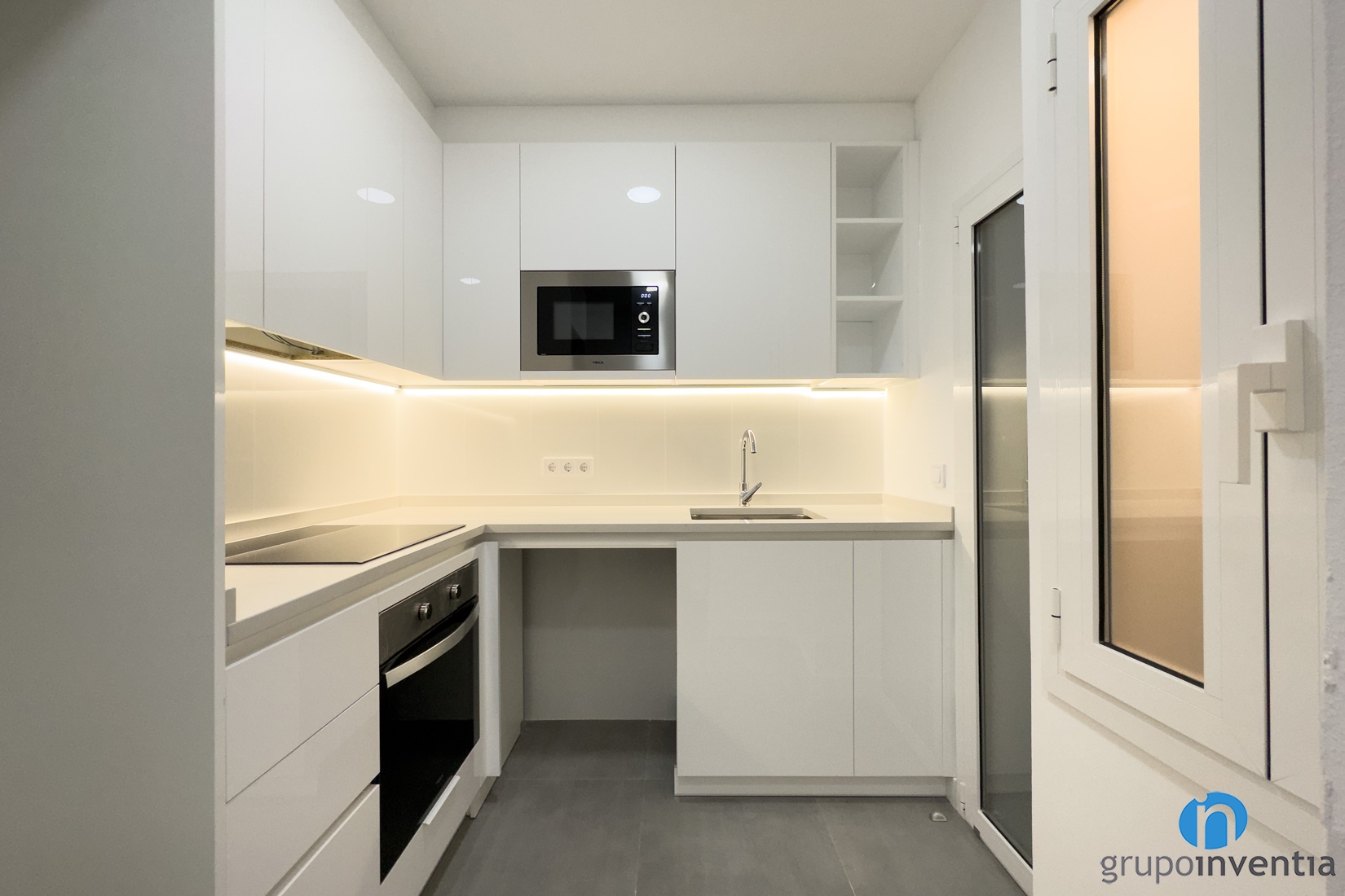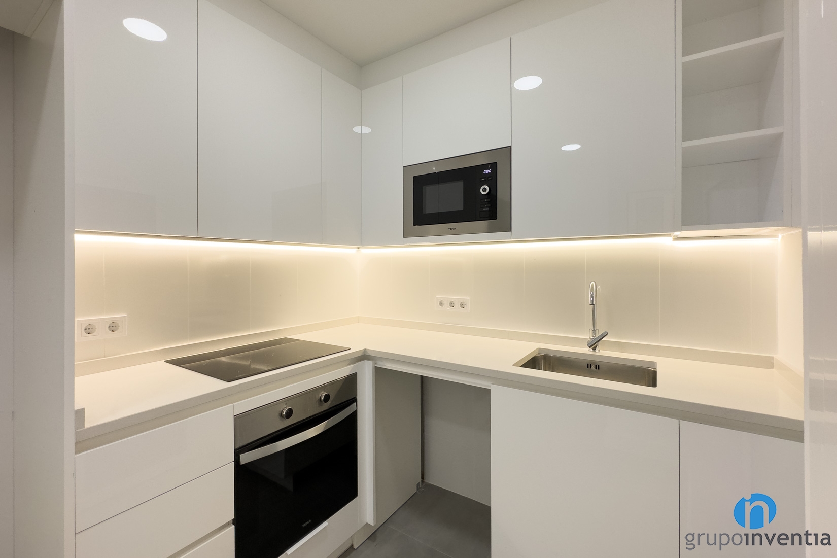 In addition, it has a single sink. Both in the lower and upper part there is storage capacity and also custom-made holes to integrate more appliances. Specifically, a dishwasher in the lower part and a microwave in the cabinets anchored in the upper part.