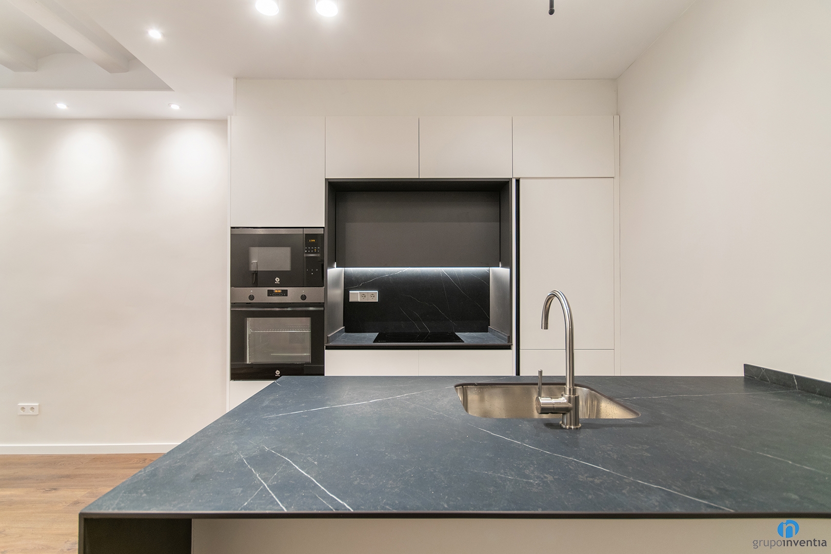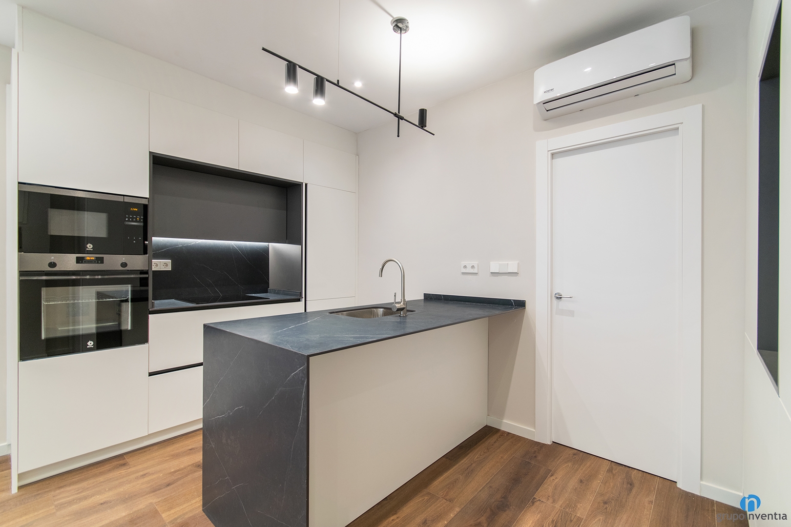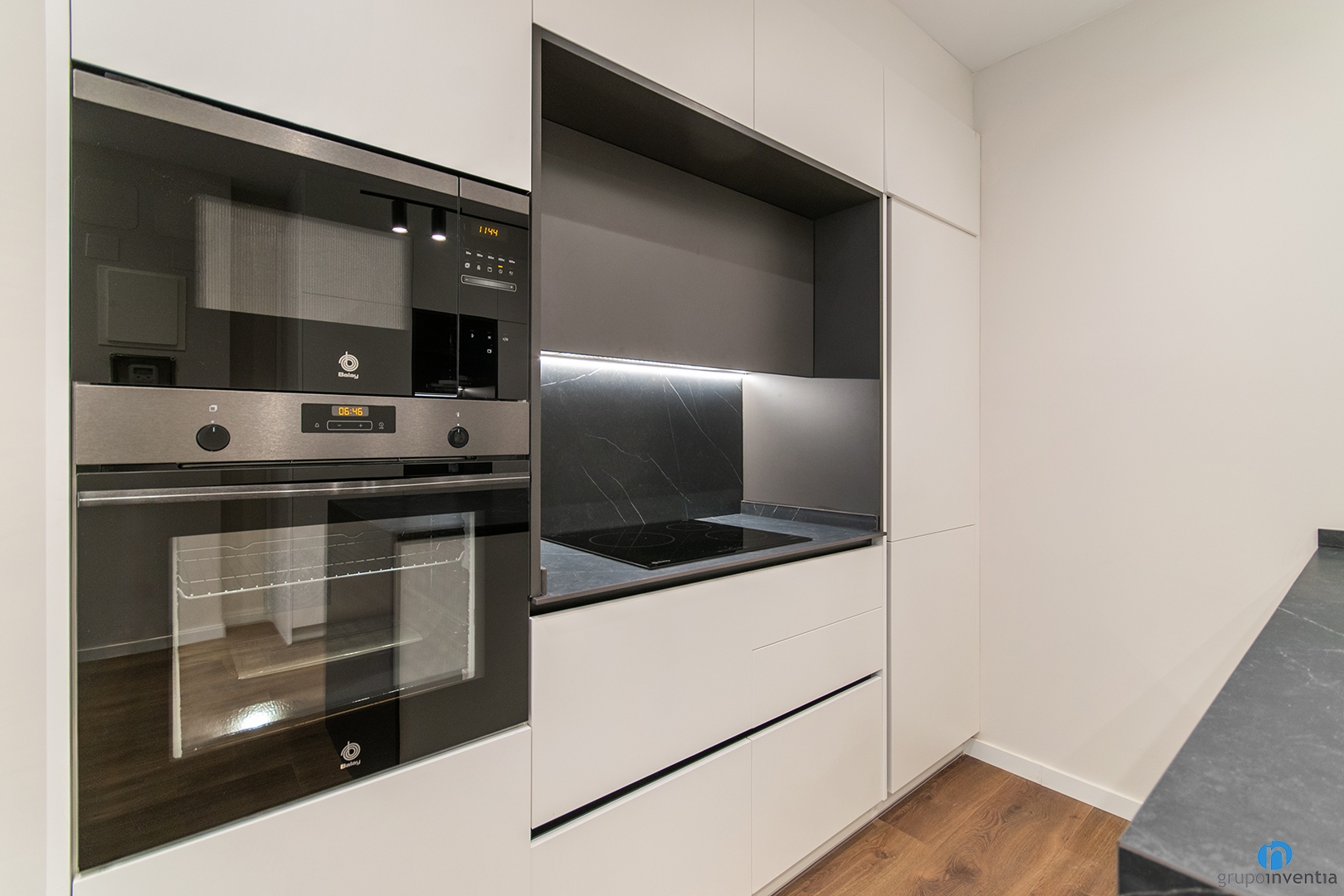 We renovated an open kitchen with two fronts. On the left side, we integrated the oven and microwave, keeping a clean and functional design. Next, we installed a countertop with an induction hob and upper and lower cabinets to maximize storage.