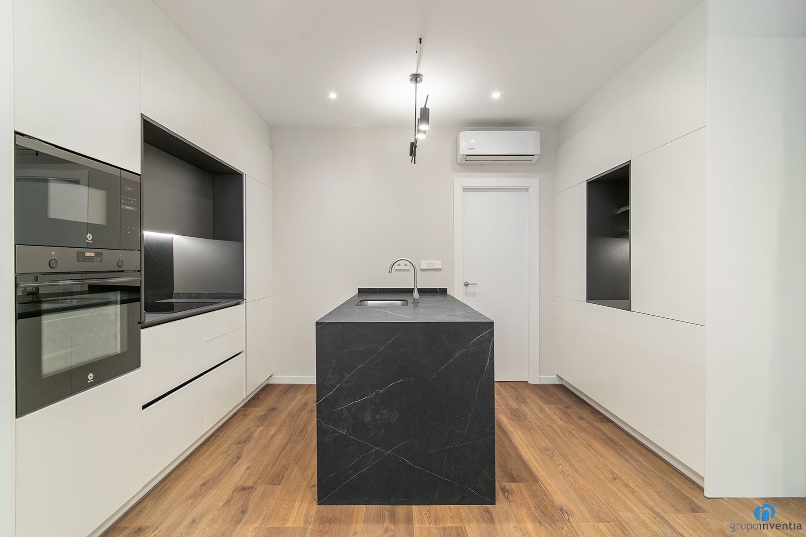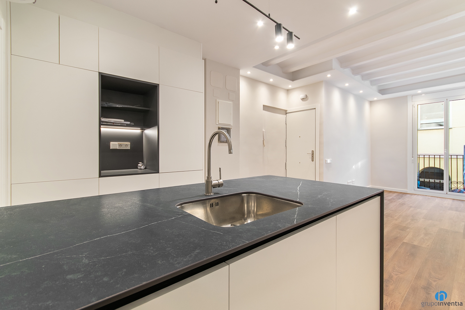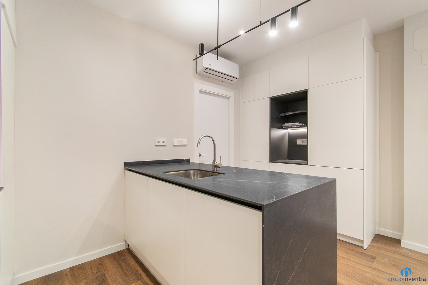 We renovated an open kitchen with two fronts. On the left side, we integrated the oven and microwave, keeping a clean and functional design. Next, we installed a countertop with an induction hob and upper and lower cabinets to maximize storage.
