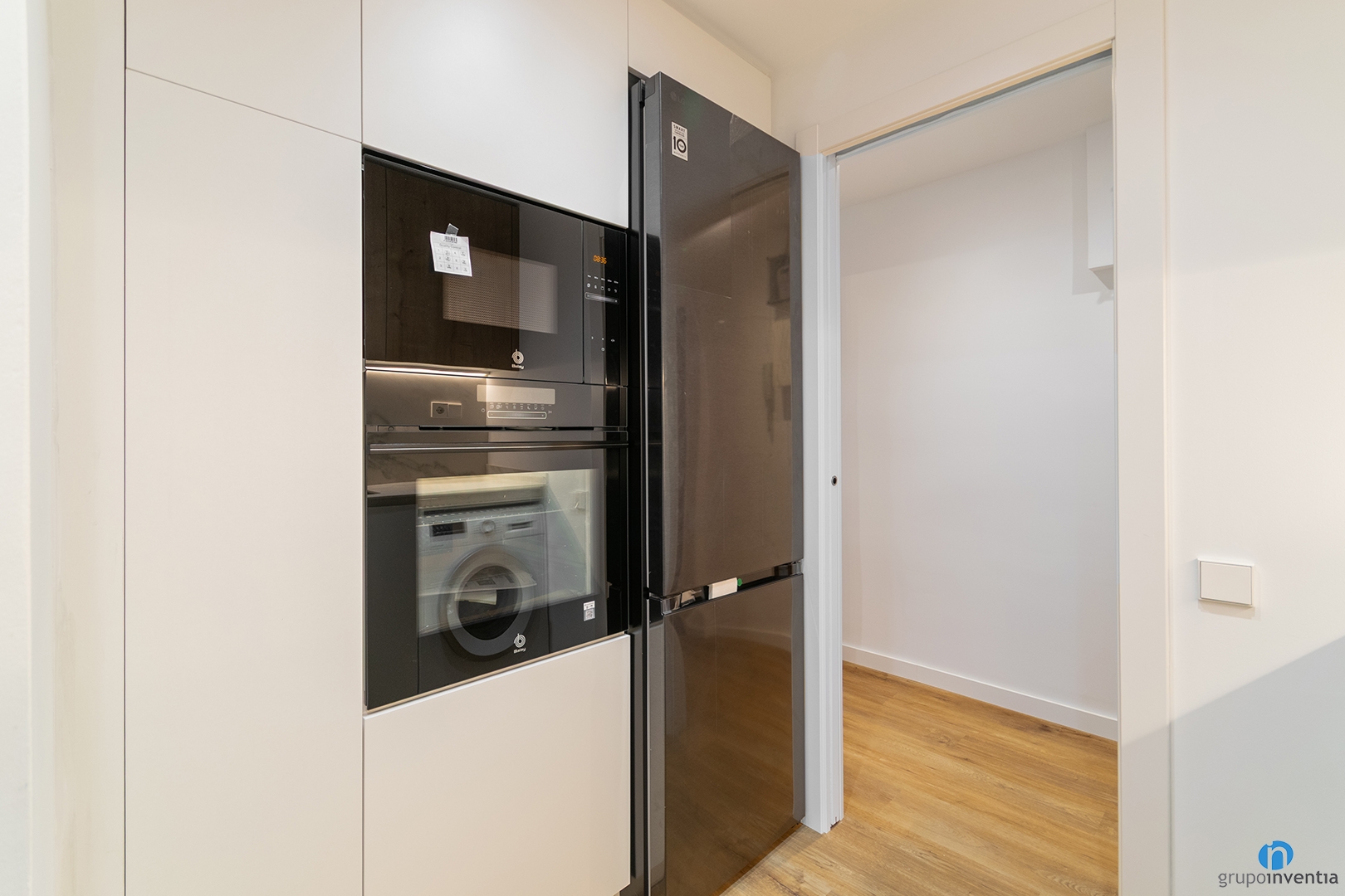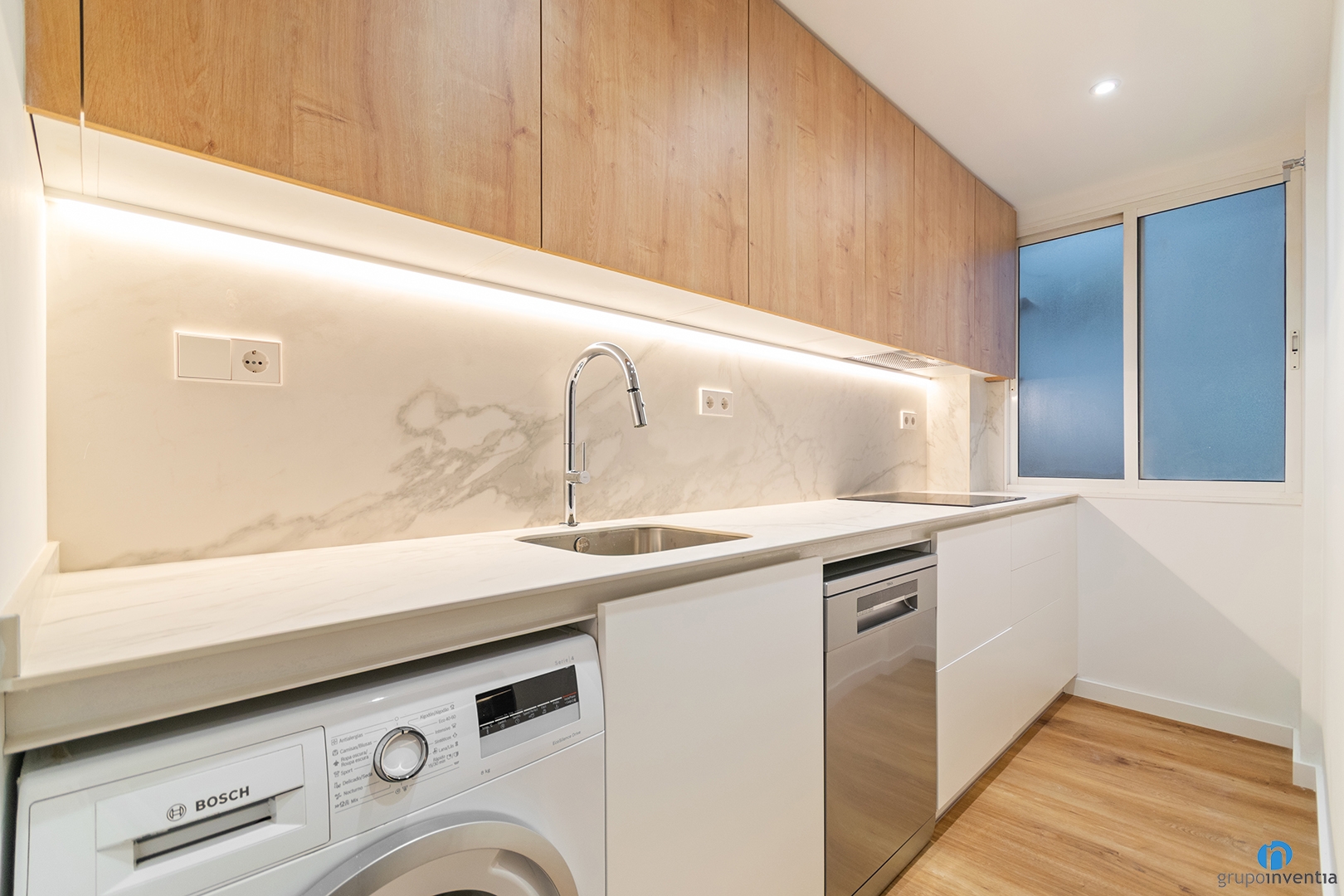 The kitchen renovation was carried out in an independent room accessed through a sliding door. The layout is linear with a long countertop that integrates the sink and the cooking area. Storage capacity is available along both the upper and lower cabinets. The washing machine and dishwasher are fully integrated.