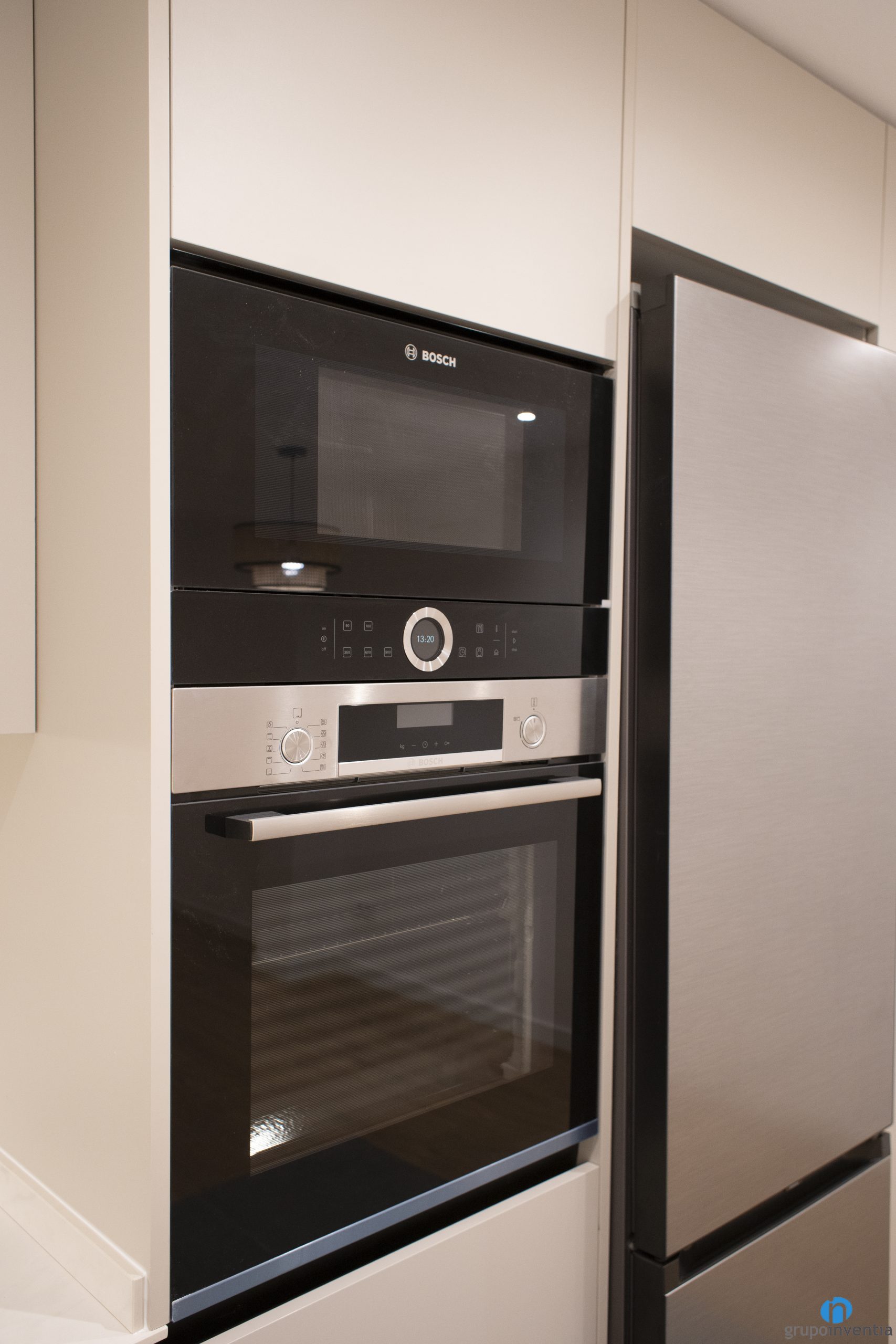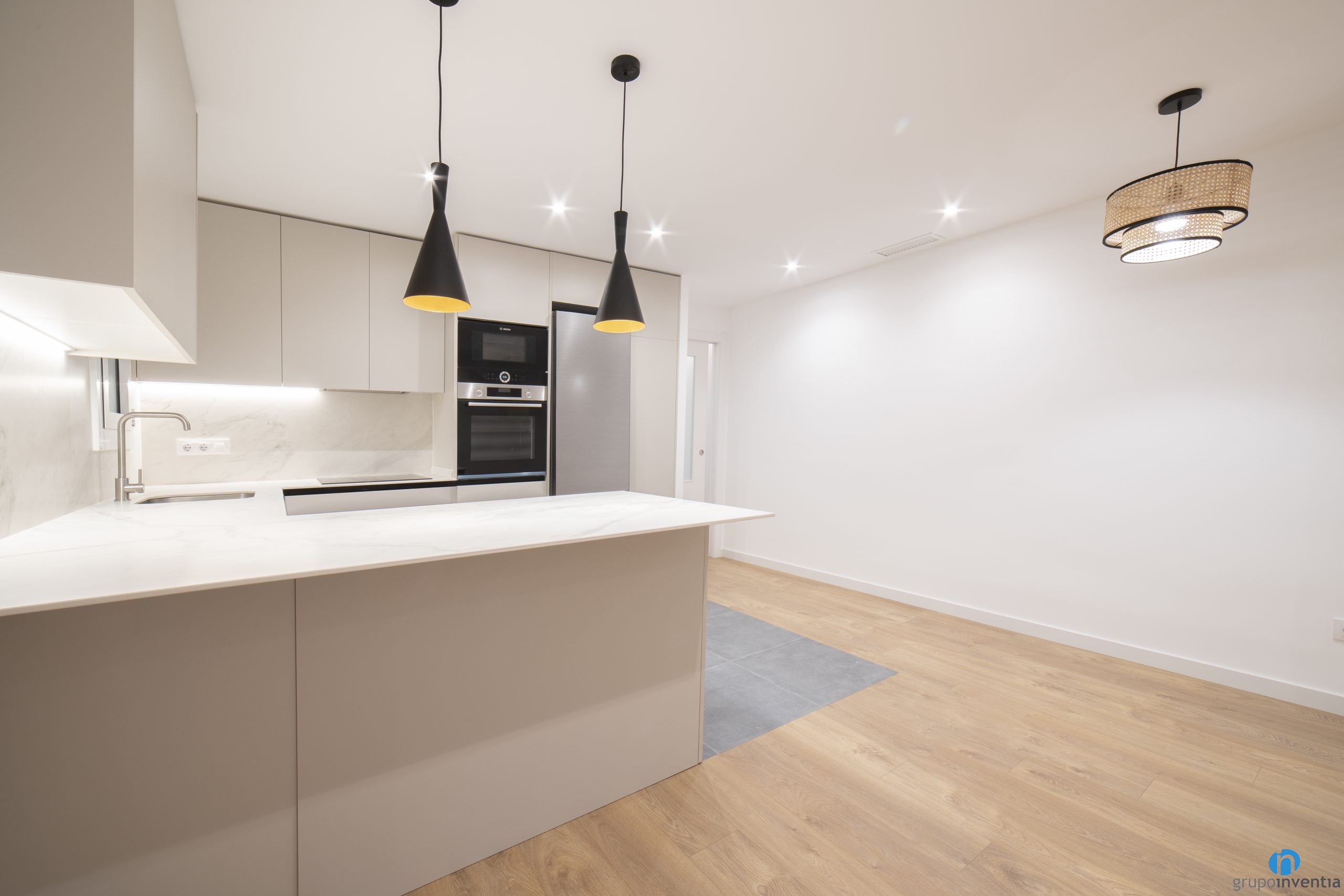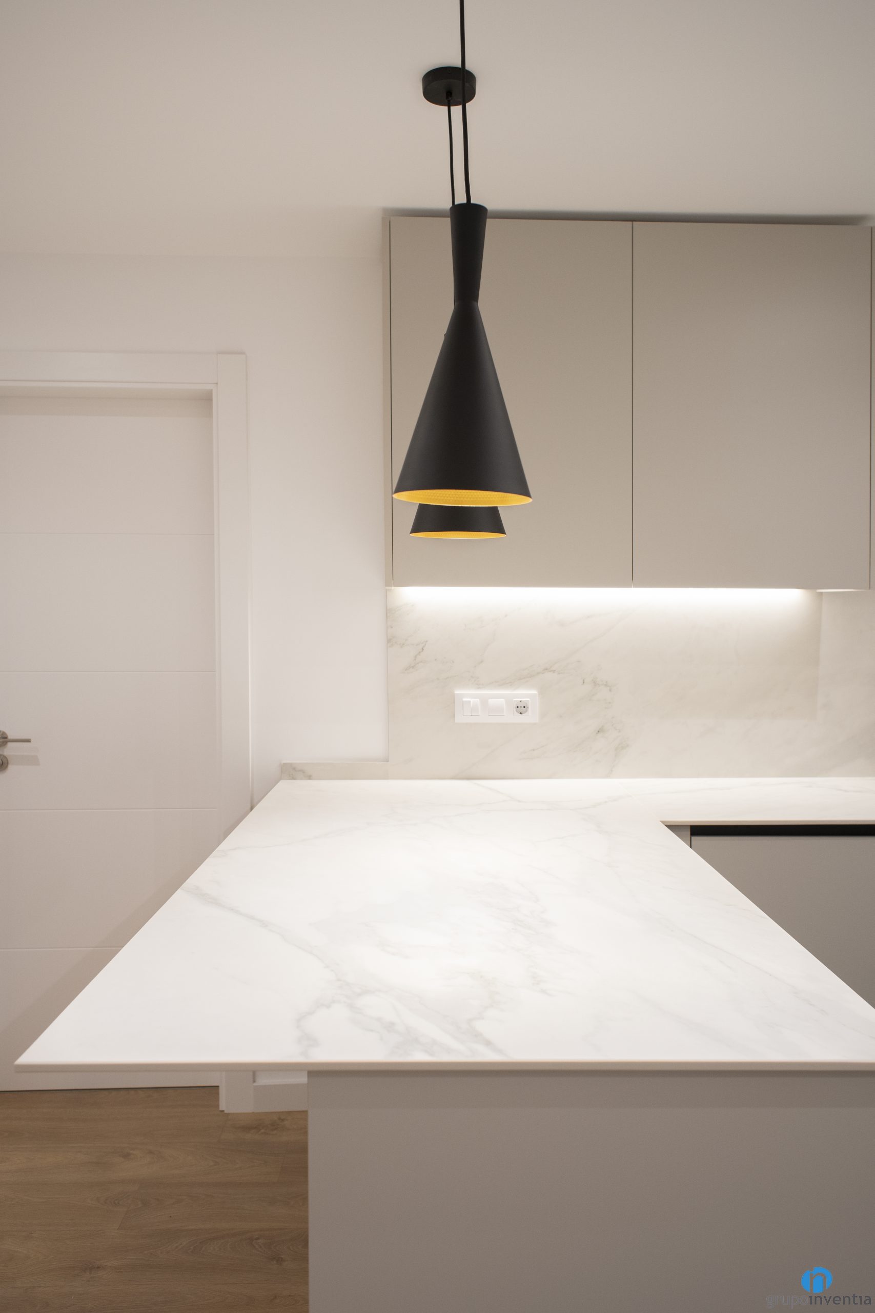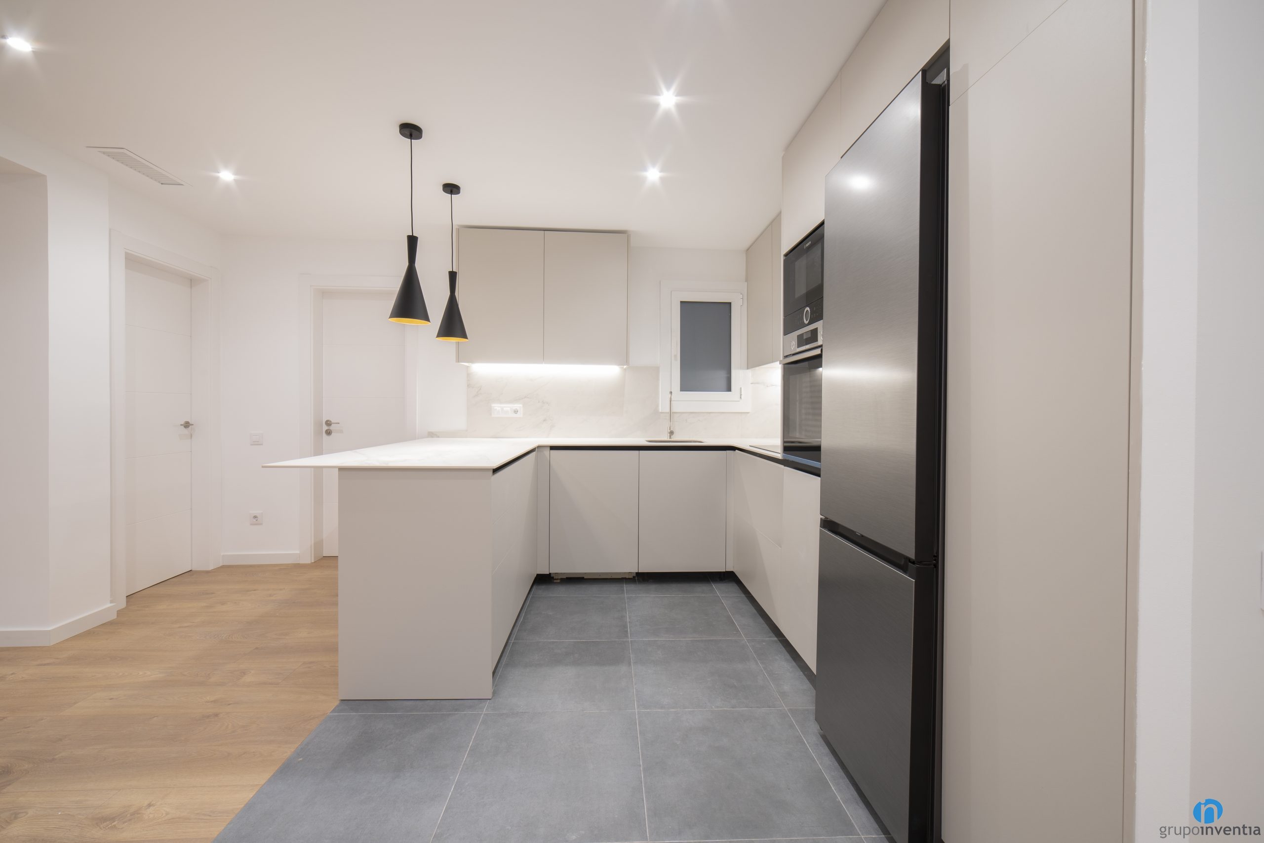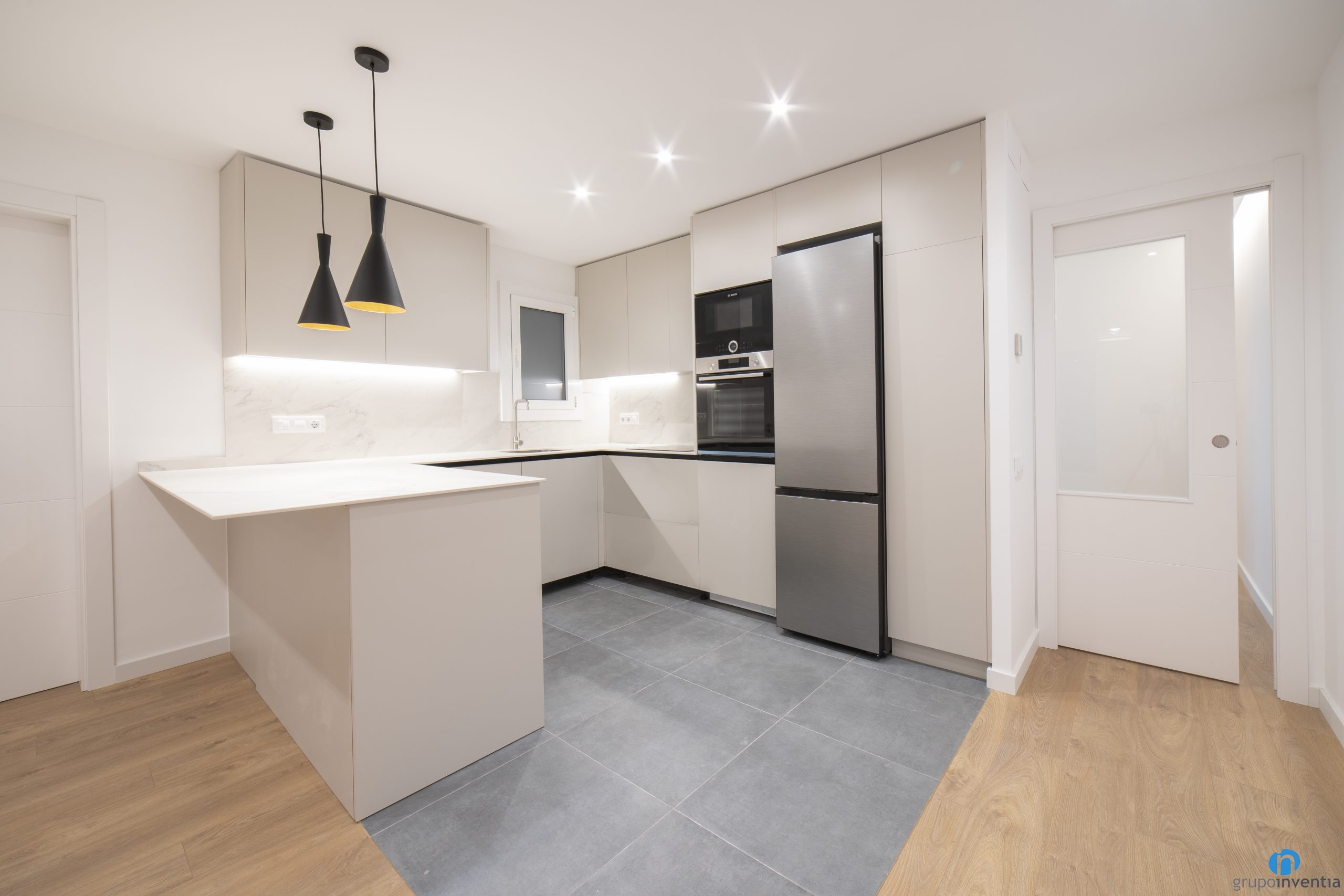 The new kitchen adapts very well to the new style of the house. It is an open kitchen with white furniture and a gray sandstone floor. It has a very functional U-shaped layout and offers a breakfast counter space on the left side. In addition, it has new top brand appliances.